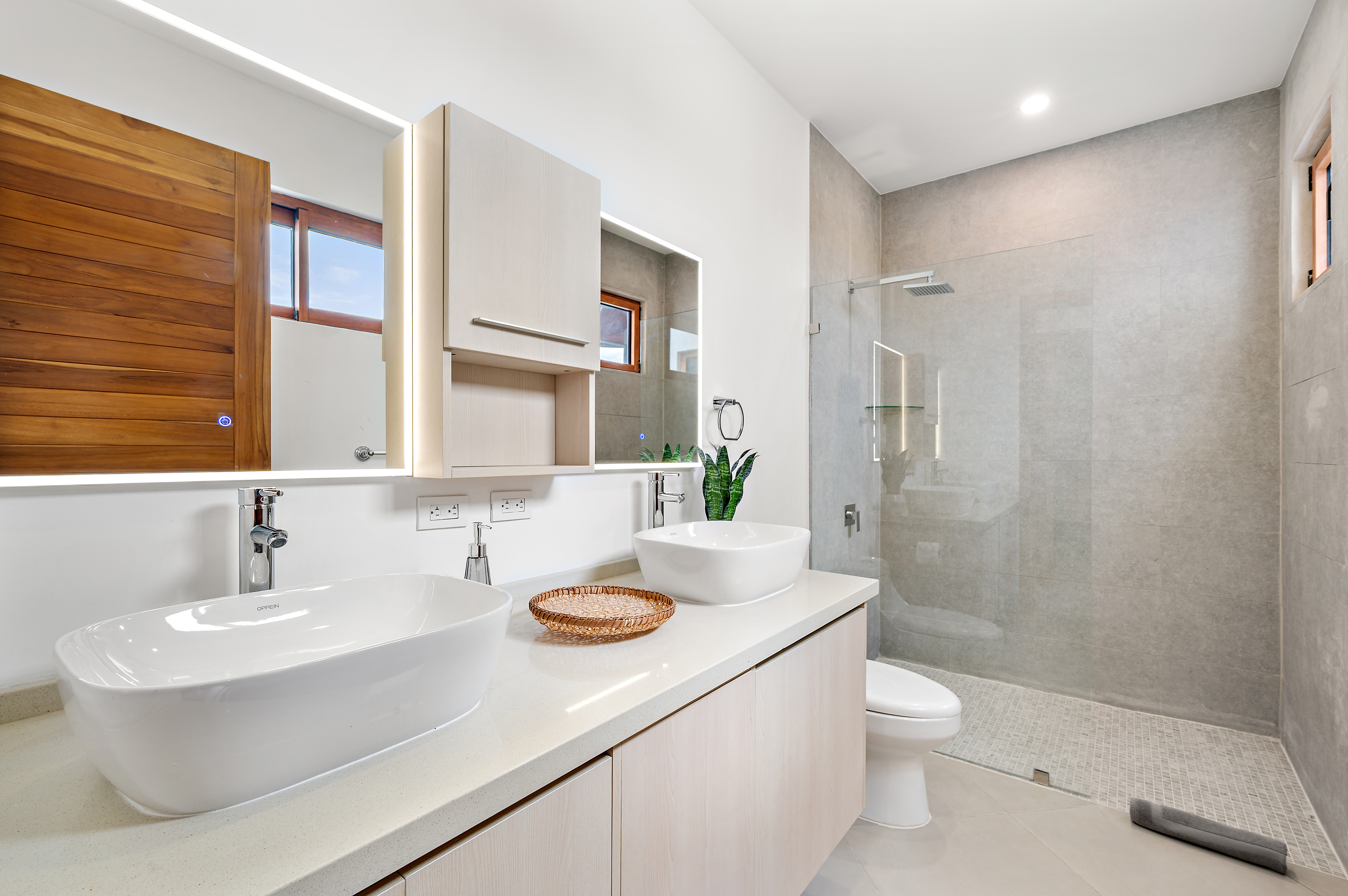 - Luxurious primary bathroom with oversized walk-in shower and dual quartz vanities