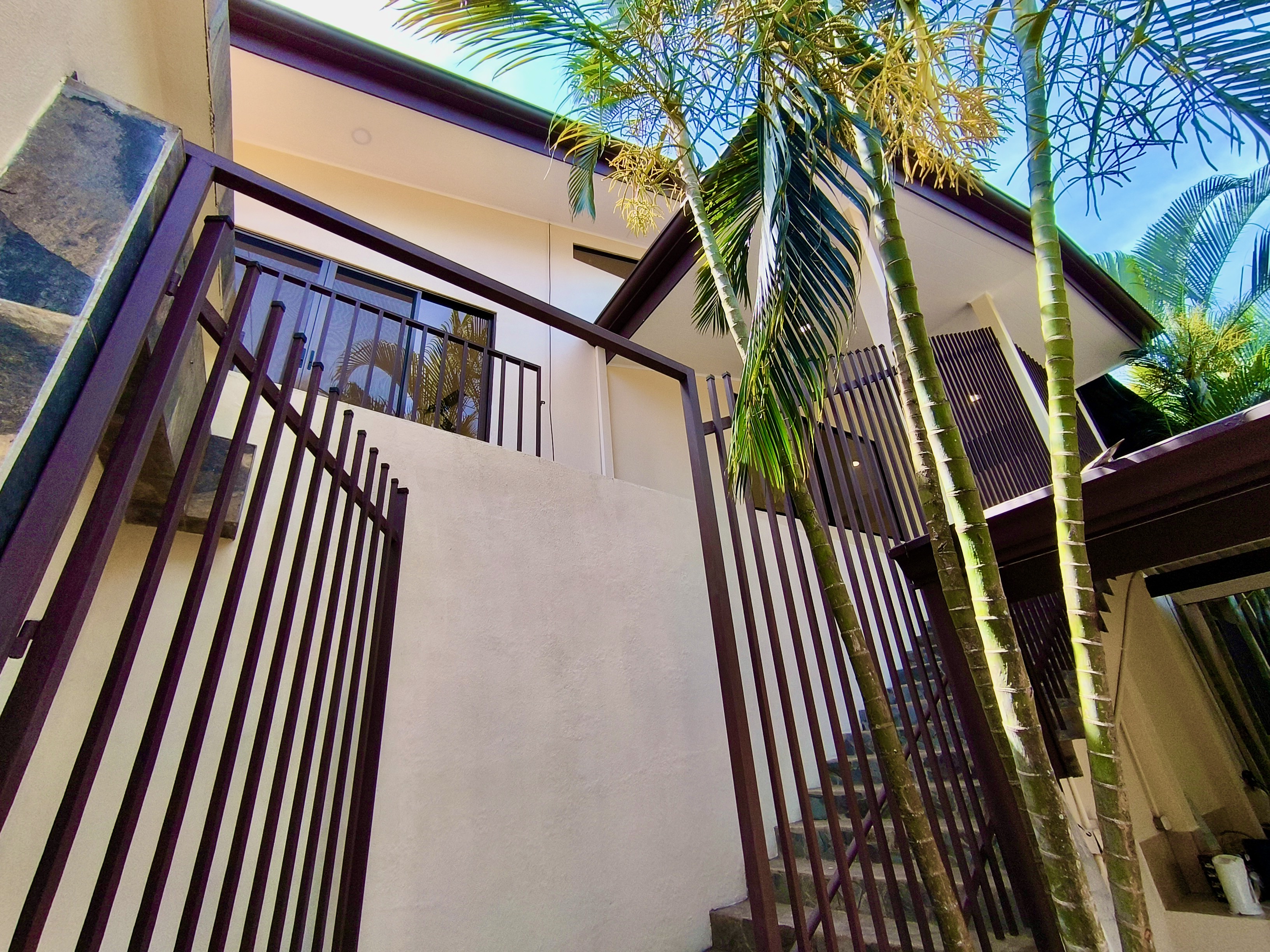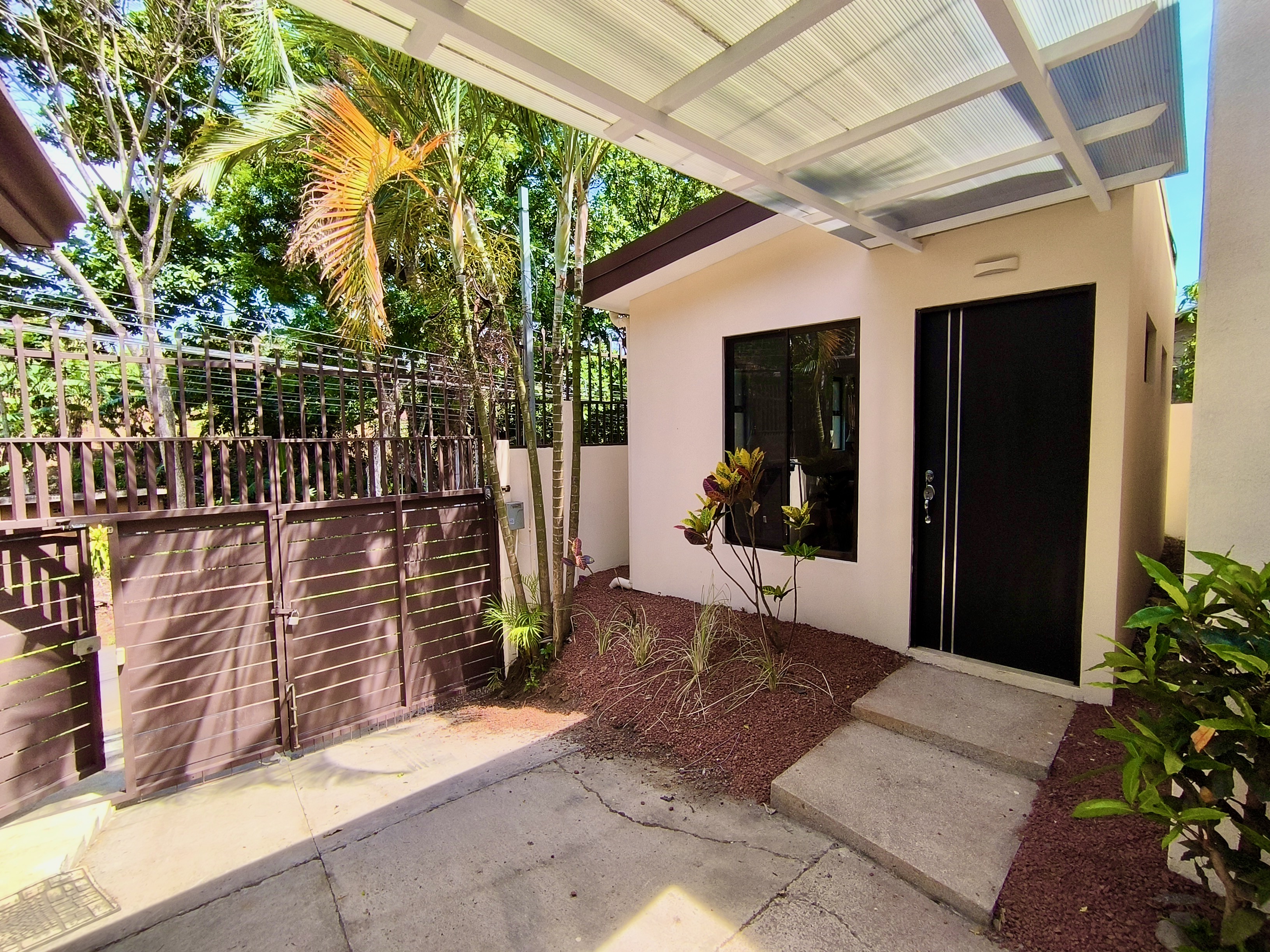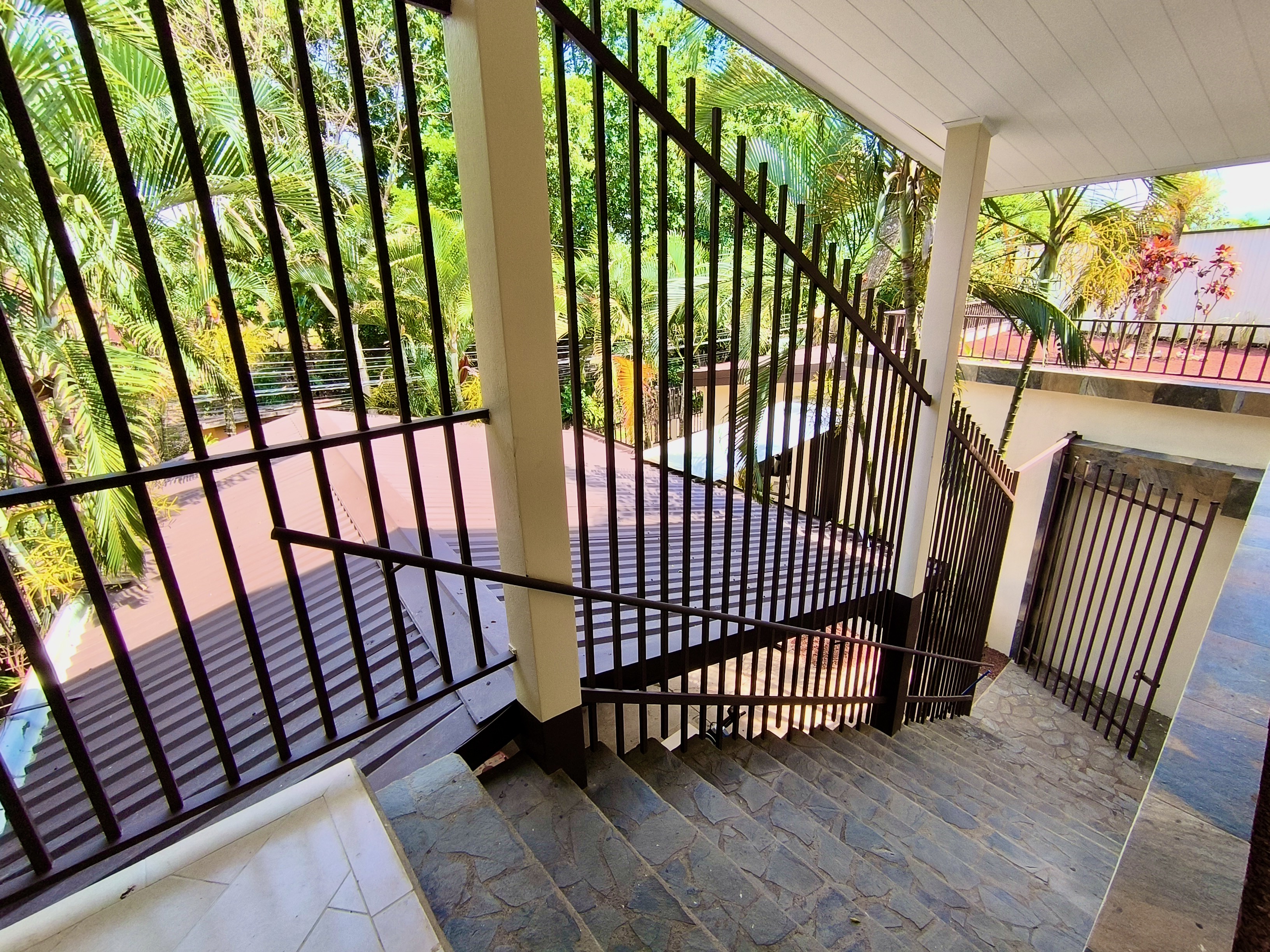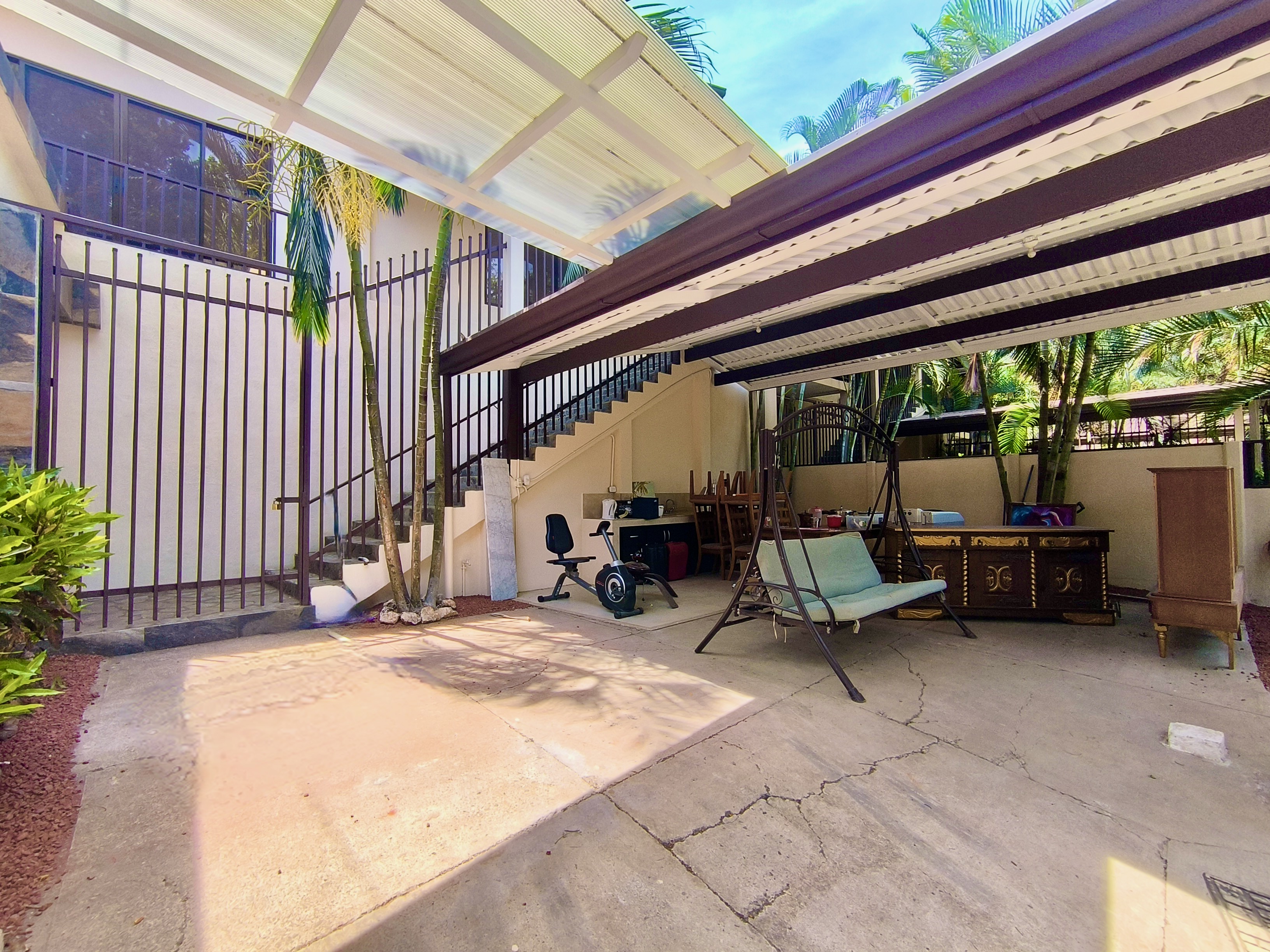 Access to the property is through an electric gate. After parking your vehicle under the carport, you reach the house via a wide staircase.