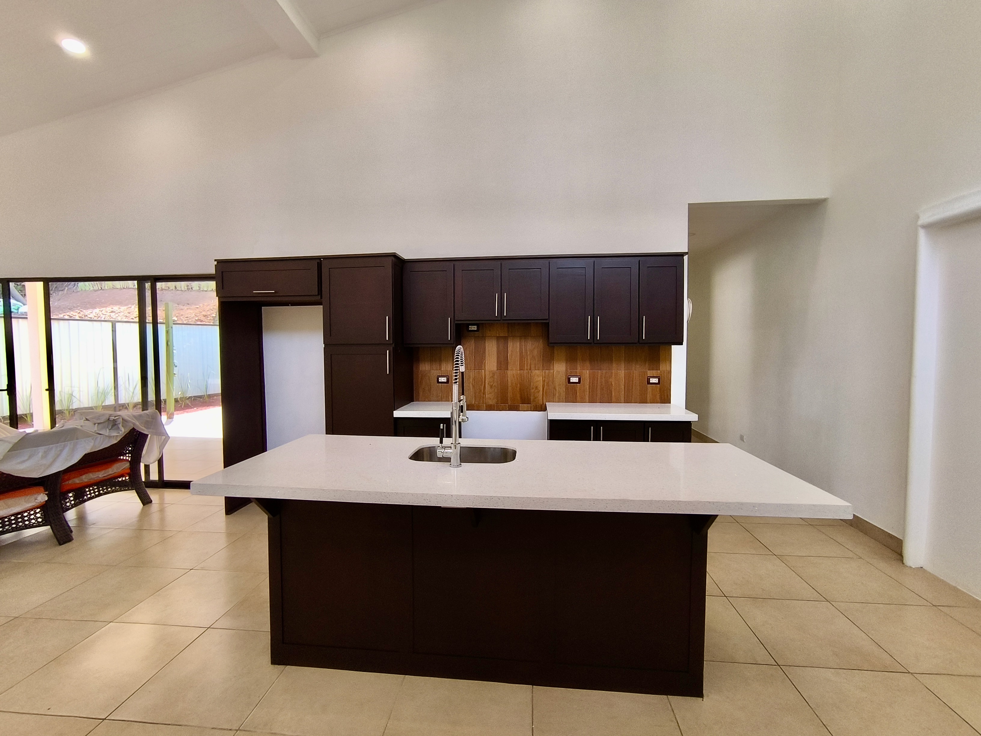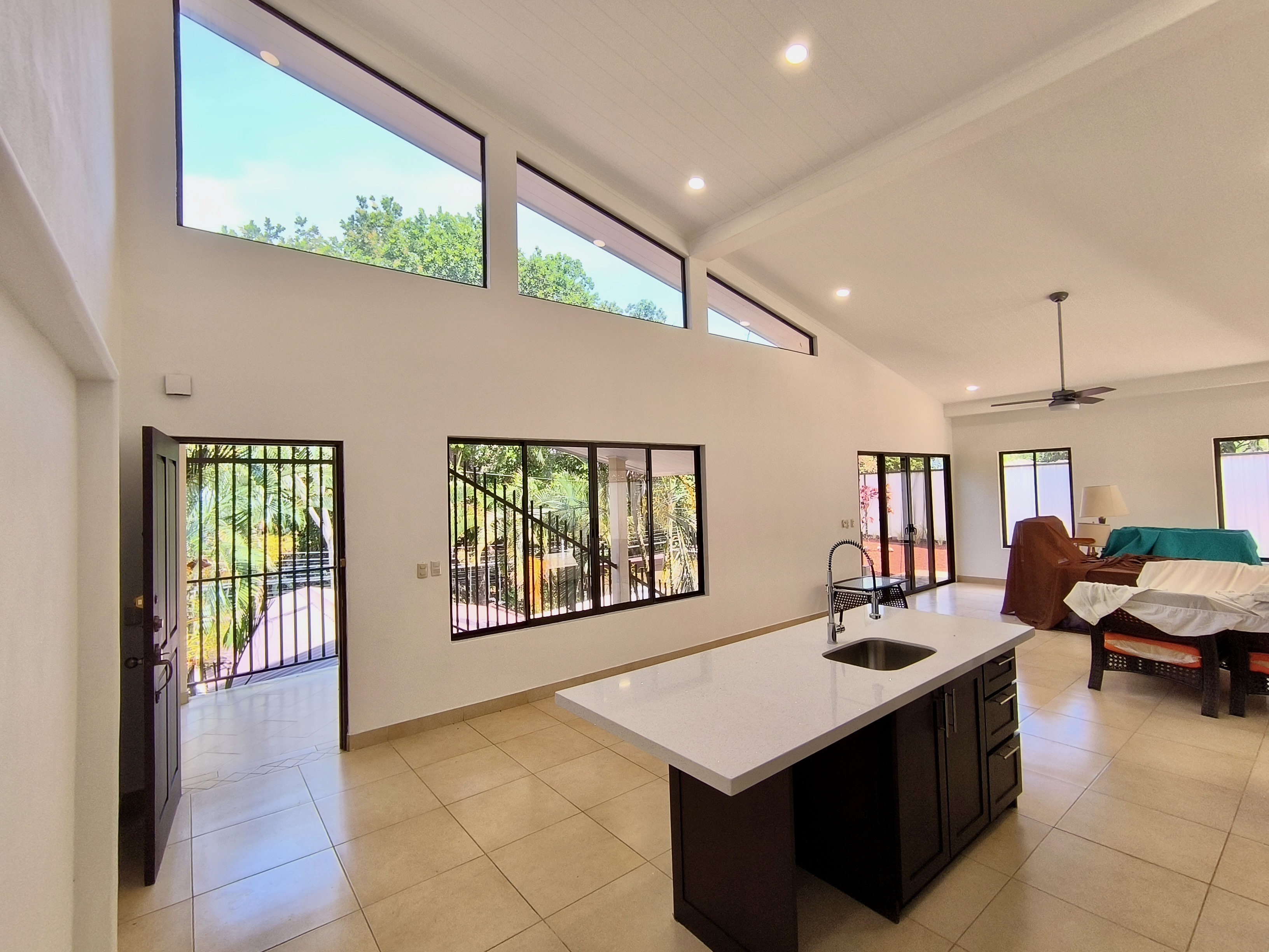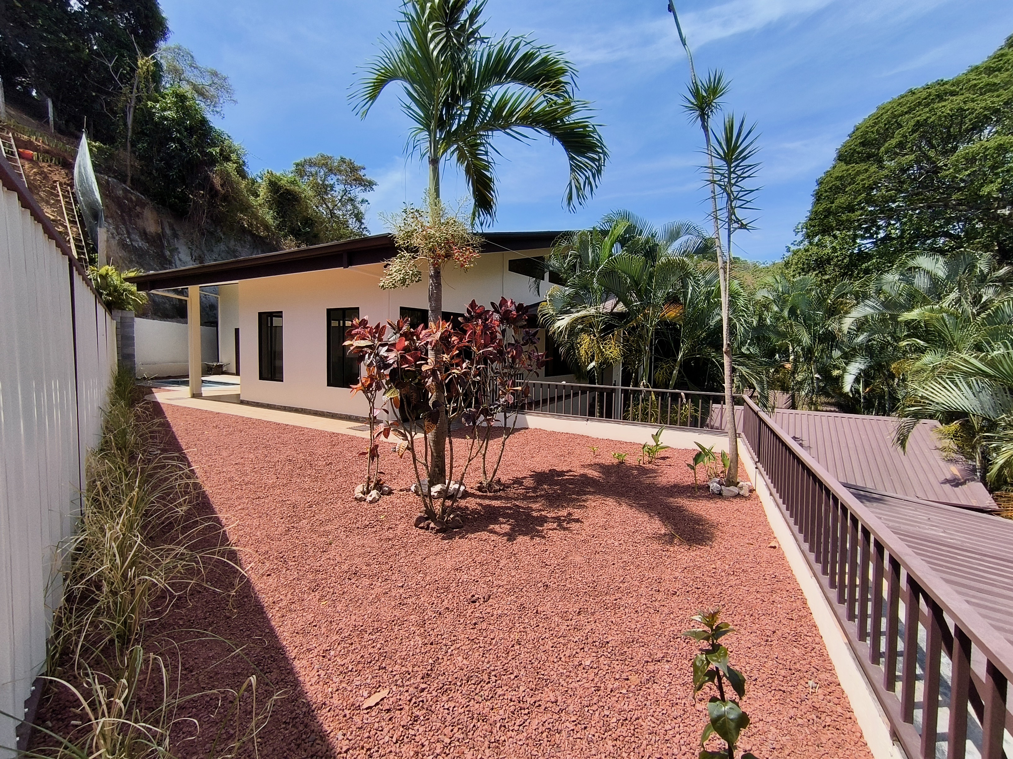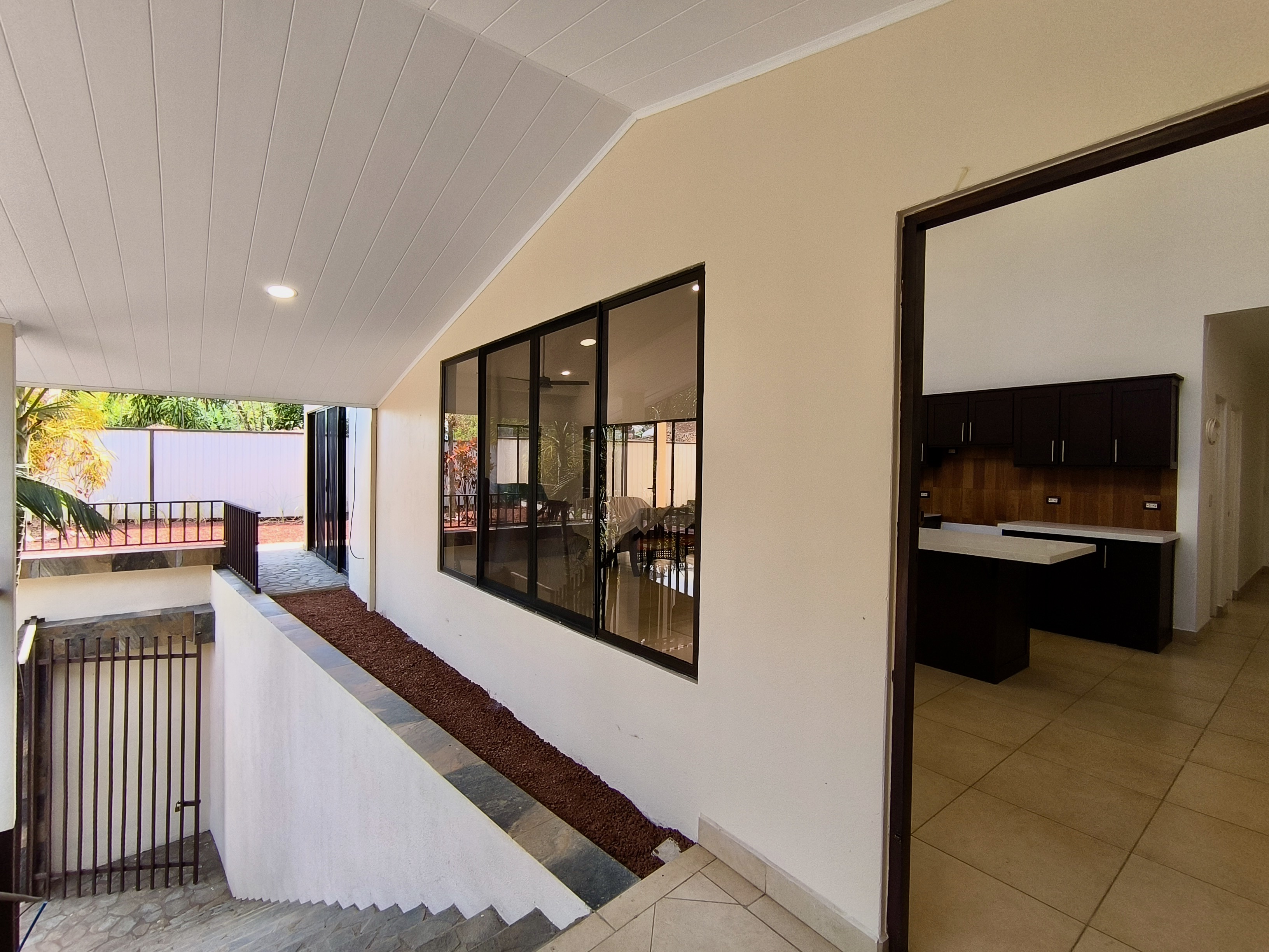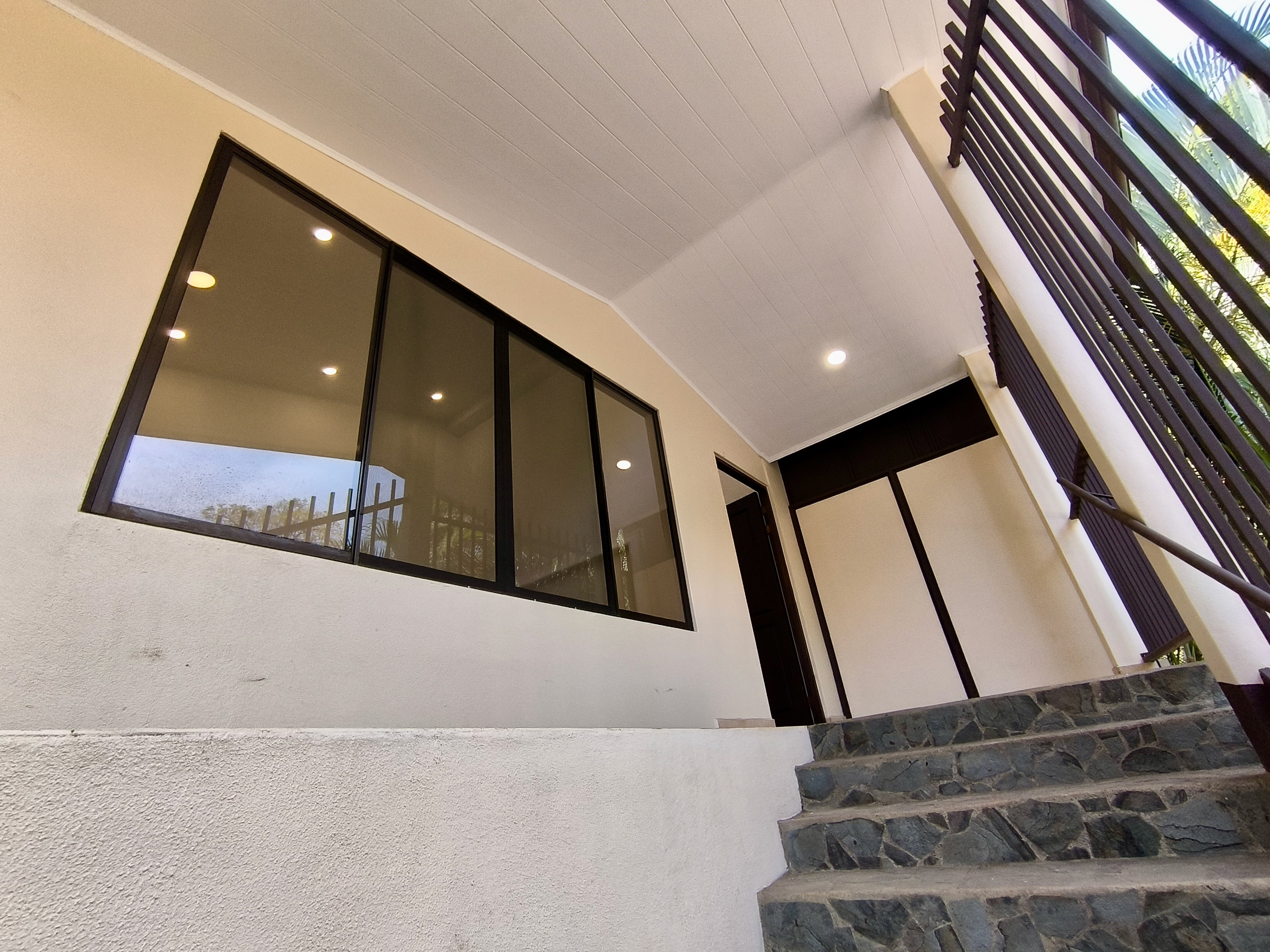 Access to the property is through an electric gate. After parking your vehicle under the carport, you reach the house via a wide staircase.