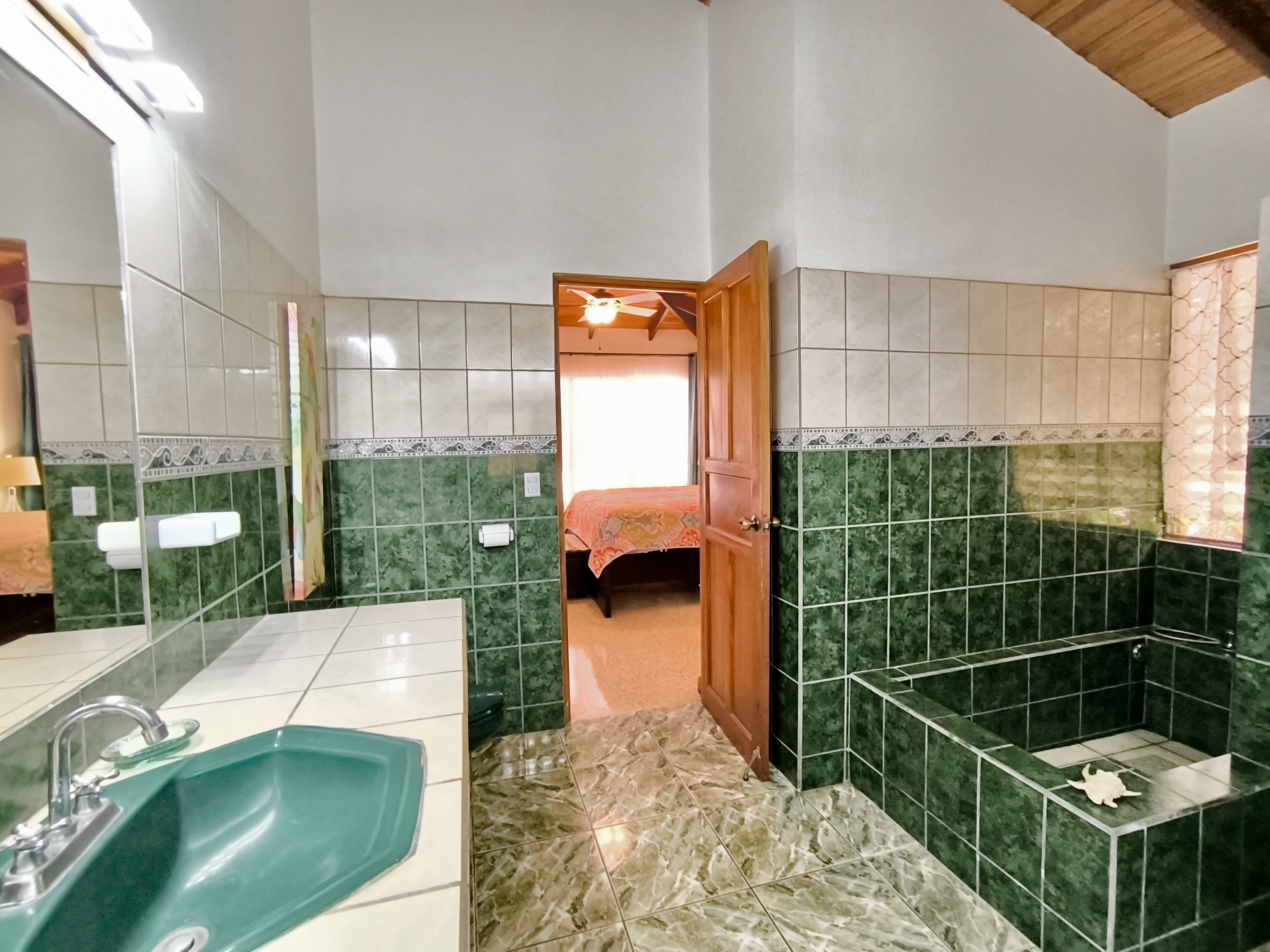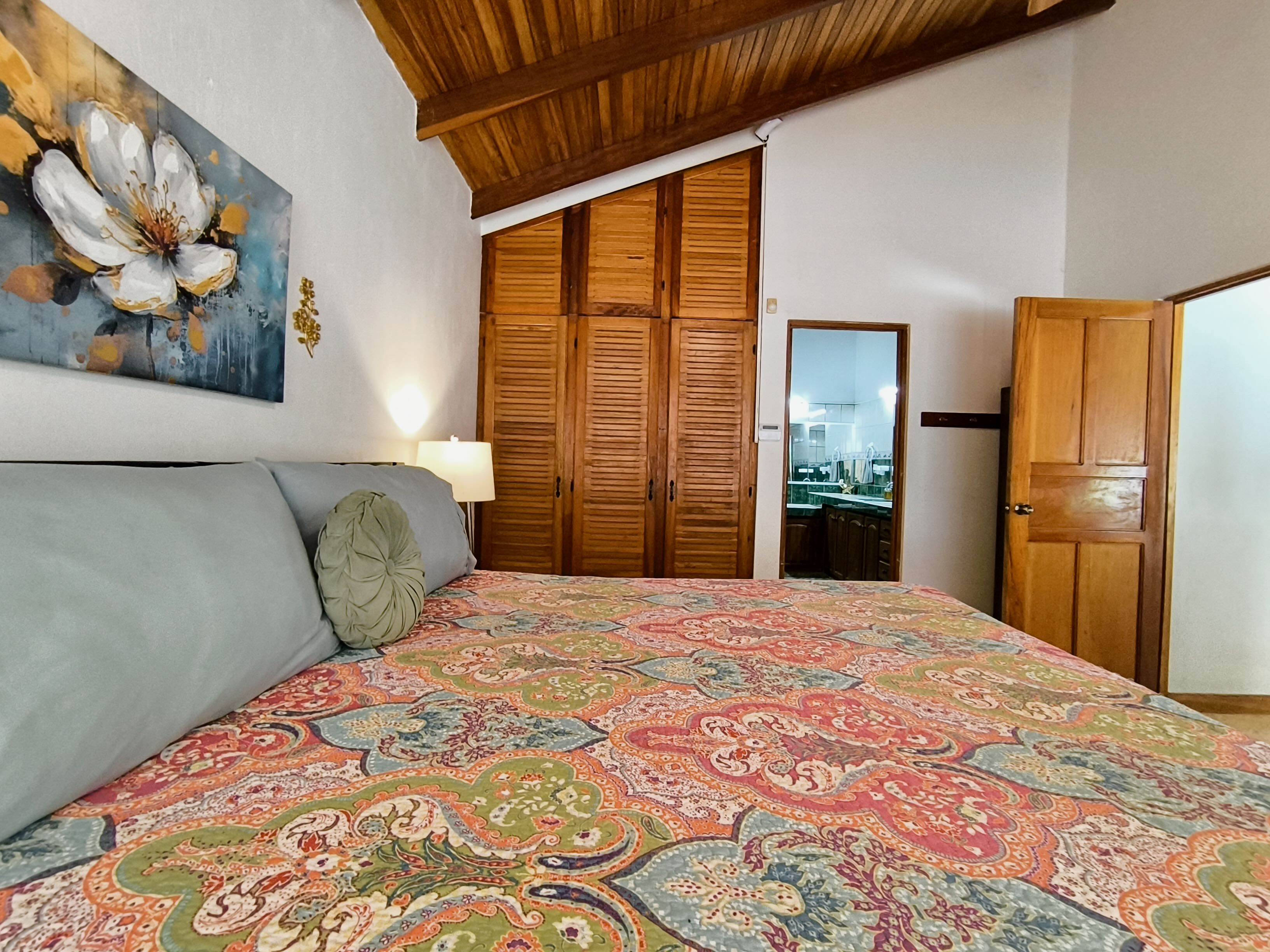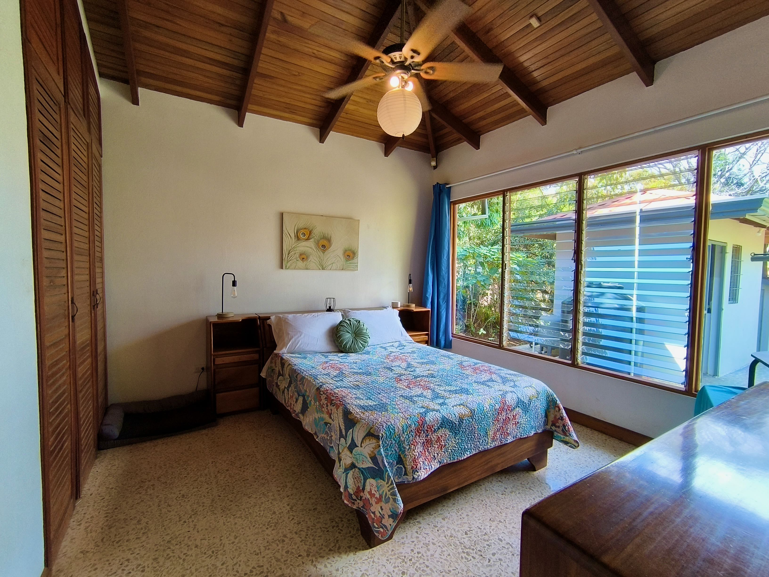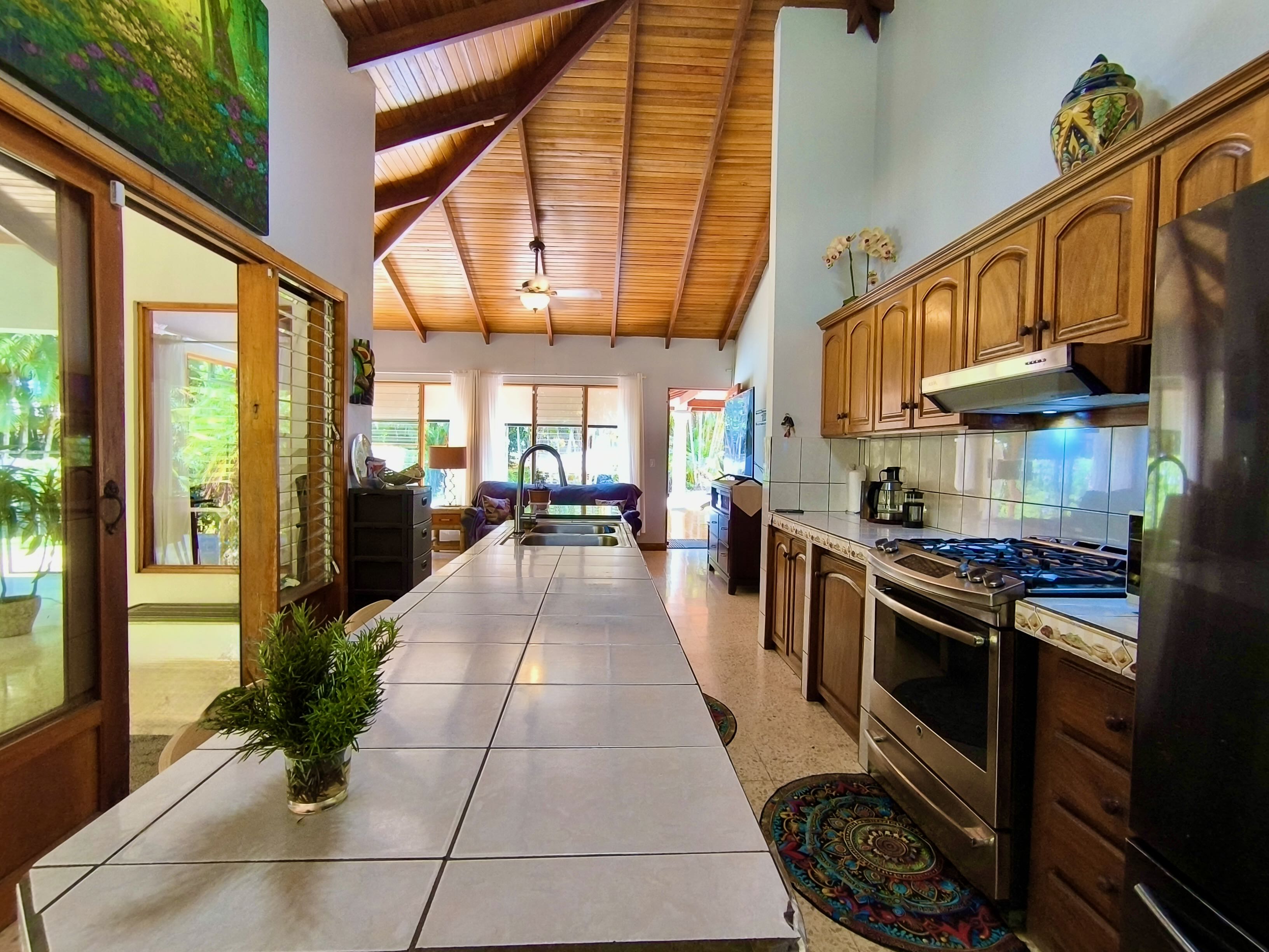 The main house is single-story and features two bedrooms, two bathrooms, and a bright open-plan kitchen and dining area with high ceilings finished in exotic wood, creating a warm and airy atmosphere.