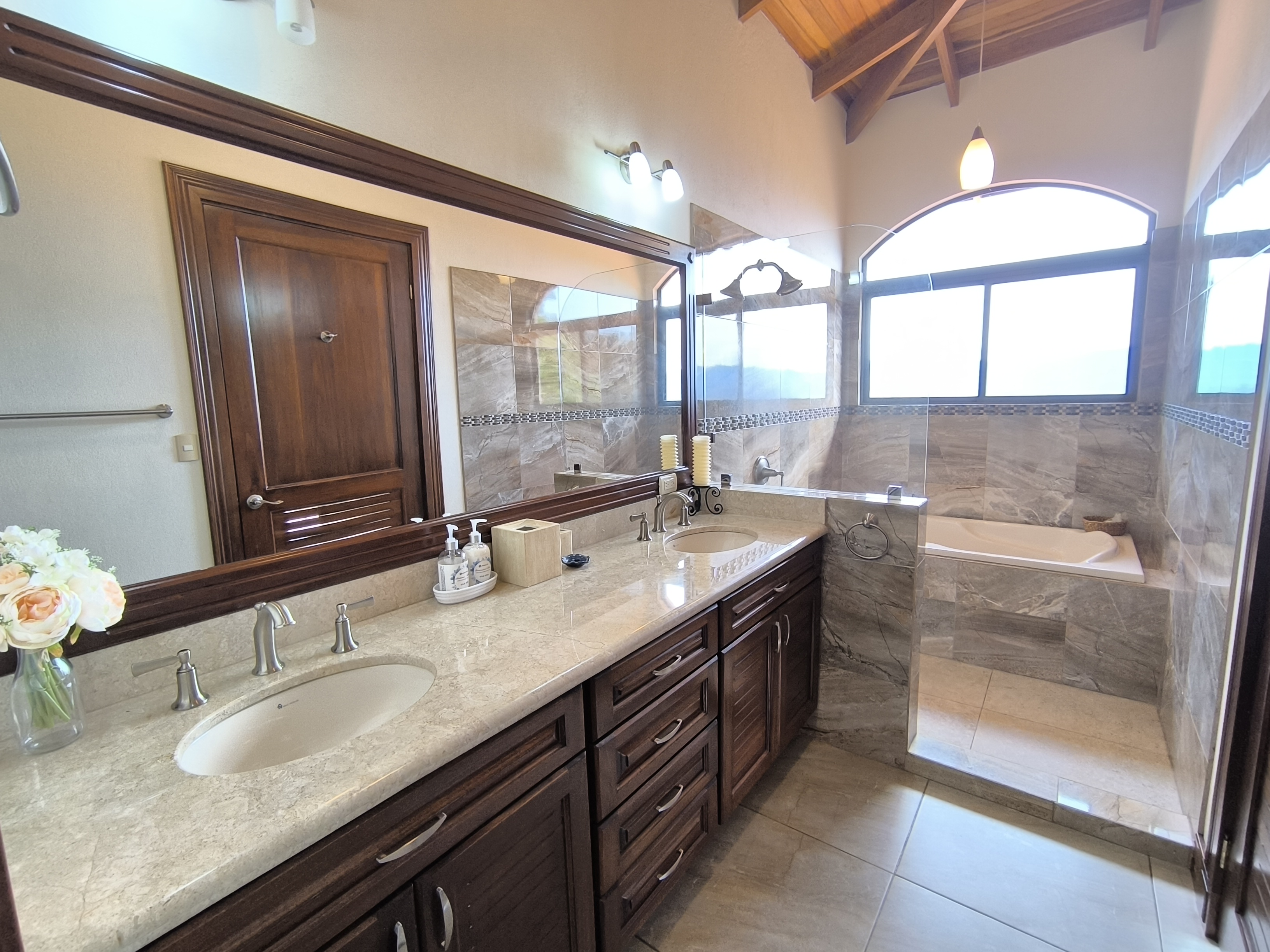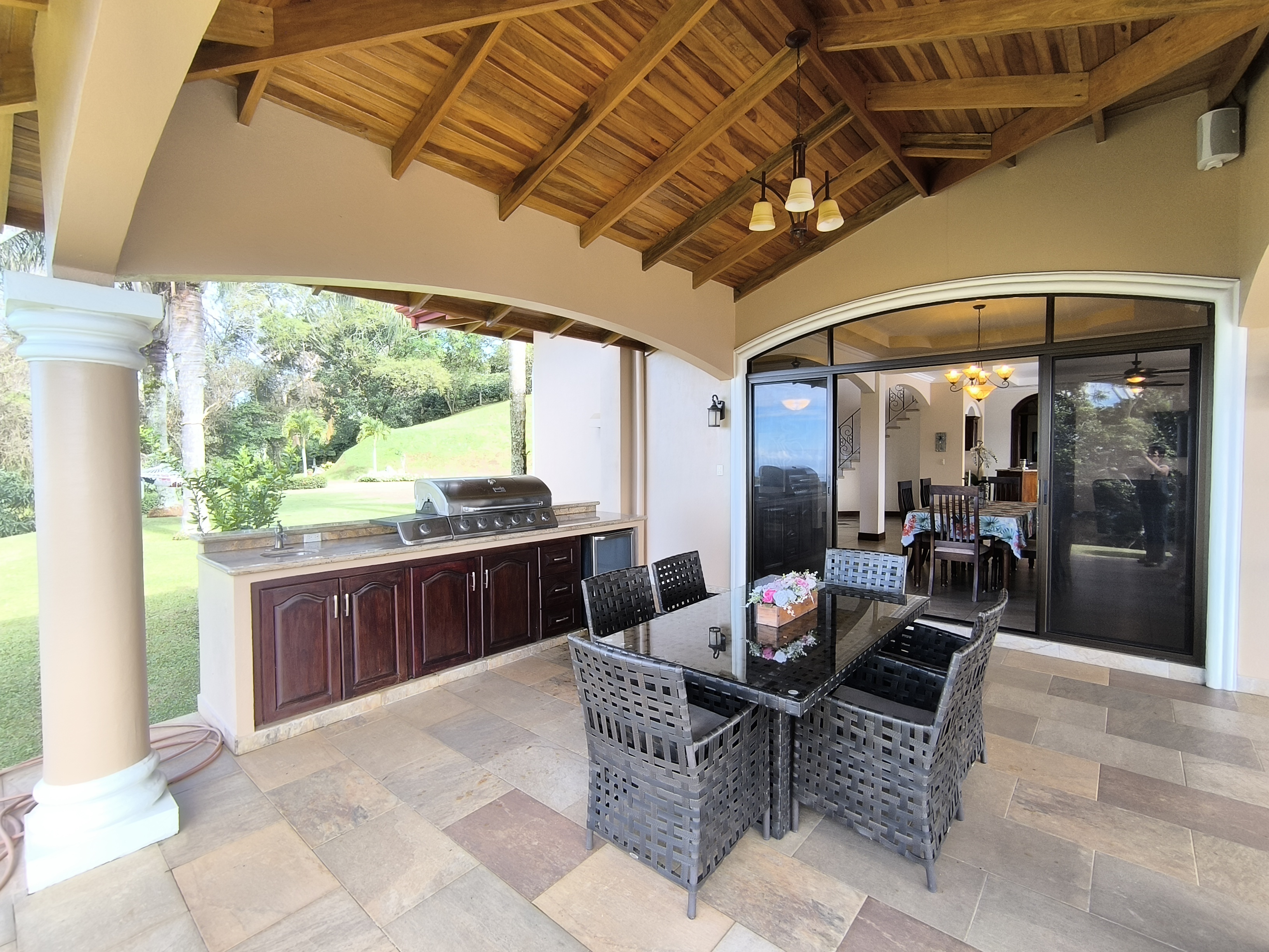 • Located on a hilltop surrounded by lush gardens and sweeping mountain views • Two-story main house plus a comfortable guest house and a refreshing swimming pool • Expansive deck area with BBQ, outdoor dining space, and lounge area to relax and admire the scenery • First floor features a spacious living room with mini bar, elegant wooden kitchen with large island, dining area, and a cozy office • A graceful curved staircase leads to the second floor with another living room and two bedrooms, each with a private bathroom • The outdoor areas are perfect for entertaining or enjoying peaceful afternoons by the pool • Electric gate for comfort and security • Located in a private and exclusive neighborhood surrounded by nature