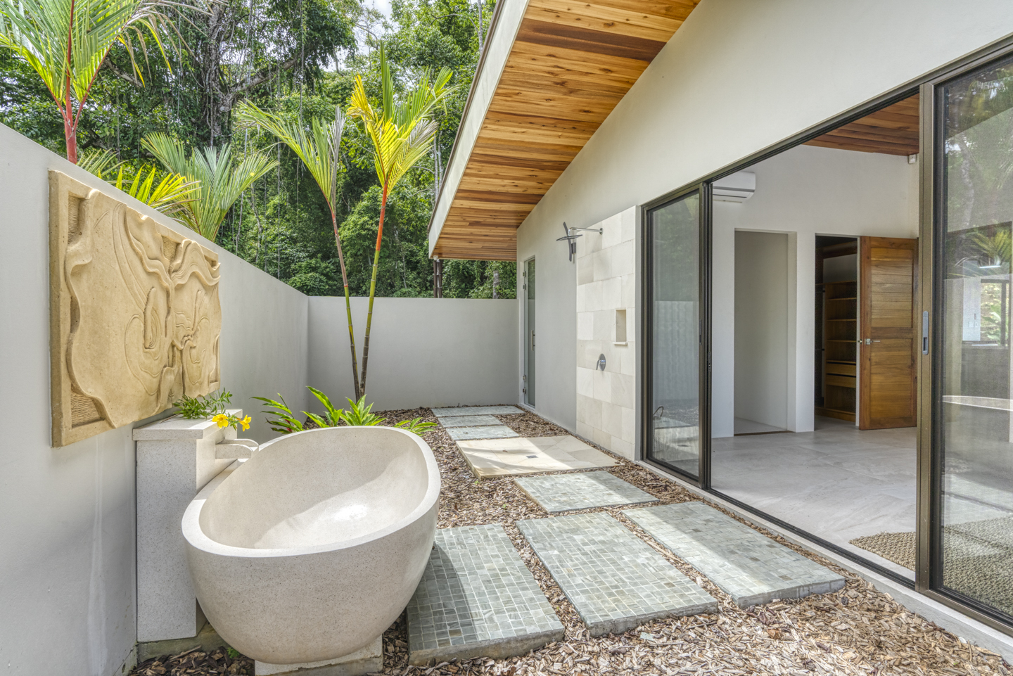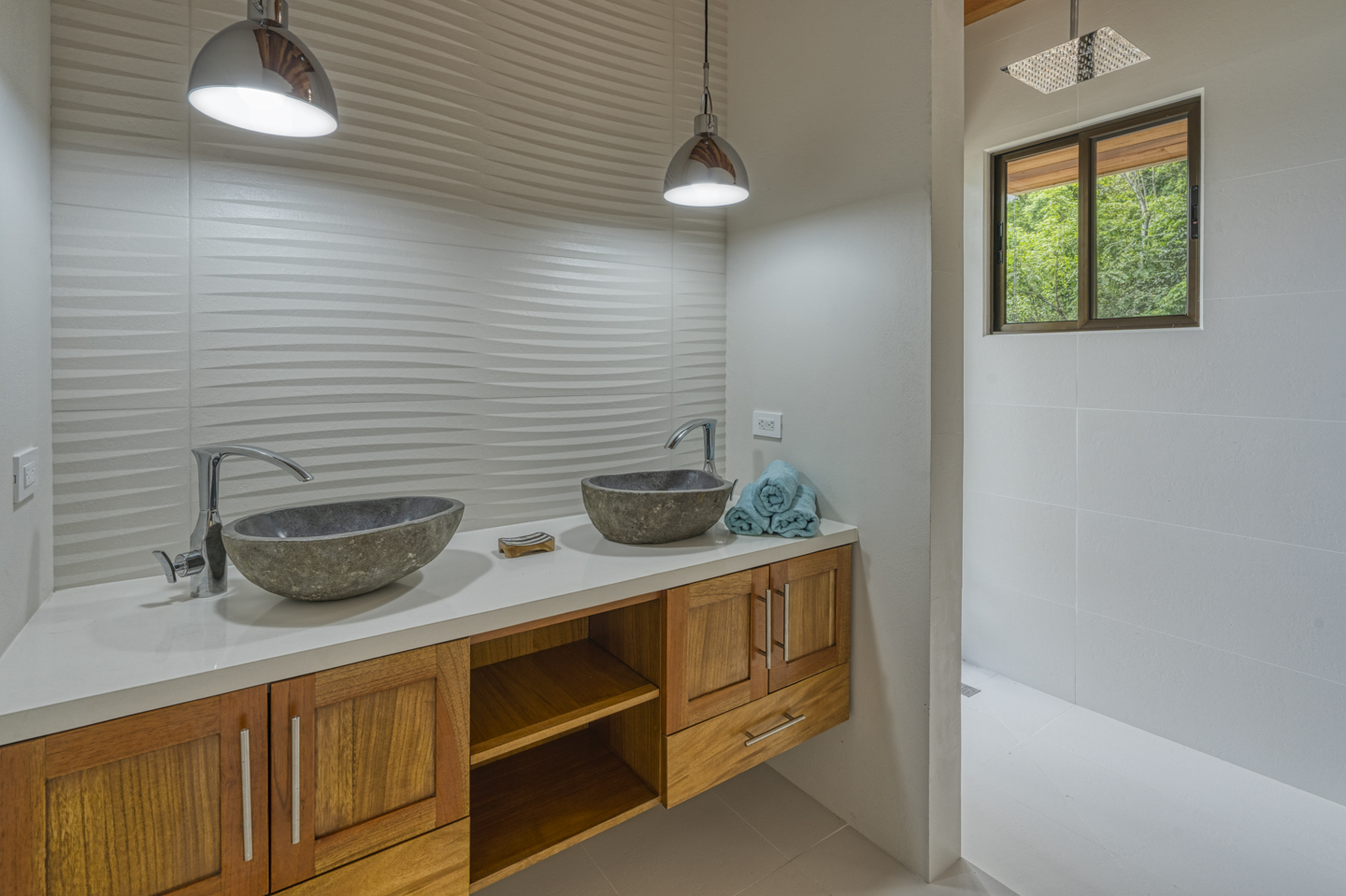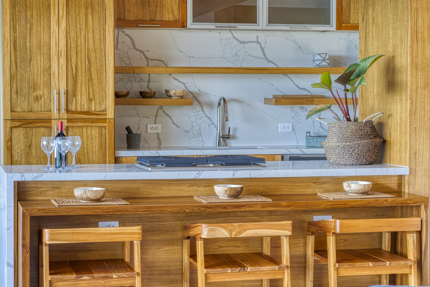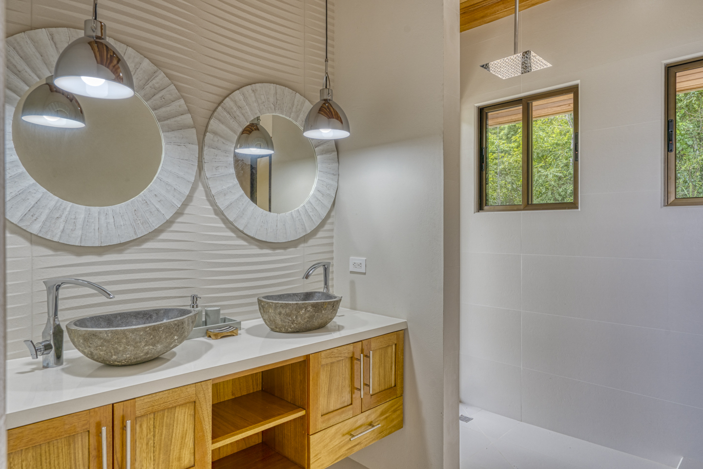 The entire master suite is an ocean-view owner’s retreat, complete with a huge custom closet dressing room. It features a private Bali spa-style bathtub, and a deck overlooking the backyard and ocean. It feels very spa-like amidst the local flowers and trees and ocean views to just soak in a luxurious bath. The suite also includes a separate deck area steps from the bed. The second master suite includes built-in wooden shelves, a wooden headboard, and your own private patio. The ensuite bathroom features two marble vessel sinks, a double vanity, and a glass-enclosed shower with window-access to the outdoor garden. It makes you feel like it’s an outdoor shower in the garden. The third bedroom is unfurnished for now.