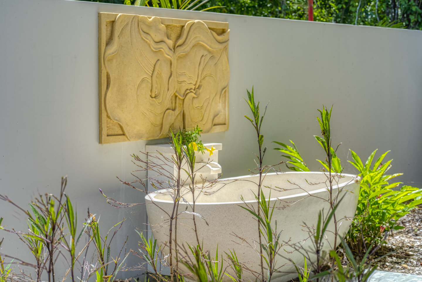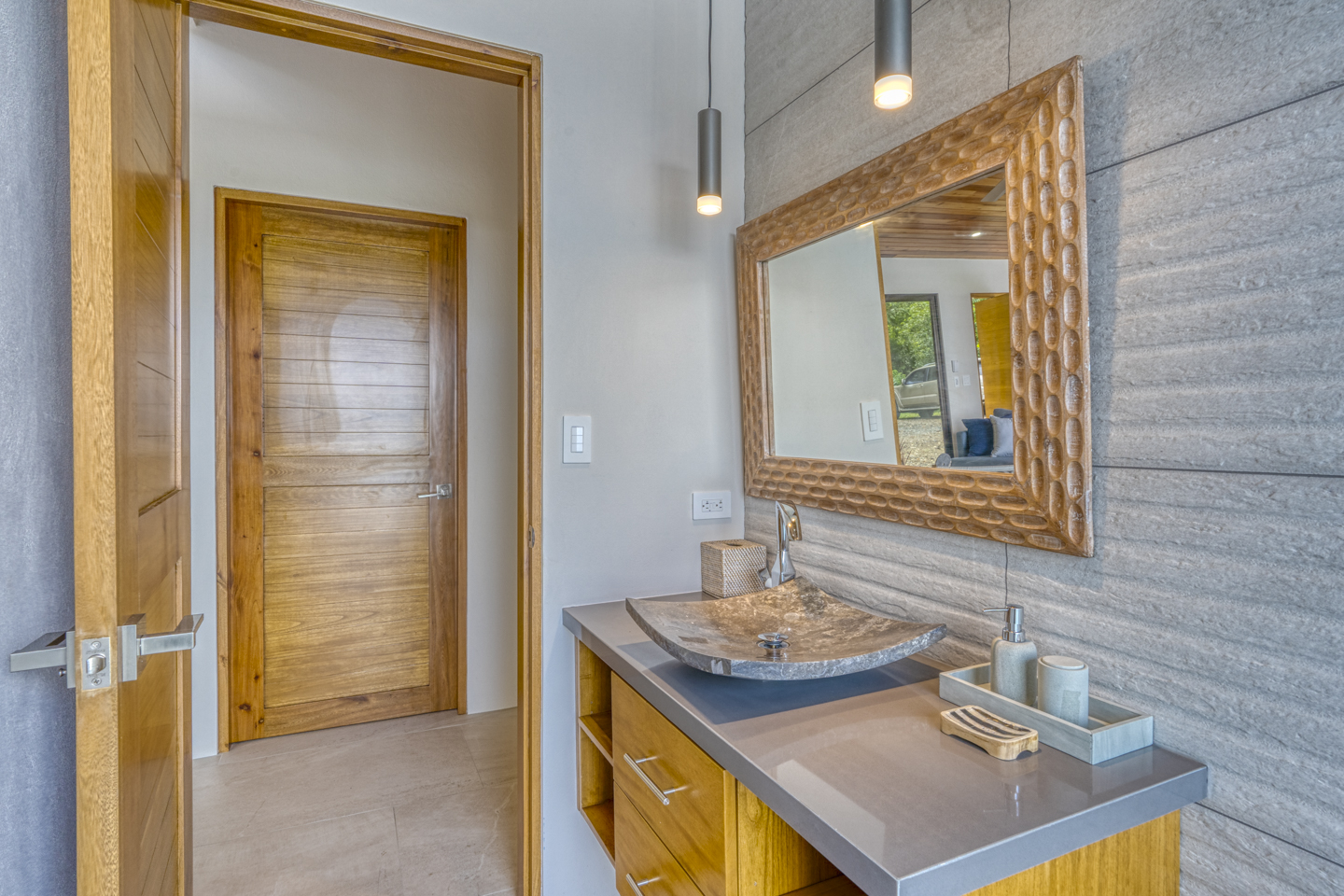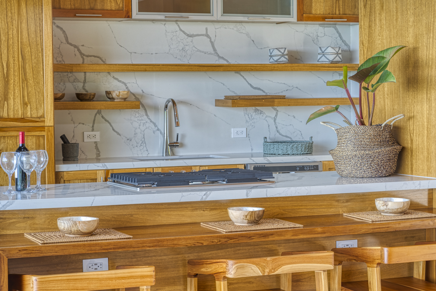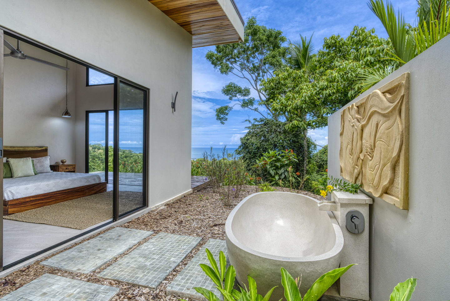 The entire master suite is an ocean-view owner’s retreat, complete with a huge custom closet dressing room. It features a private Bali spa-style bathtub, and a deck overlooking the backyard and ocean. It feels very spa-like amidst the local flowers and trees and ocean views to just soak in a luxurious bath. The suite also includes a separate deck area steps from the bed. The second master suite includes built-in wooden shelves, a wooden headboard, and your own private patio. The ensuite bathroom features two marble vessel sinks, a double vanity, and a glass-enclosed shower with window-access to the outdoor garden. It makes you feel like it’s an outdoor shower in the garden. The third bedroom is unfurnished for now.
