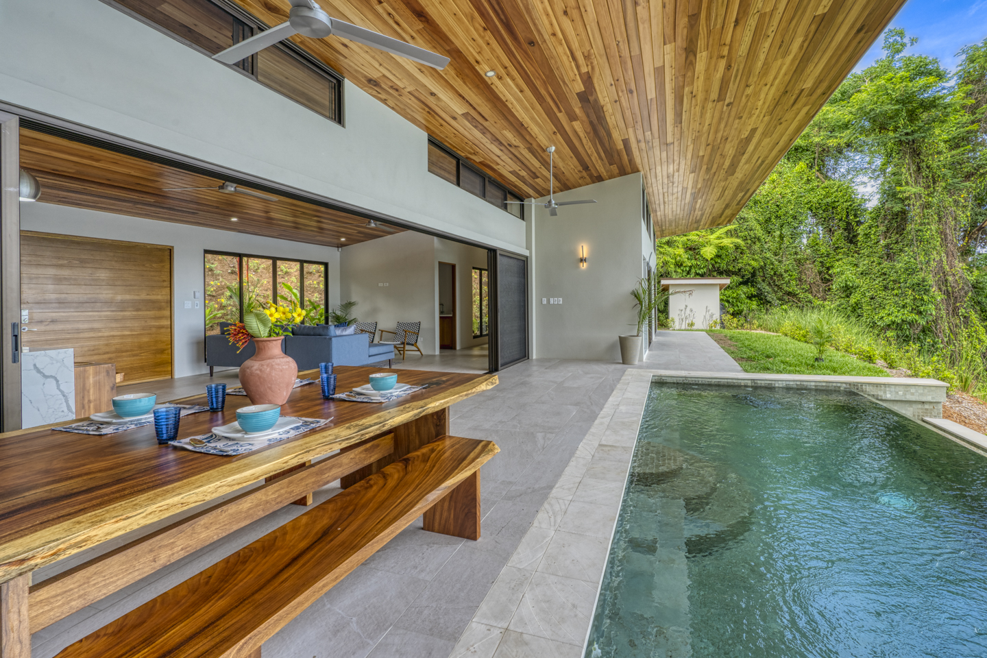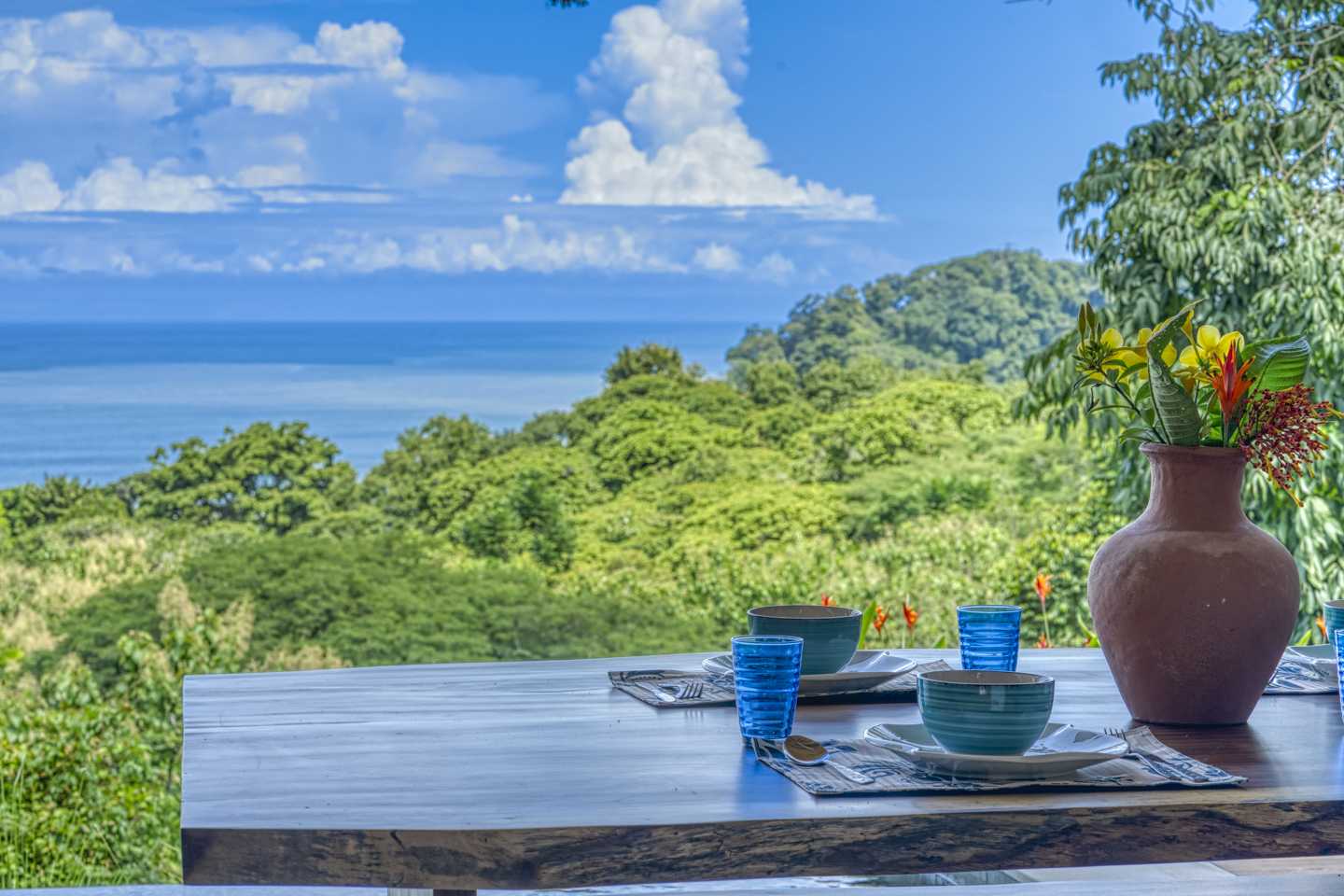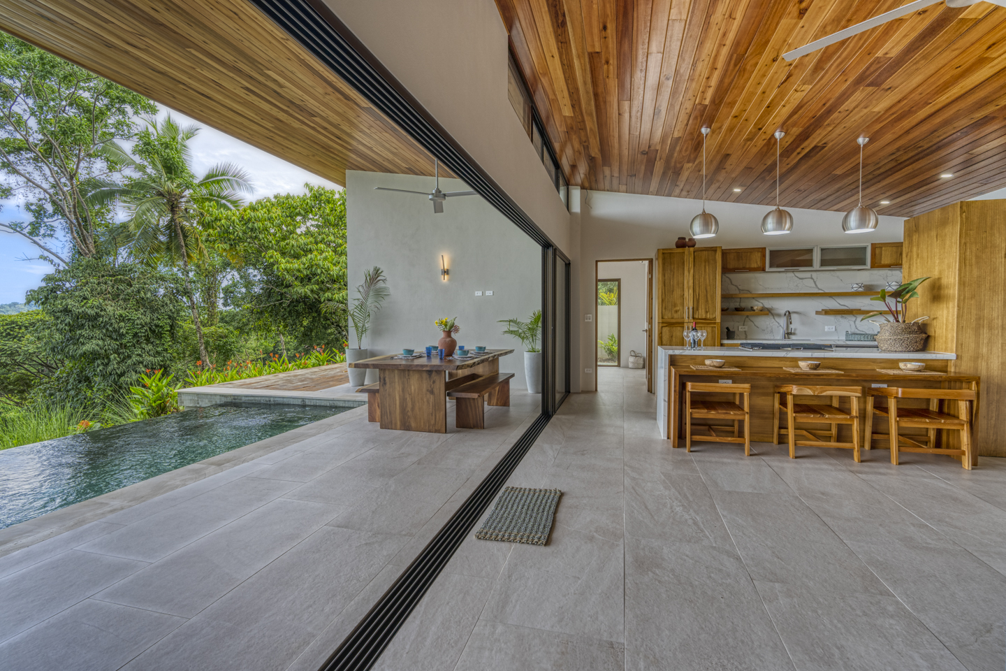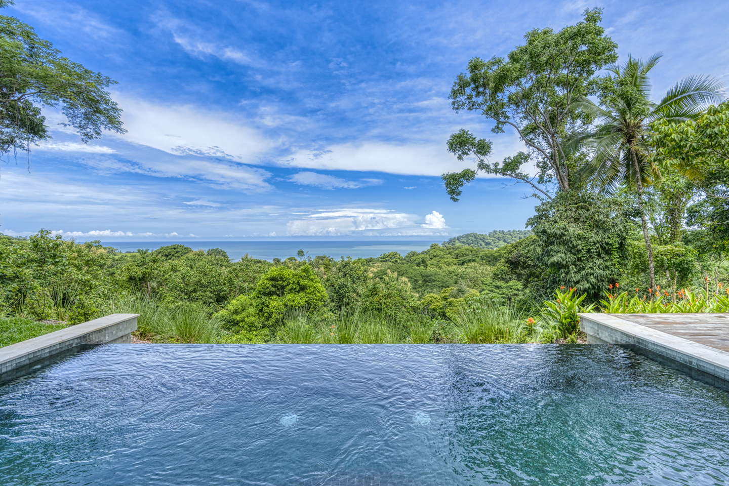 This modern and elegant 2,000 square foot luxury home is located in the hillside prestige community of Marina Vista, part of the scenic Escaleras neighborhood in Dominical. This tropical-inspired home features majestic ocean views from its peaceful setting above Dominicalito Cove. With over 2 acres of beautifully landscaped grounds, this is a perfect setting for tranquil relaxation, and sophisticated indoor and outdoor entertaining. The spacious open-plan interior includes all the benefits of a tropical open space design: clean lines, natural light, glass walls, high ceilings, and glossy tiled floors.