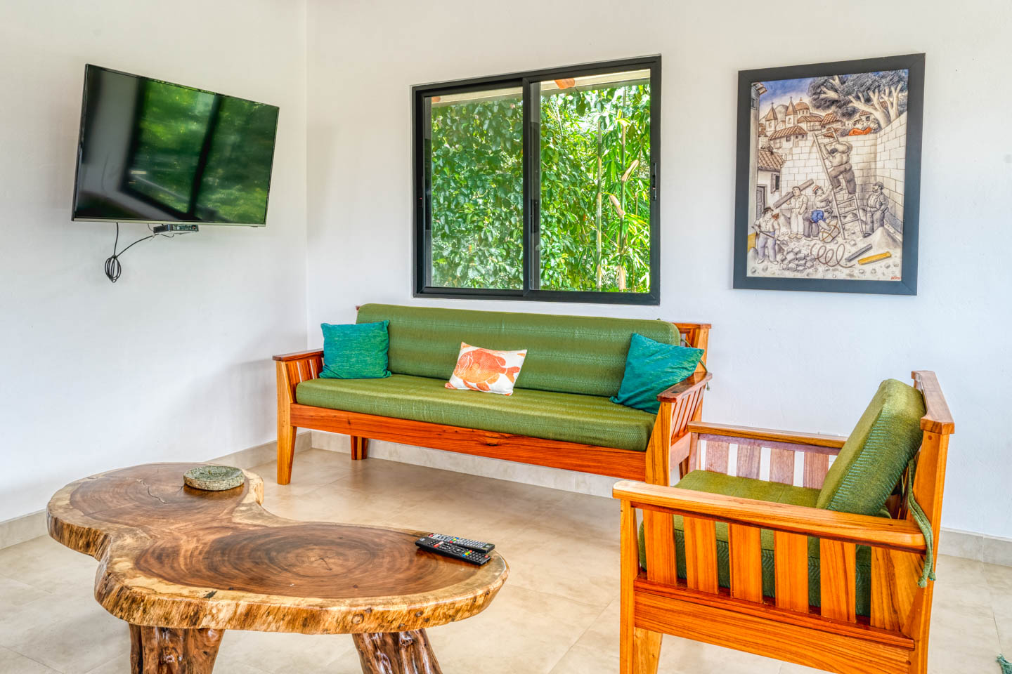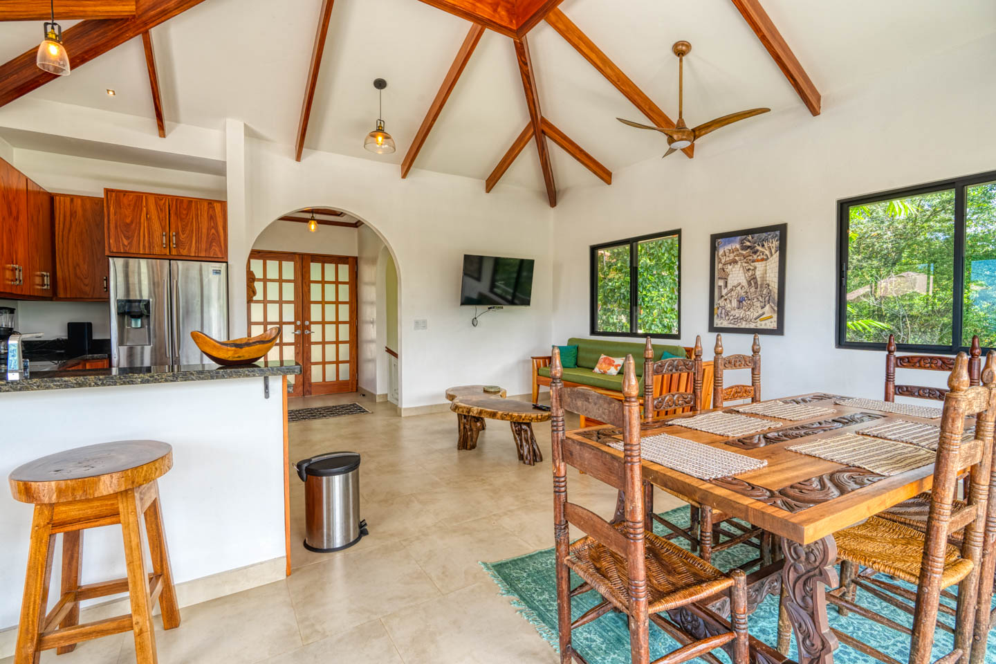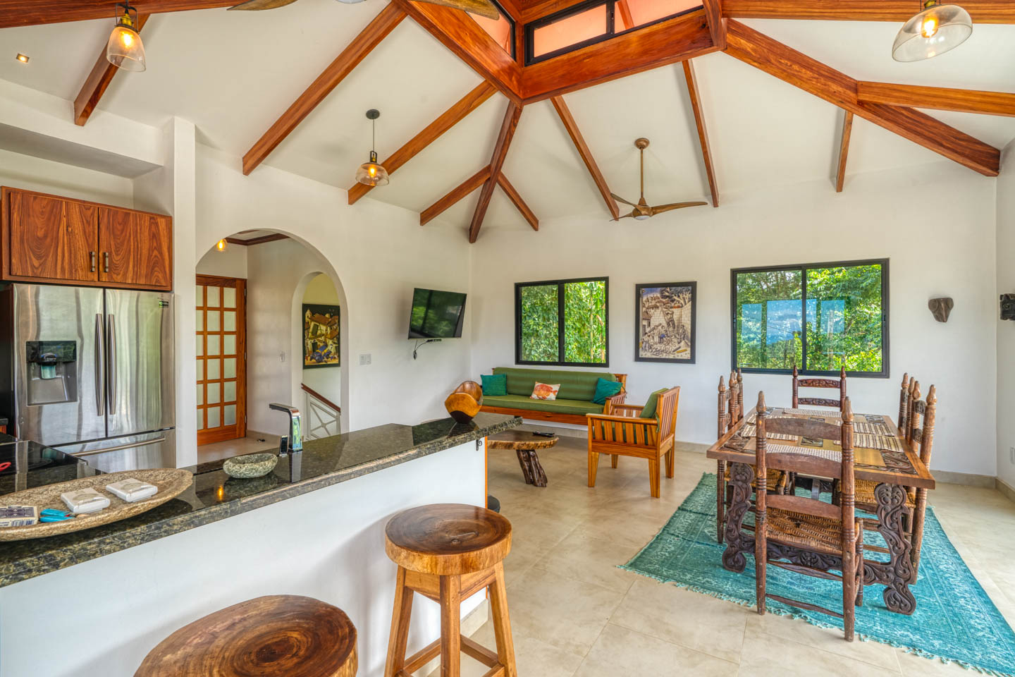 It was just finished this year and is one of the nicest in this community. It’s situated 300 feet above sea level so you’ll experience cool breezes all year round. You’re less than a 10-minute walk to the beach. It’s the ideal property for a vacation house or an investment property. You enter the villa on the second floor where you will find the kitchen, dining room, and living room. The gourmet kitchen includes new stainless steel appliances, wooden cabinetry, and a breakfast bar. It also features a high-top wooden table and bar stools. The wooden dining room table is intricately hand-crafted and includes seating for six. The living room features a tropical and beachy vibe with a green sofa and chair, accented with blue cushions and a hand-crafted coffee table. The abundance of windows and ceiling fans help to keep the condo cool. There is a half bathroom on this level, making it easily accessible for the pool. The sliding doors open to the wrap-around deck which leads to the pool.
