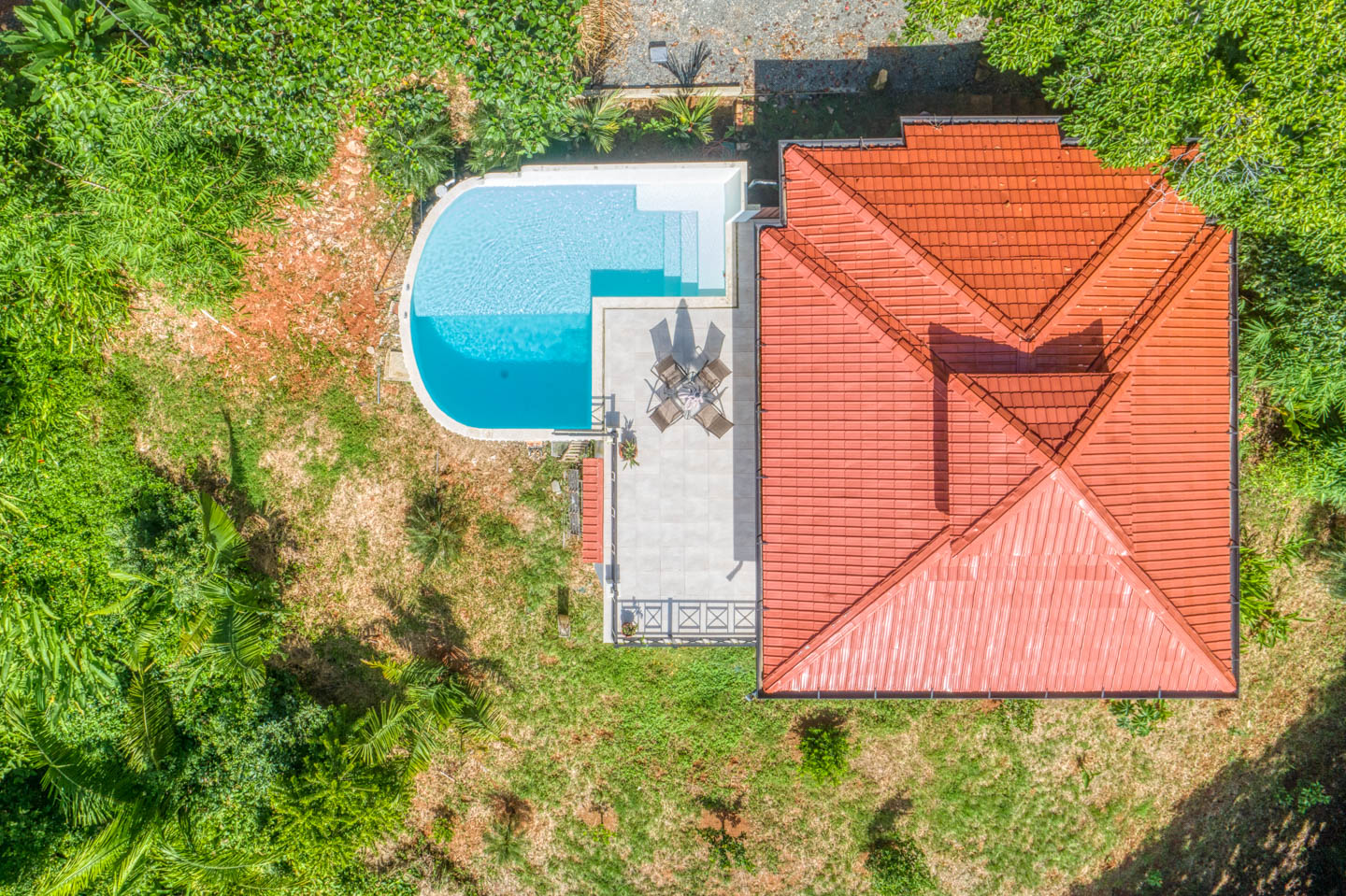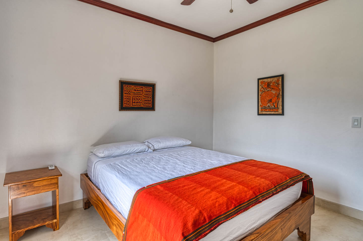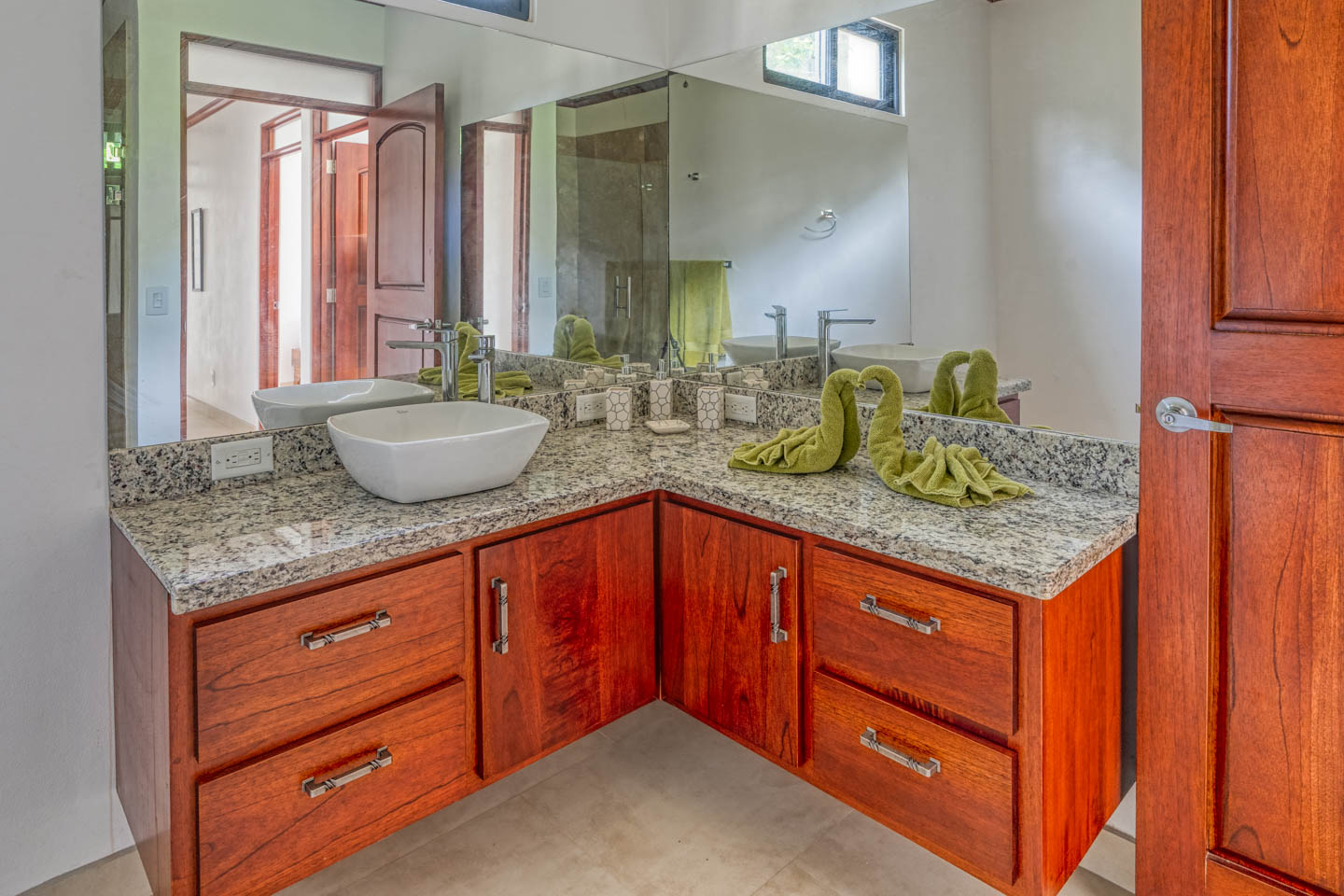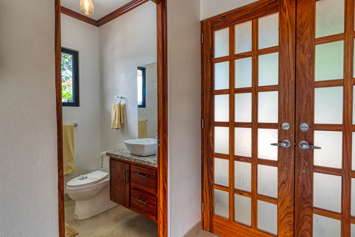 It was just finished this year and is one of the nicest in this community. It’s situated 300 feet above sea level so you’ll experience cool breezes all year round. You’re less than a 10-minute walk to the beach. It’s the ideal property for a vacation house or an investment property. You enter the villa on the second floor where you will find the kitchen, dining room, and living room. The gourmet kitchen includes new stainless steel appliances, wooden cabinetry, and a breakfast bar. It also features a high-top wooden table and bar stools. The wooden dining room table is intricately hand-crafted and includes seating for six. The living room features a tropical and beachy vibe with a green sofa and chair, accented with blue cushions and a hand-crafted coffee table. The abundance of windows and ceiling fans help to keep the condo cool. There is a half bathroom on this level, making it easily accessible for the pool. The sliding doors open to the wrap-around deck which leads to the pool.