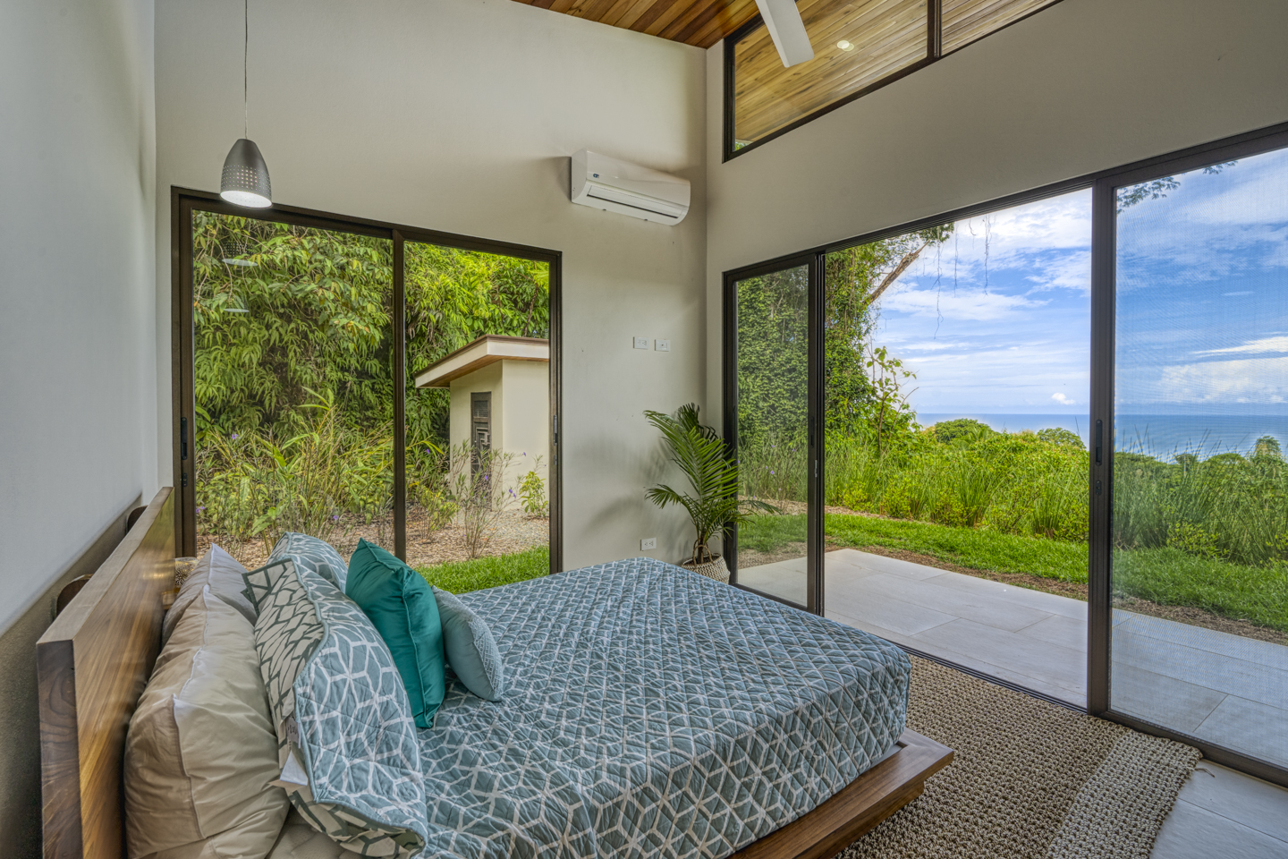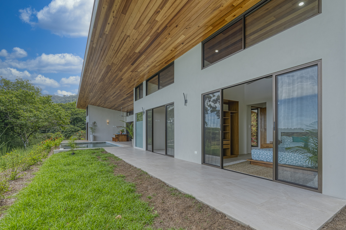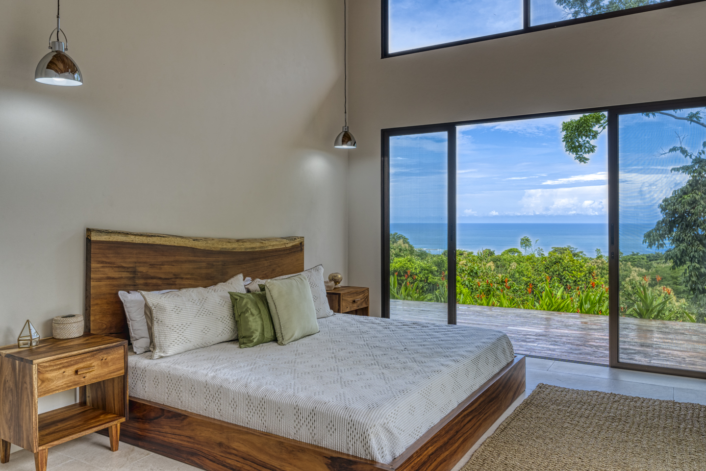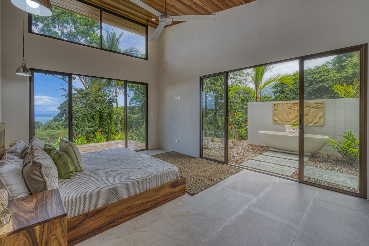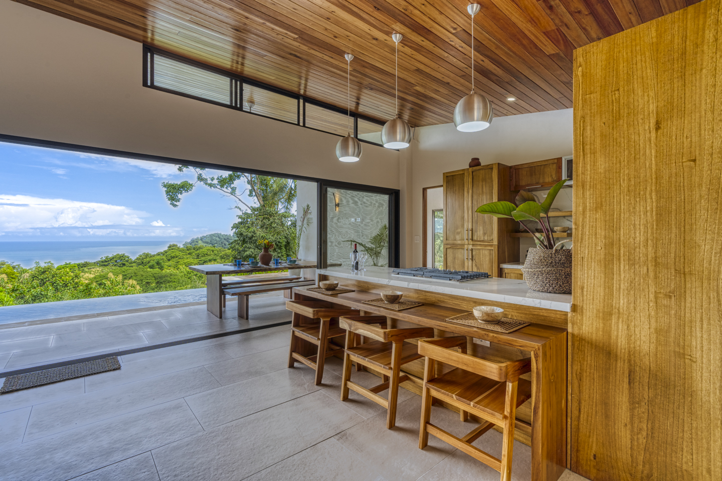This modern and elegant 2,000 square foot luxury home is located in the hillside prestige community of Marina Vista, part of the scenic Escaleras neighborhood in Dominical. This tropical-inspired home features majestic ocean views from its peaceful setting above Dominicalito Cove. With over 2 acres of beautifully landscaped grounds, this is a perfect setting for tranquil relaxation, and sophisticated indoor and outdoor entertaining. The spacious open-plan interior includes all the benefits of a tropical open space design: clean lines, natural light, glass walls, high ceilings, and glossy tiled floors.