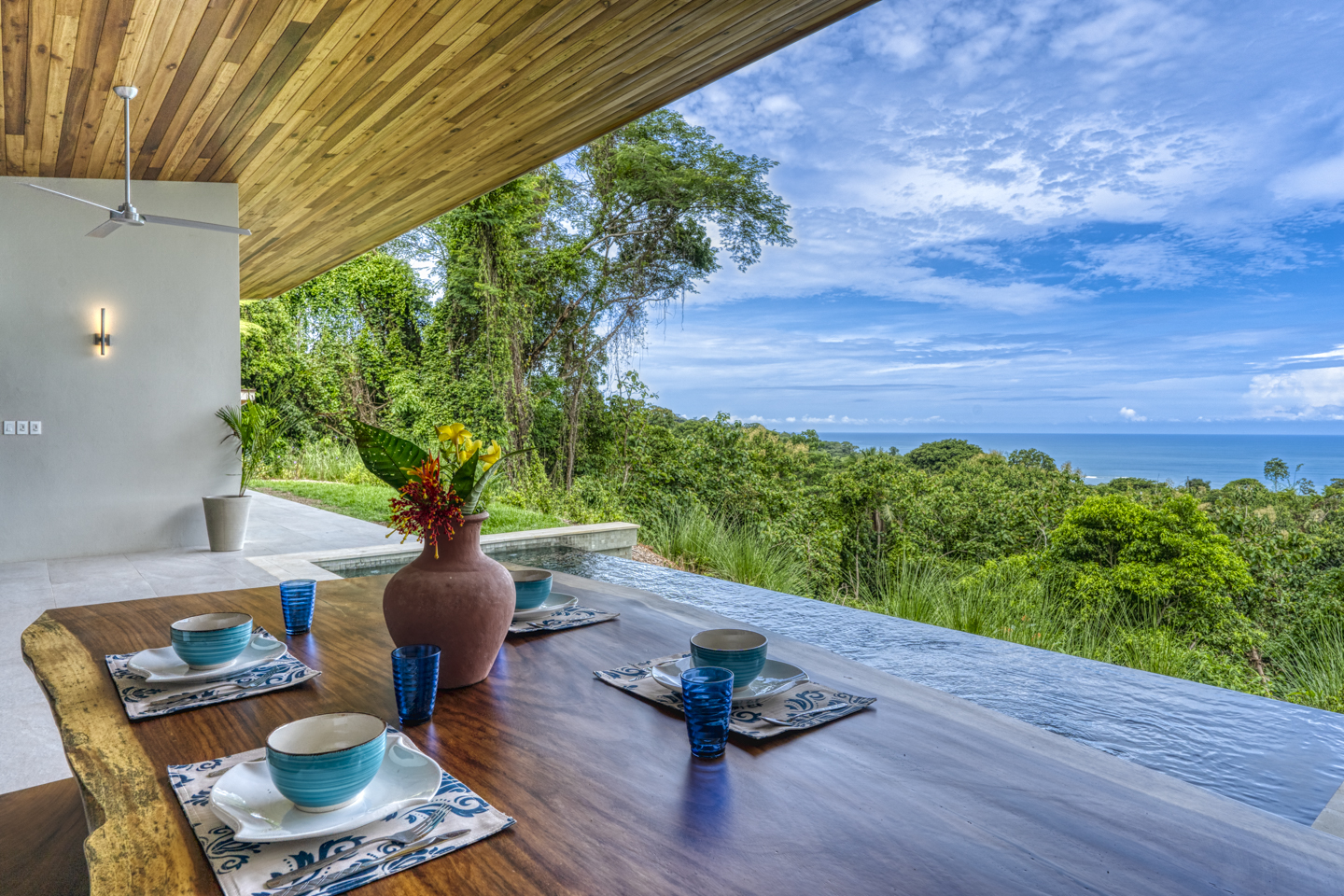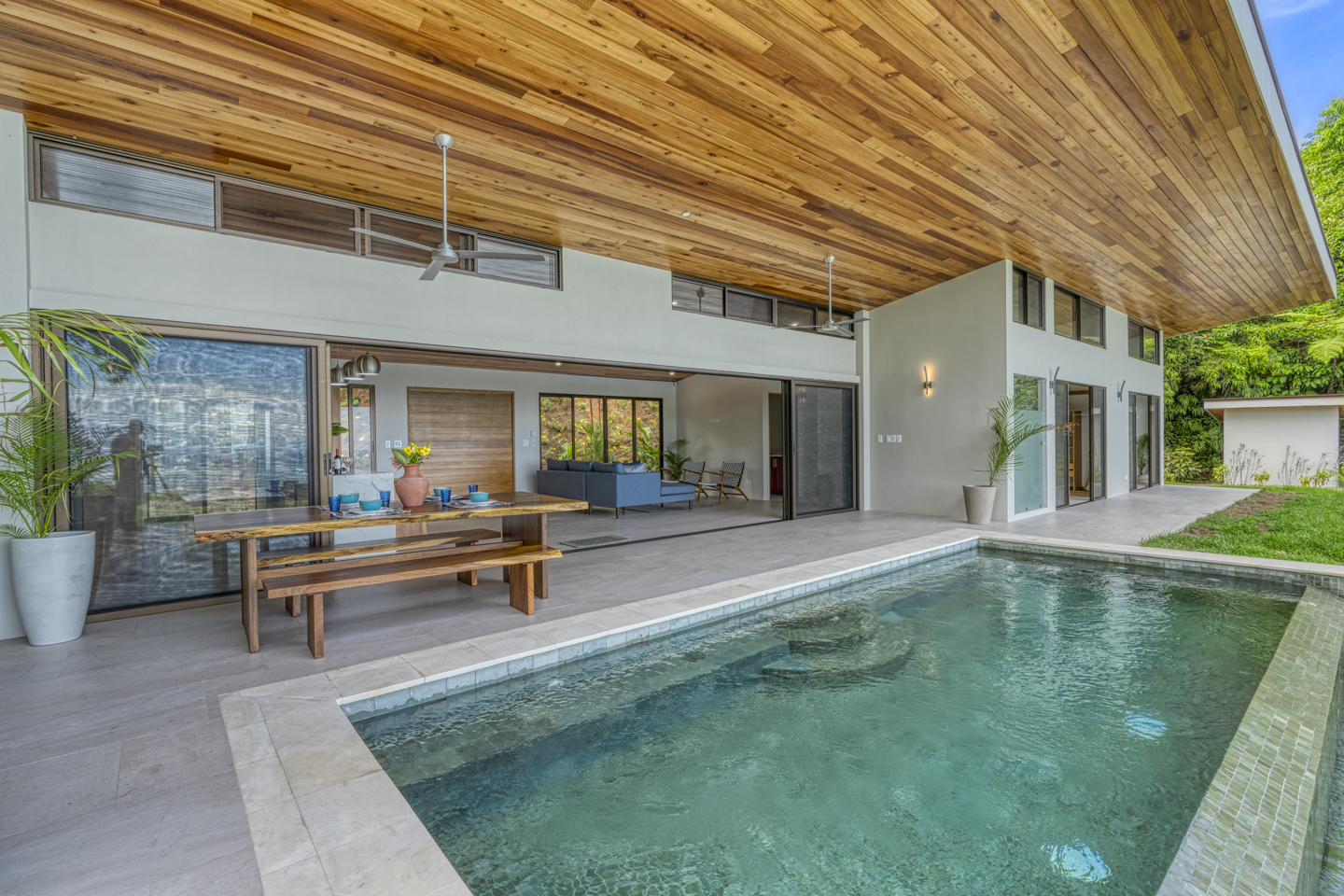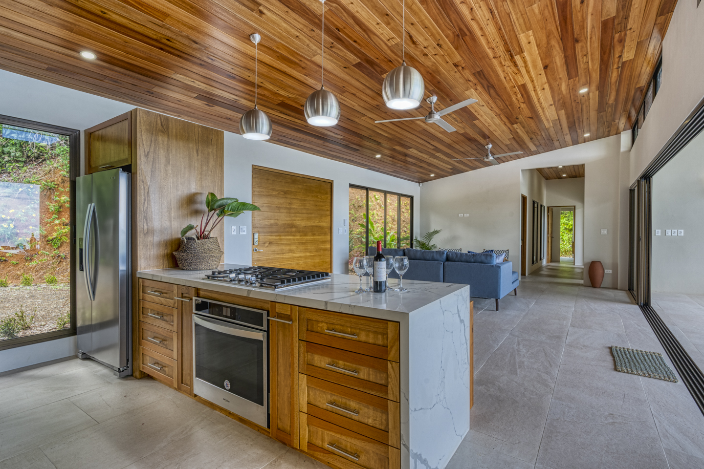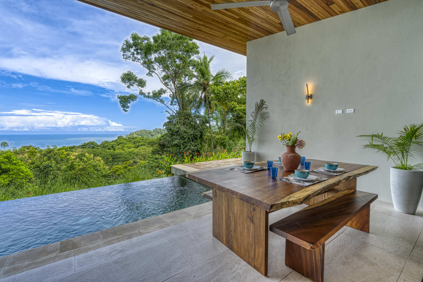 This modern and elegant 2,000 square foot luxury home is located in the hillside prestige community of Marina Vista, part of the scenic Escaleras neighborhood in Dominical. This tropical-inspired home features majestic ocean views from its peaceful setting above Dominicalito Cove. With over 2 acres of beautifully landscaped grounds, this is a perfect setting for tranquil relaxation, and sophisticated indoor and outdoor entertaining. The spacious open-plan interior includes all the benefits of a tropical open space design: clean lines, natural light, glass walls, high ceilings, and glossy tiled floors.