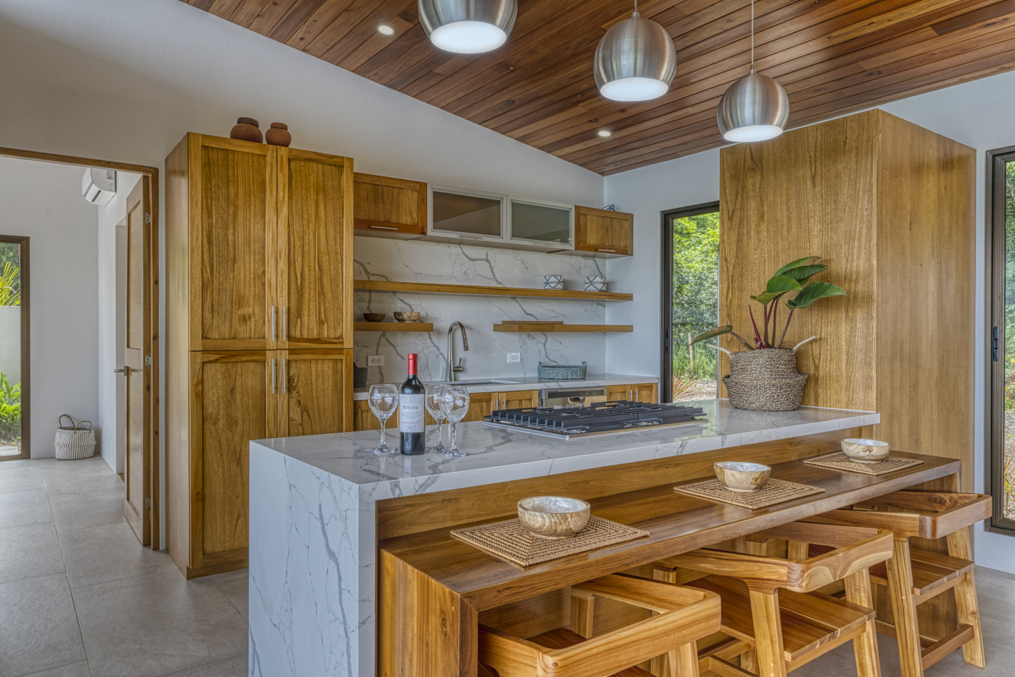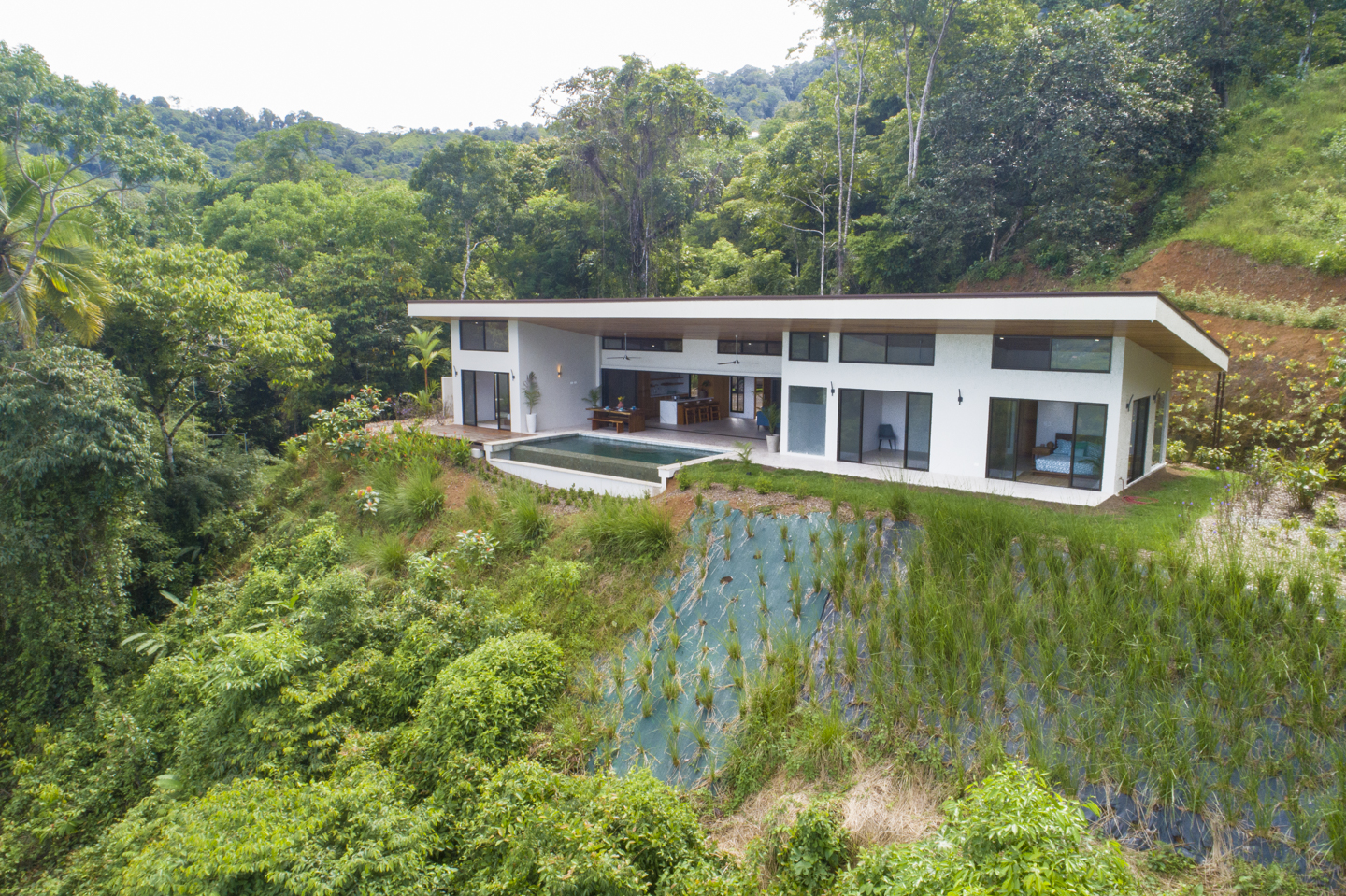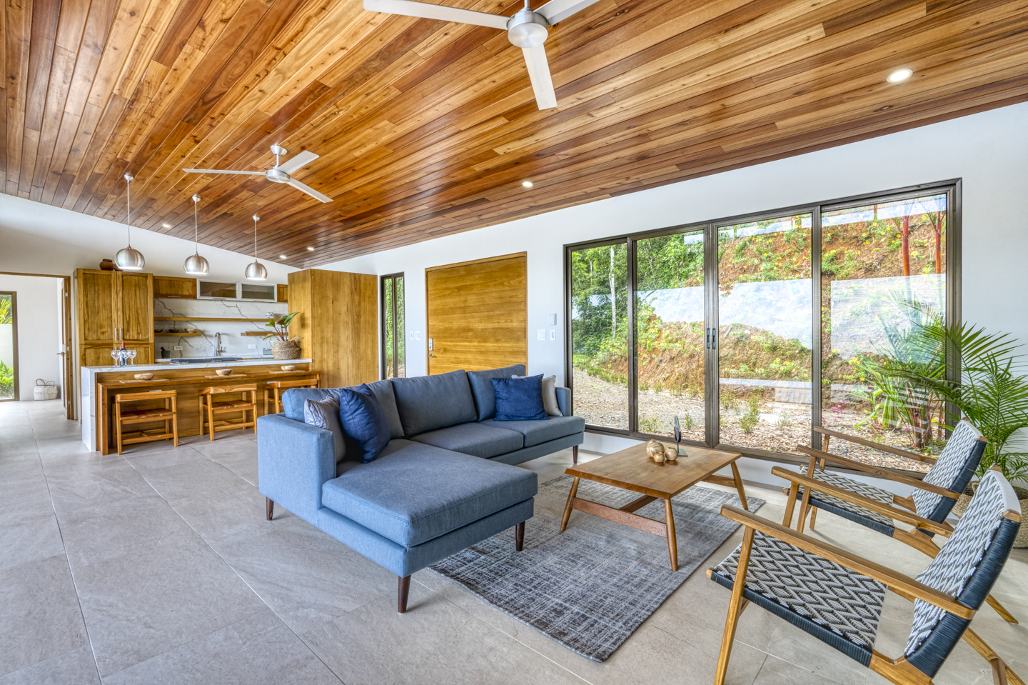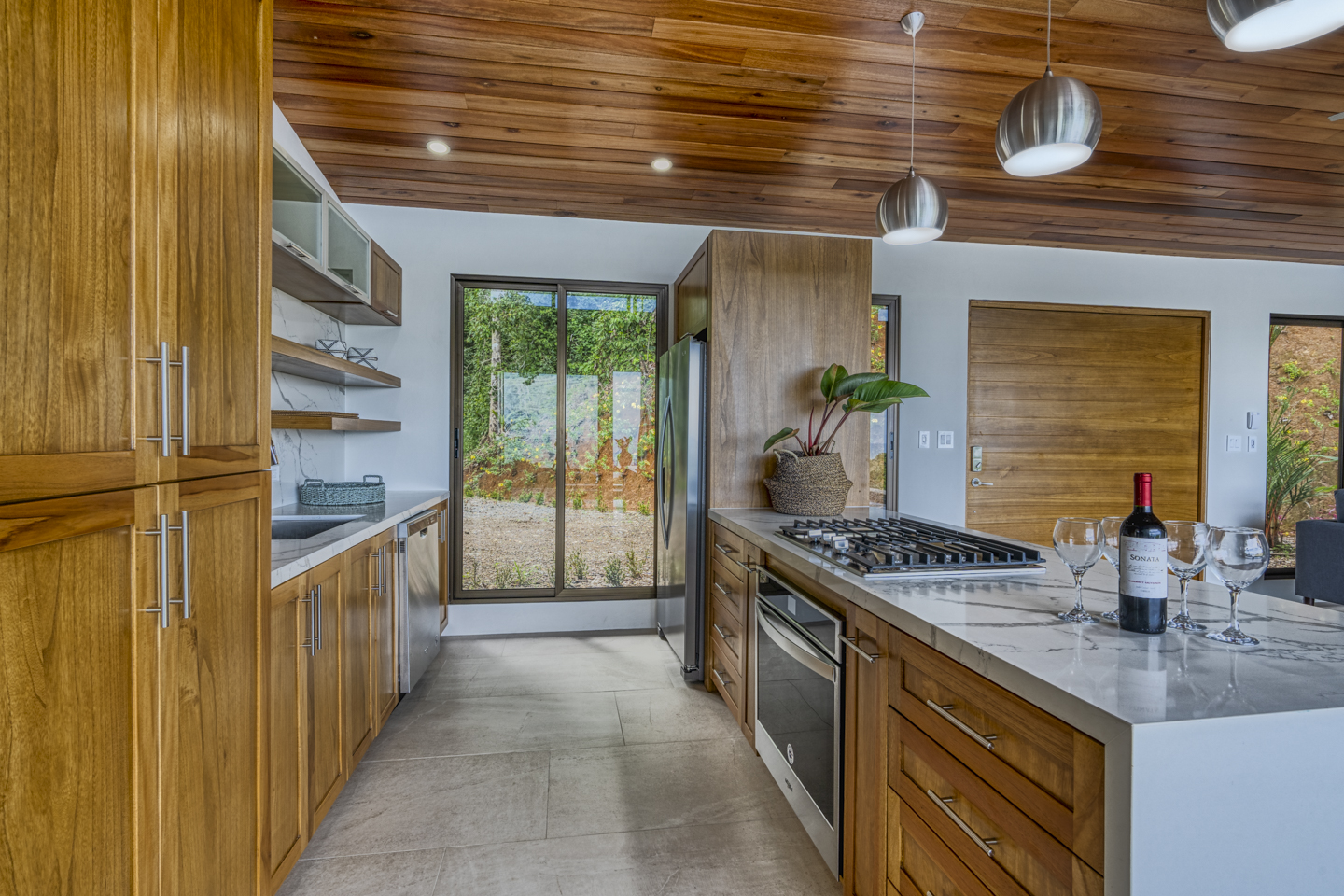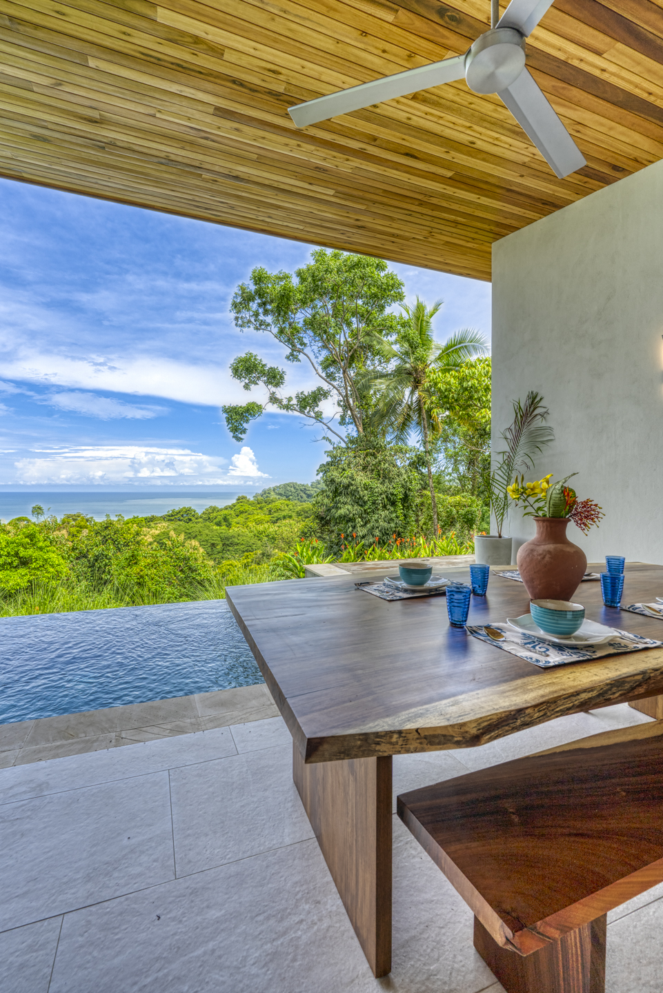 This modern and elegant 2,000 square foot luxury home is located in the hillside prestige community of Marina Vista, part of the scenic Escaleras neighborhood in Dominical. This tropical-inspired home features majestic ocean views from its peaceful setting above Dominicalito Cove. With over 2 acres of beautifully landscaped grounds, this is a perfect setting for tranquil relaxation, and sophisticated indoor and outdoor entertaining. The spacious open-plan interior includes all the benefits of a tropical open space design: clean lines, natural light, glass walls, high ceilings, and glossy tiled floors.