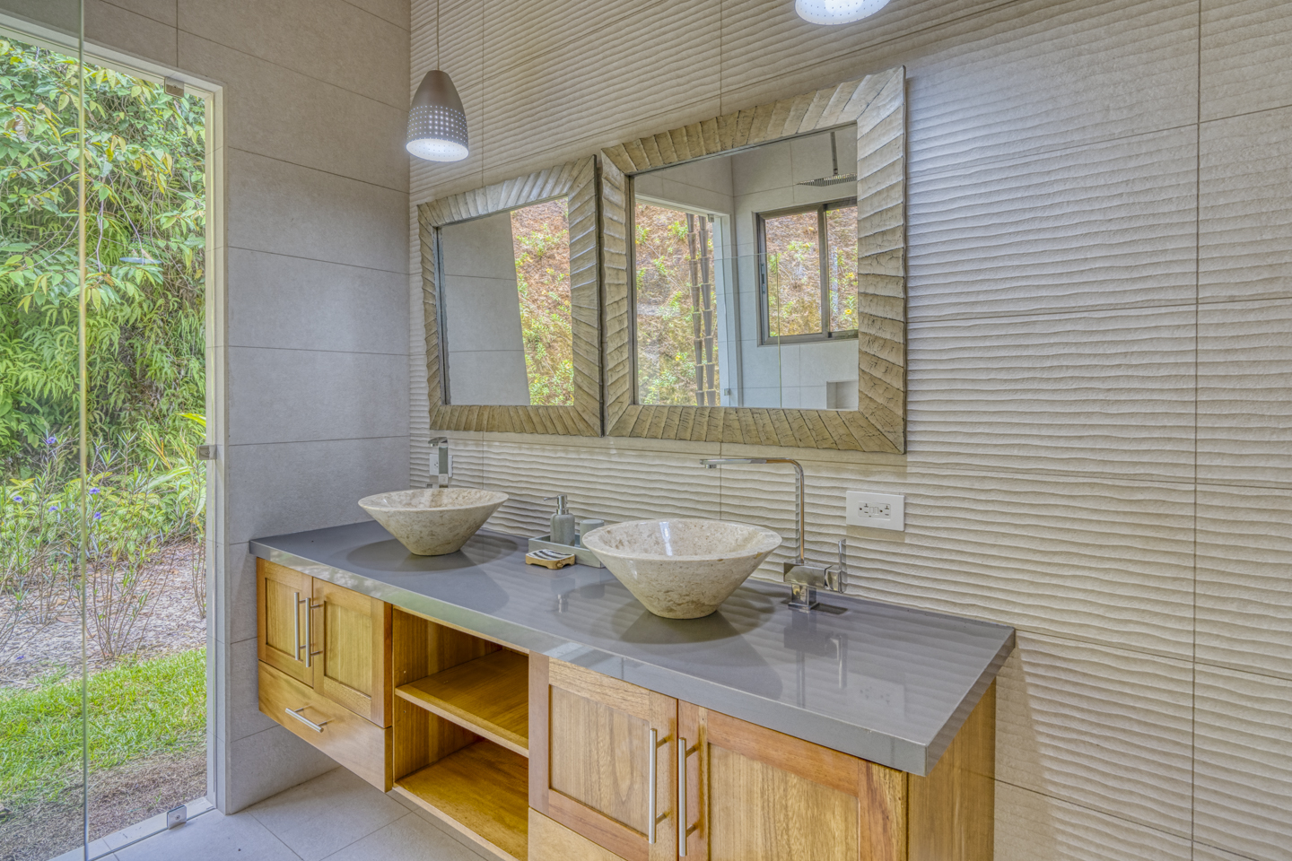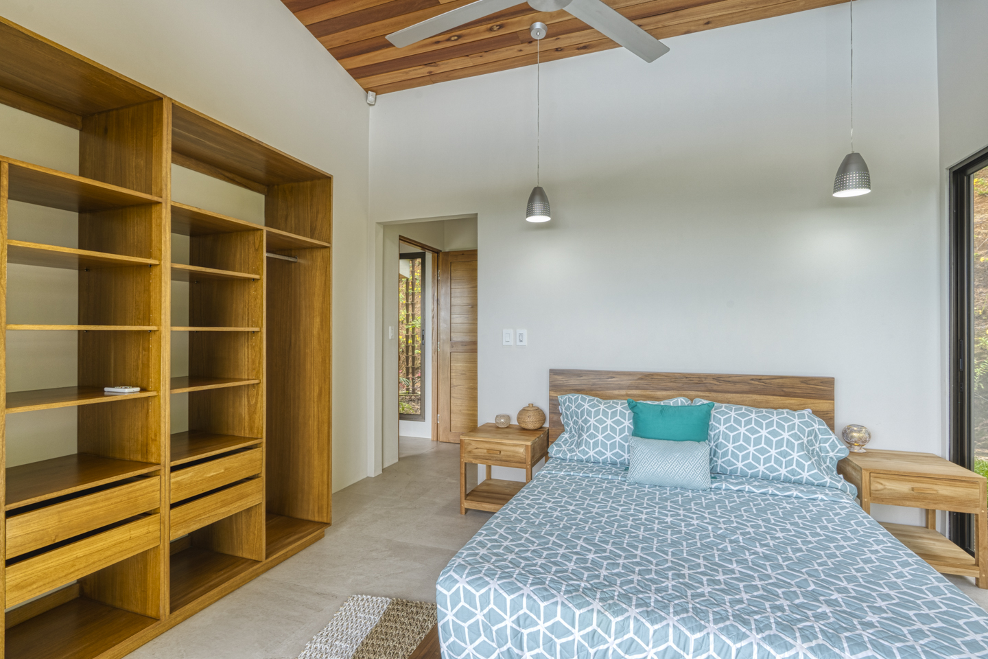 The entire master suite is an ocean-view owner’s retreat, complete with a huge custom closet dressing room. It features a private Bali spa-style bathtub, and a deck overlooking the backyard and ocean. It feels very spa-like amidst the local flowers and trees and ocean views to just soak in a luxurious bath. The suite also includes a separate deck area steps from the bed. The second master suite includes built-in wooden shelves, a wooden headboard, and your own private patio. The ensuite bathroom features two marble vessel sinks, a double vanity, and a glass-enclosed shower with window-access to the outdoor garden. It makes you feel like it’s an outdoor shower in the garden. The third bedroom is unfurnished for now.