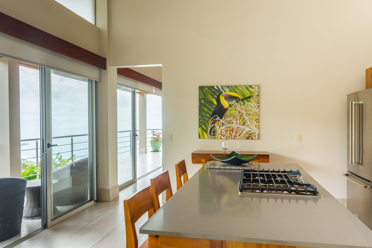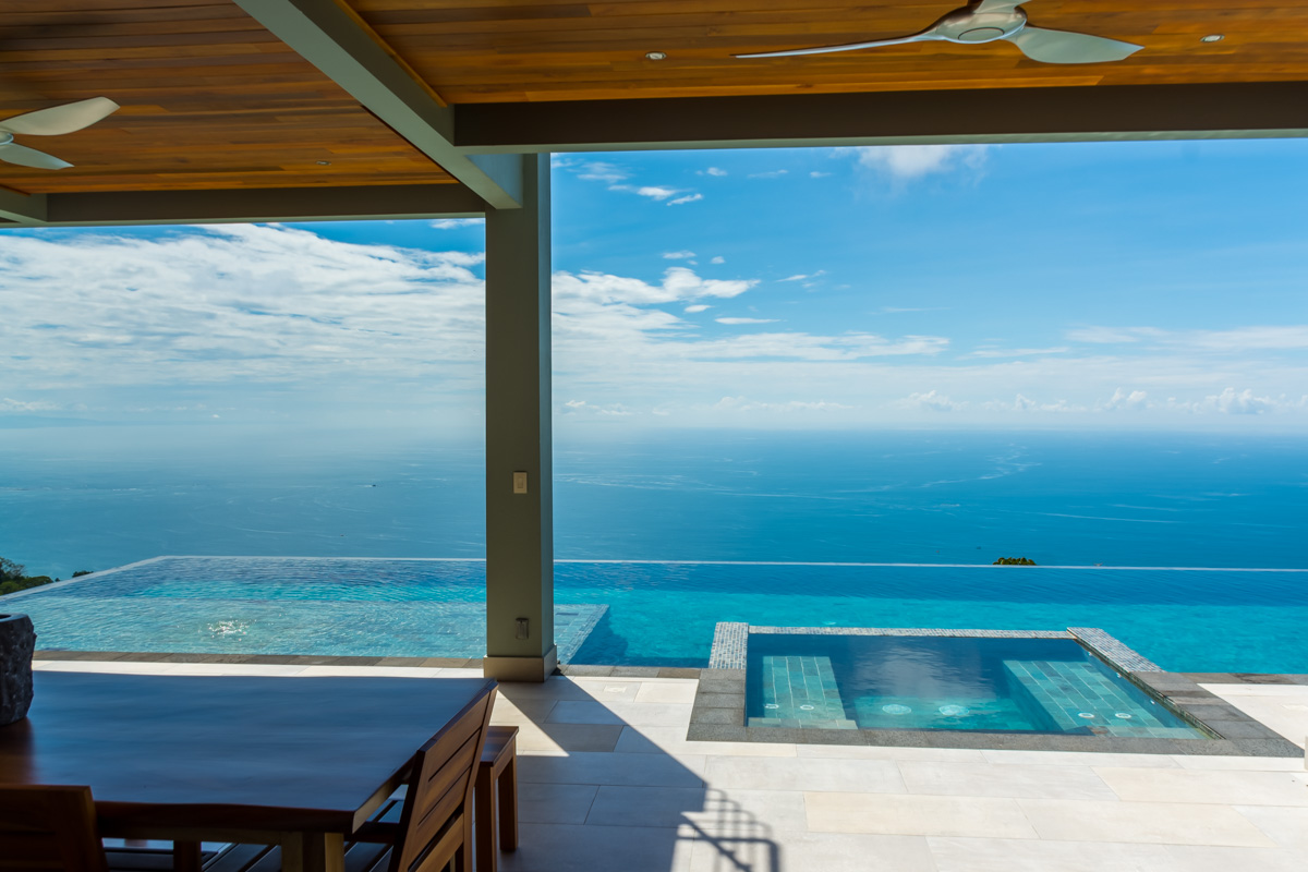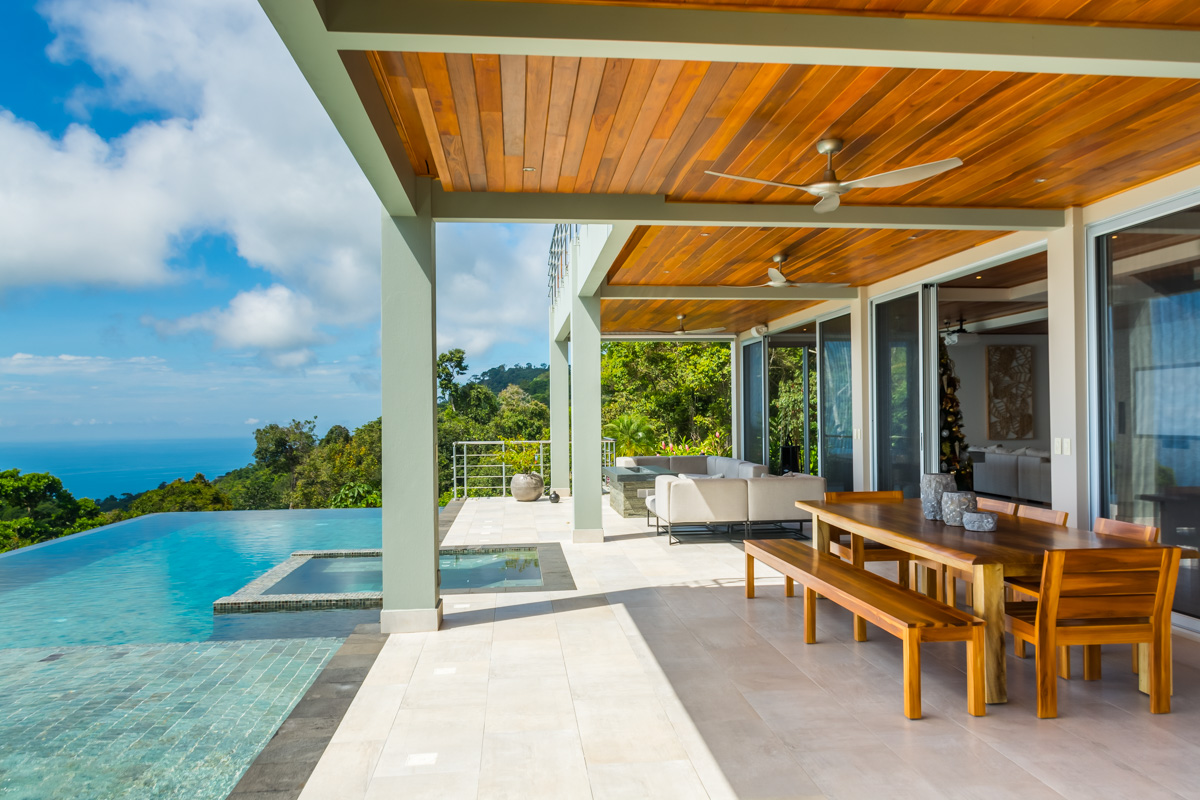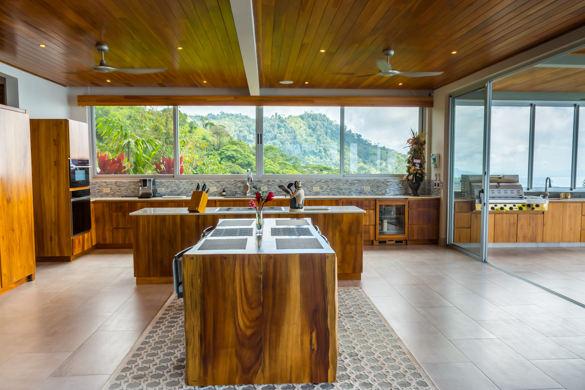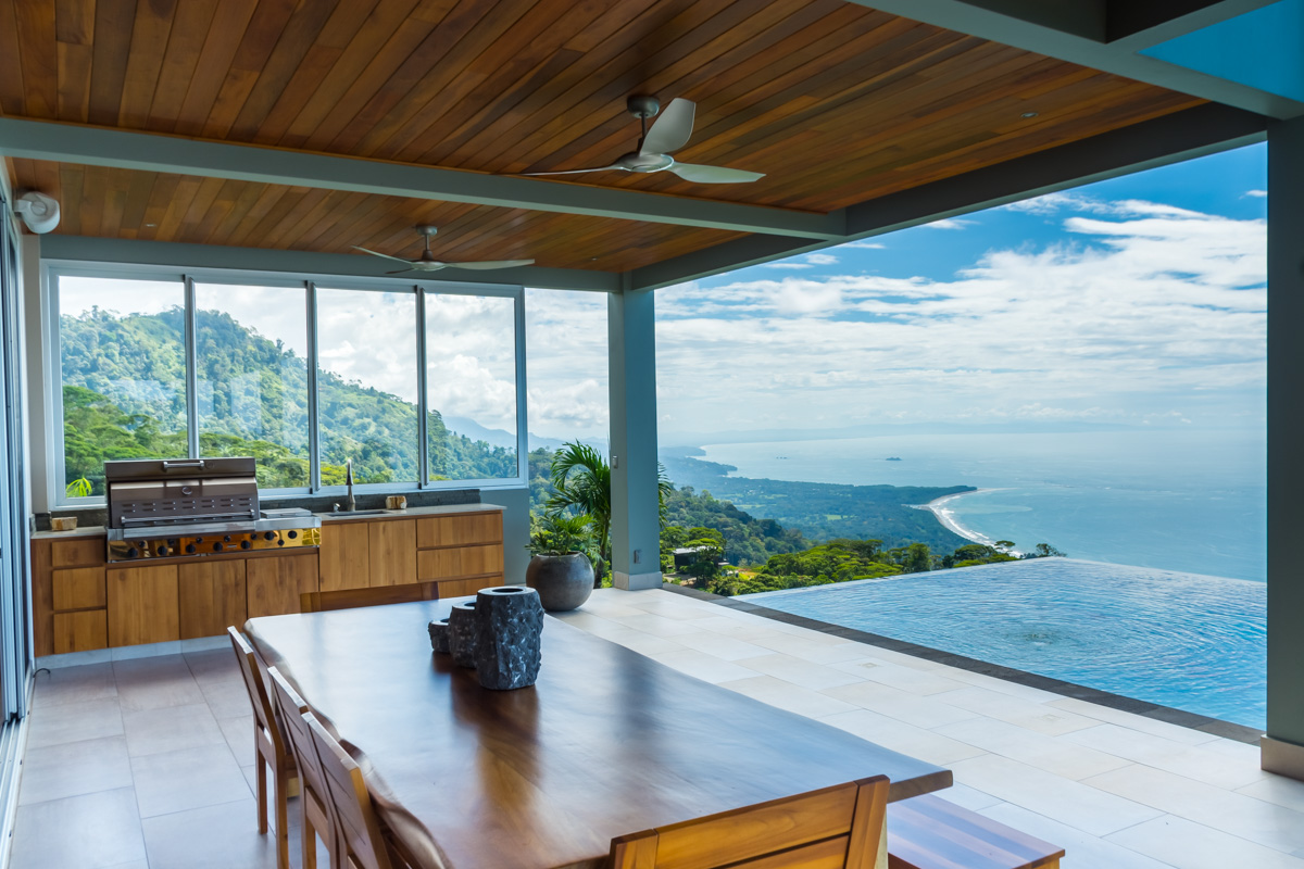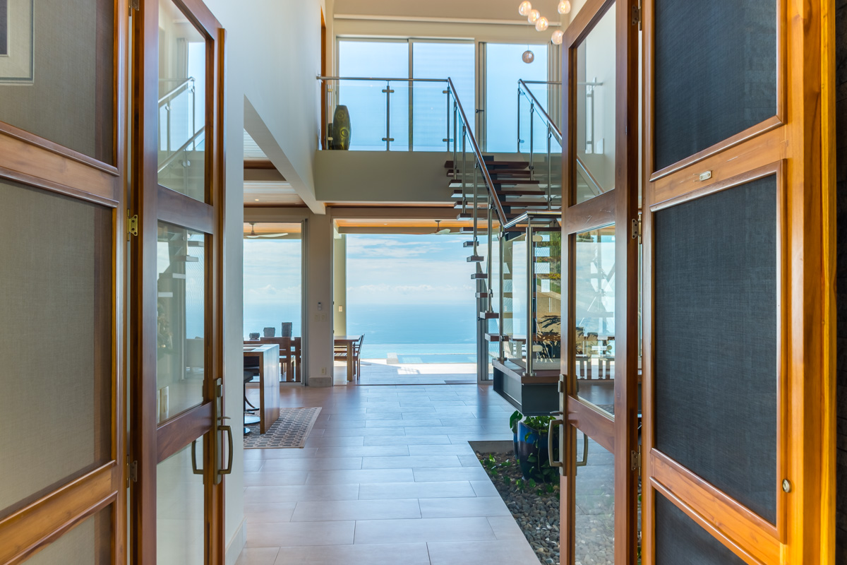 Amazing ocean views are seen through the glass doors and windows of this jaw-dropping luxury home as you approach. You will frequently be greeted by toucans, monkeys, or other beautiful wildlife in the large trees with epic ocean views in the background. When you pull into the paved and covered and head towards the front door, you can feel the environment’s natural beauty. The impressive luxury touches of this home immediately become evident. As you head toward the front door, you notice the lush and colorful landscaping and tropical plants. When entering the house, the floor plan opens to a vast vantage point of 180-degree ocean views through the all-glass main area.
