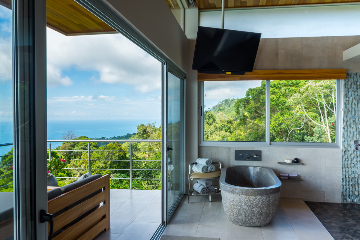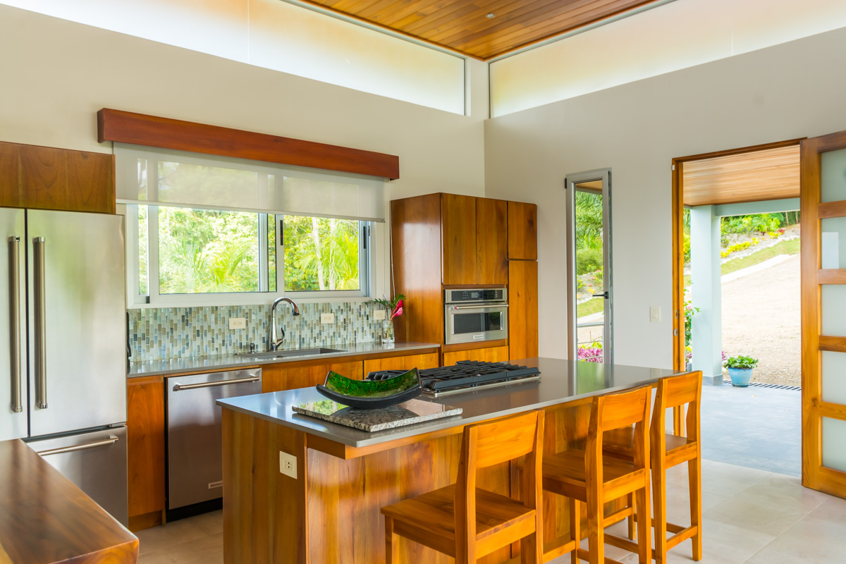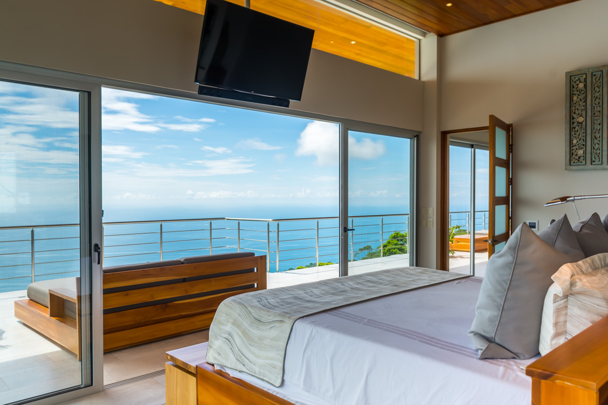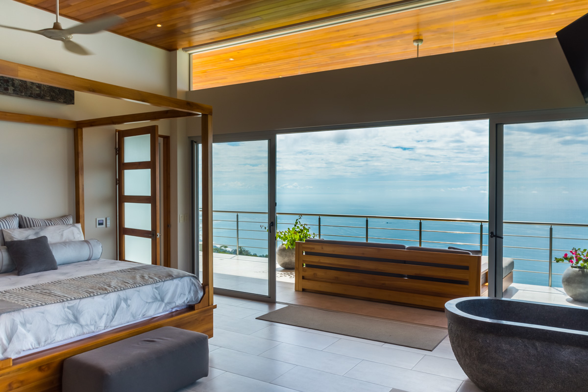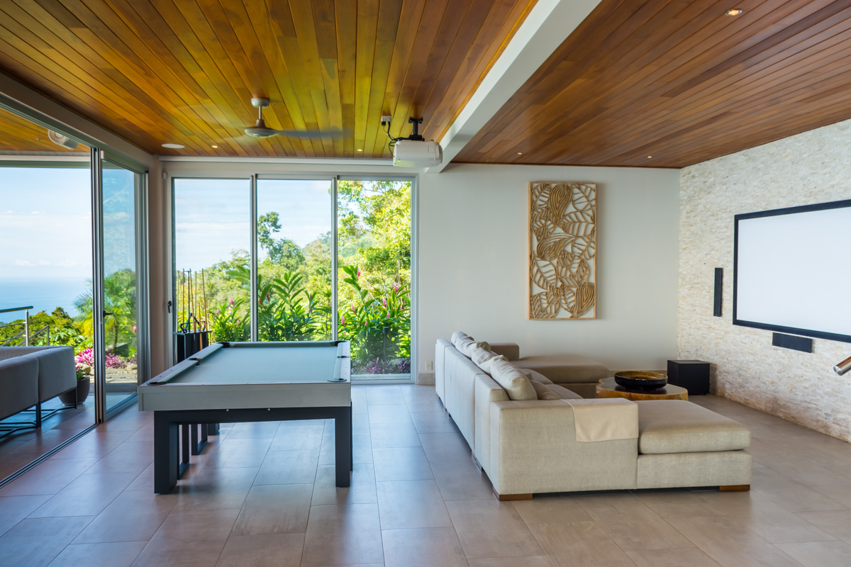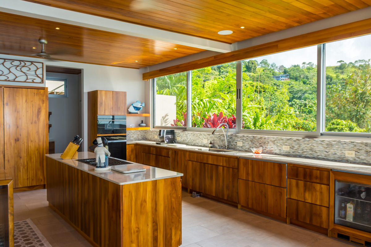 Amazing ocean views are seen through the glass doors and windows of this jaw-dropping luxury home as you approach. You will frequently be greeted by toucans, monkeys, or other beautiful wildlife in the large trees with epic ocean views in the background. When you pull into the paved and covered and head towards the front door, you can feel the environment’s natural beauty. The impressive luxury touches of this home immediately become evident. As you head toward the front door, you notice the lush and colorful landscaping and tropical plants. When entering the house, the floor plan opens to a vast vantage point of 180-degree ocean views through the all-glass main area.