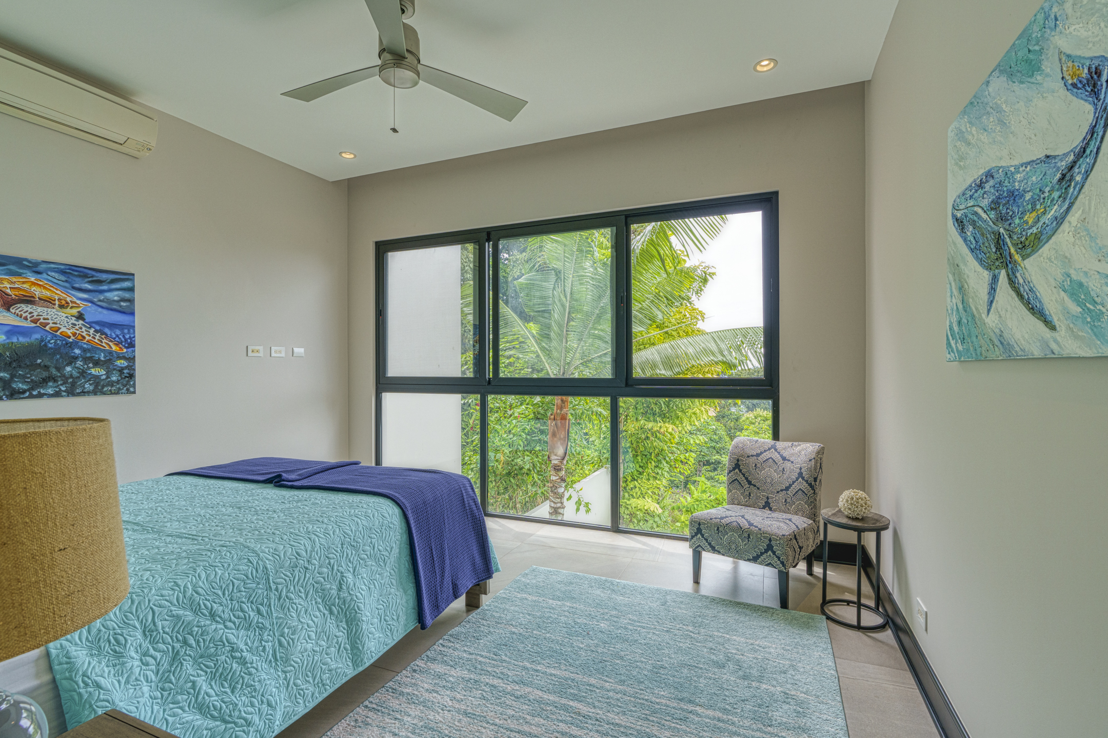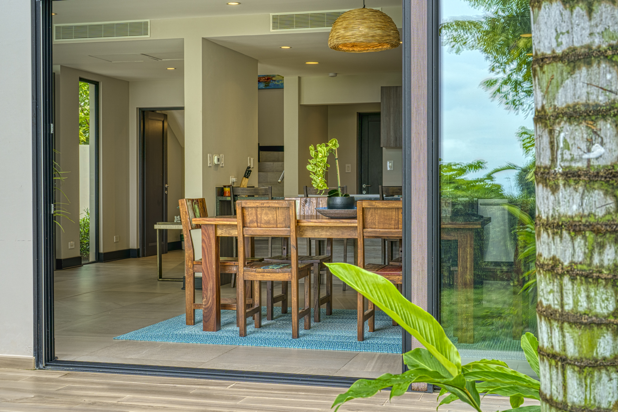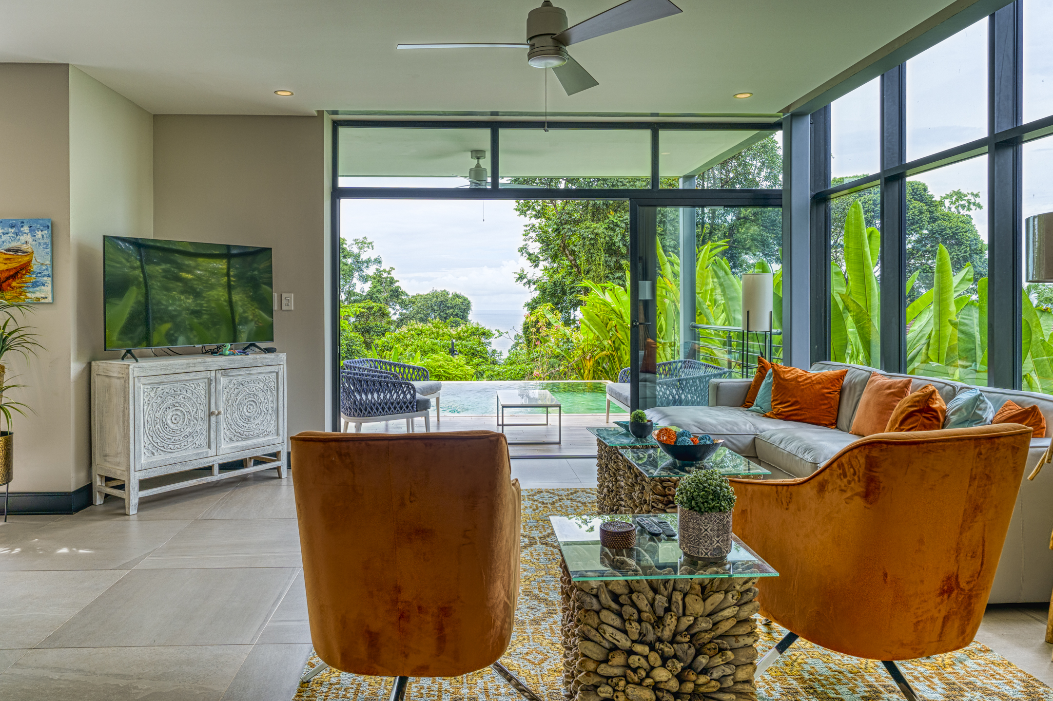 Each of the three ensuite bedrooms is spacious and boasts ample closet space. Clean lines and large floor to ceiling windows make the lush greenery and cool ocean breezes the focal point of the villa. Every room in the house has views of the jungle or the Pacific Ocean; some rooms have both!