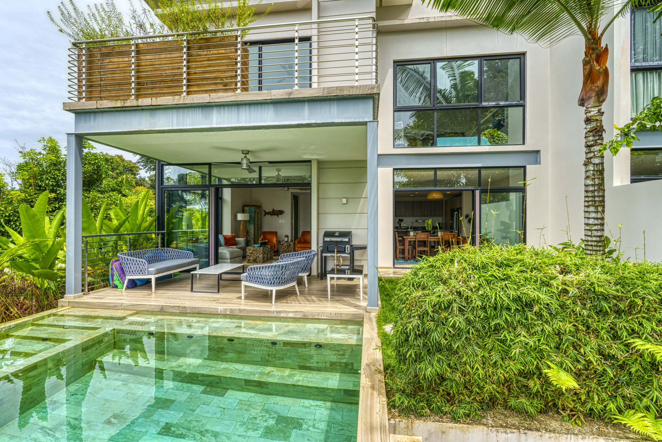 San Martin is home to a large ex-pat community that enjoys the laidback lifestyle and natural surroundings. Terraces de San Martin is one of many gated communities in this area that house a mix of holiday homes and permanent dwellings for ex-pats. This particular gated community was built on the edge of jungle preserve land and on bluffs overlooking San Martin beach, offering some of the most picturesque surroundings in the area. The villa has been built around the Pacific Ocean sunsets, maximizing views of the scenery and keeping your home private from neighboring properties.