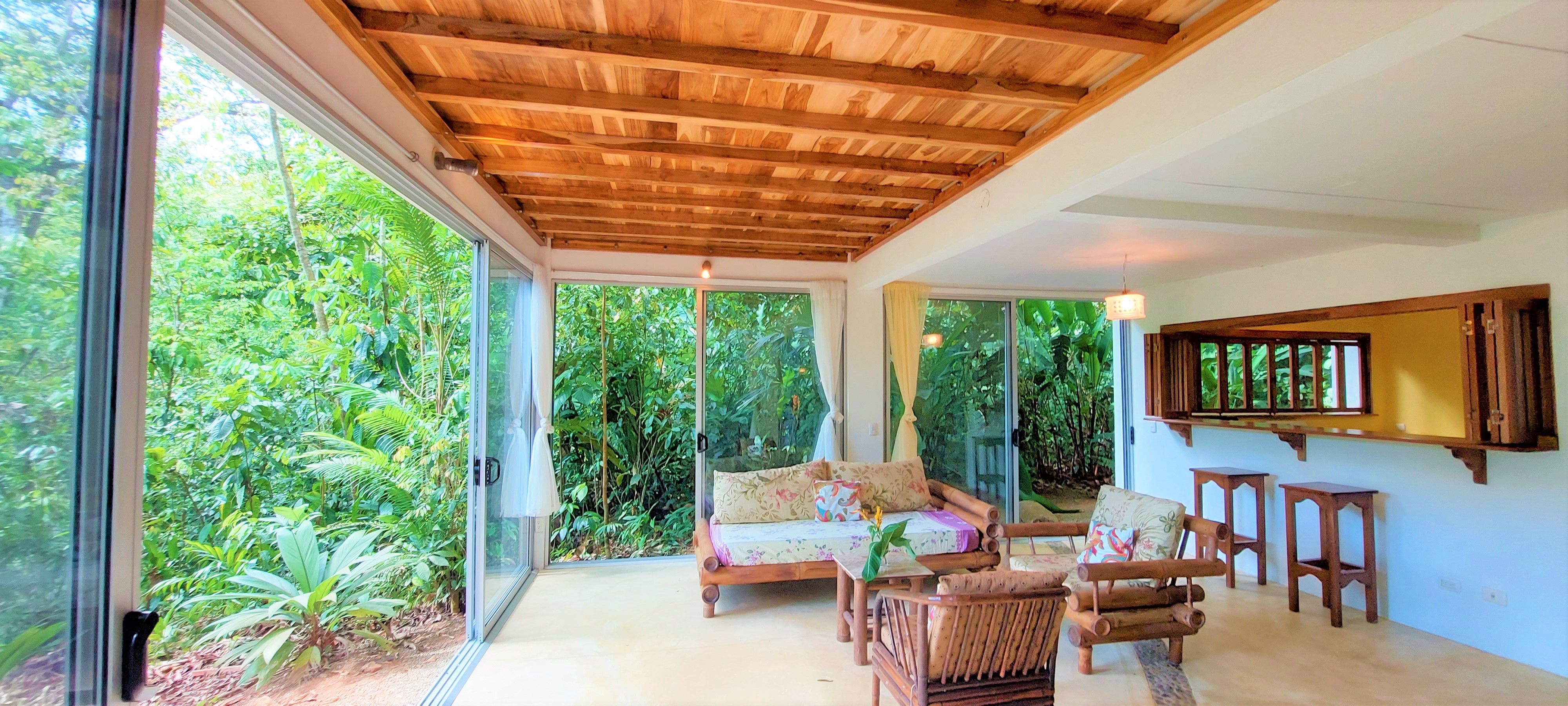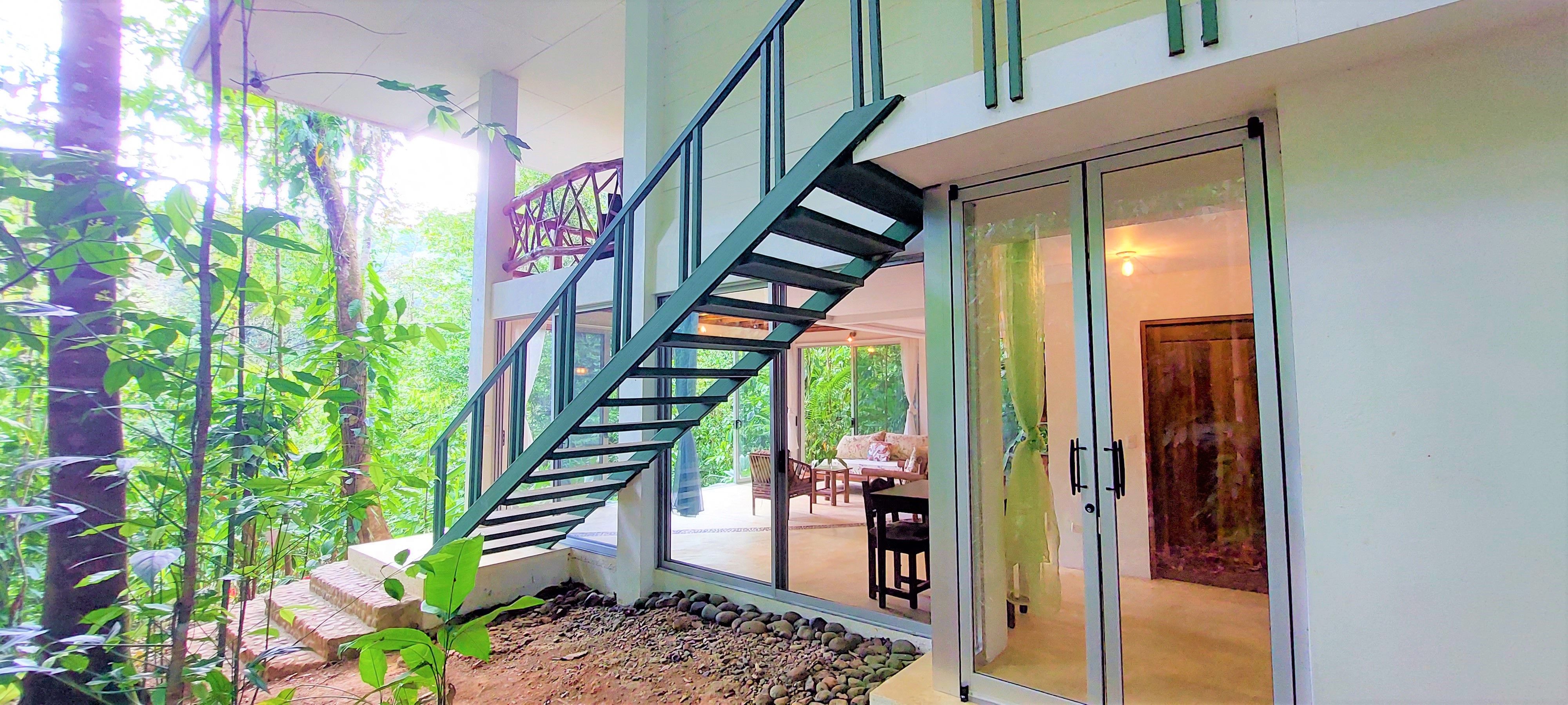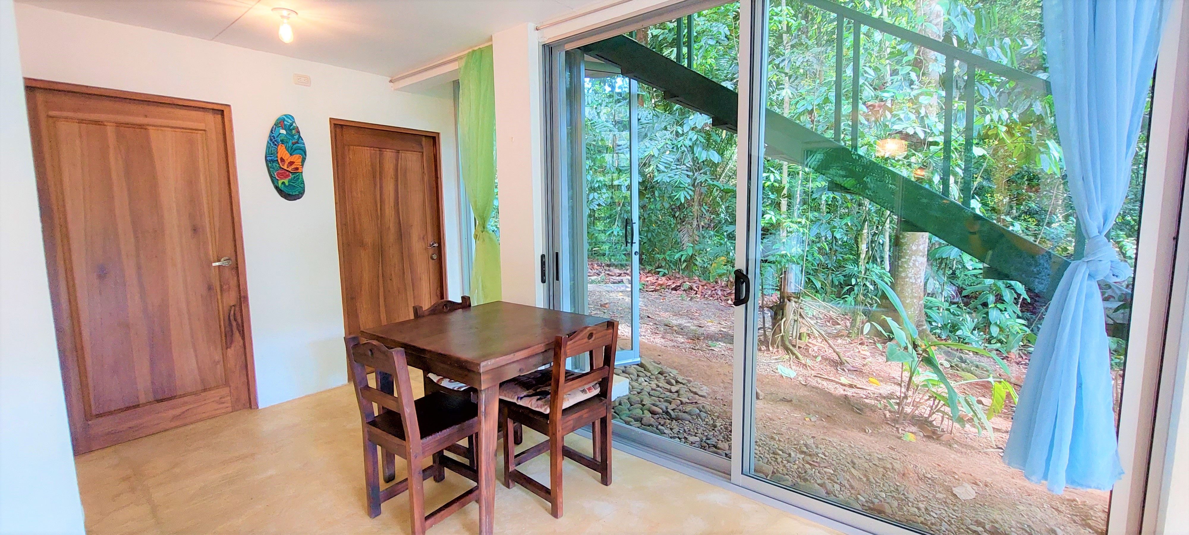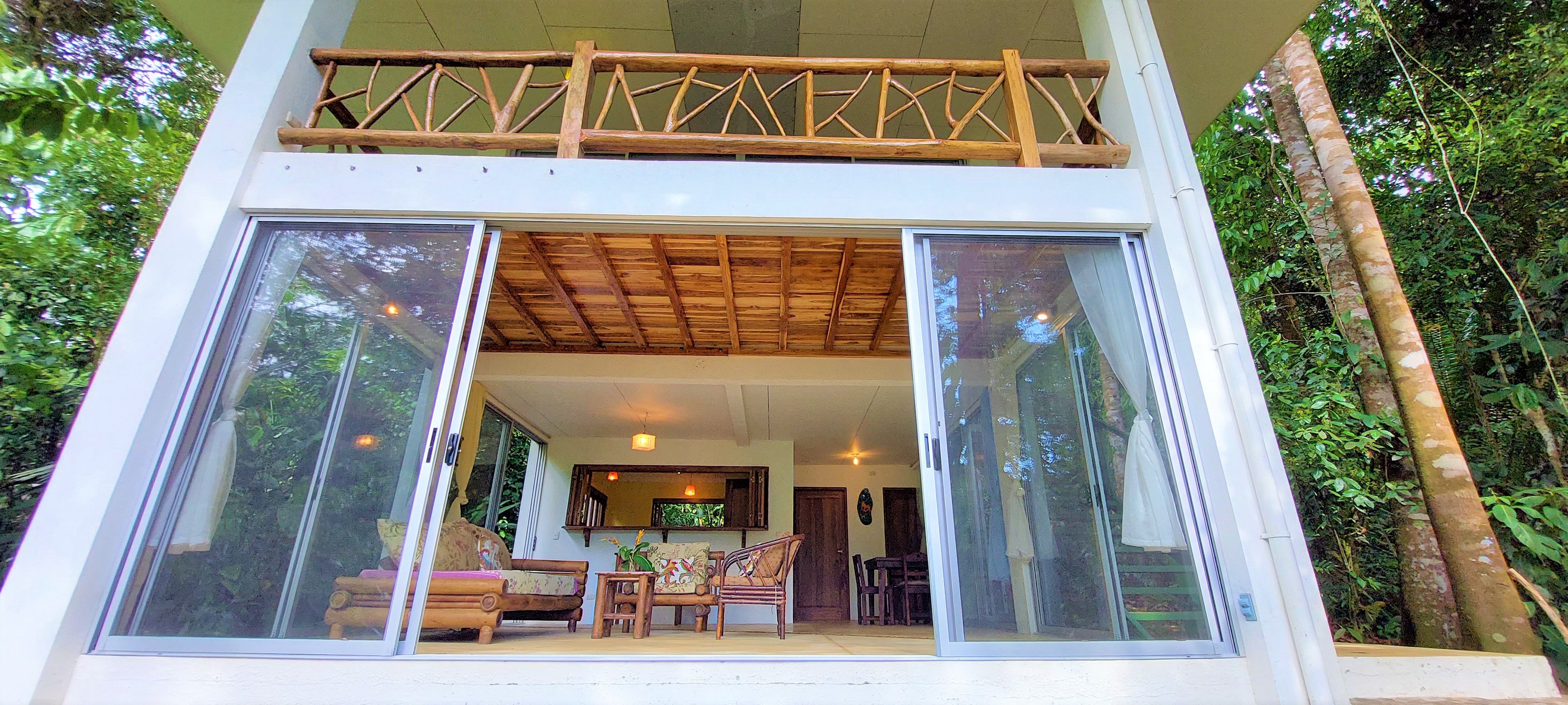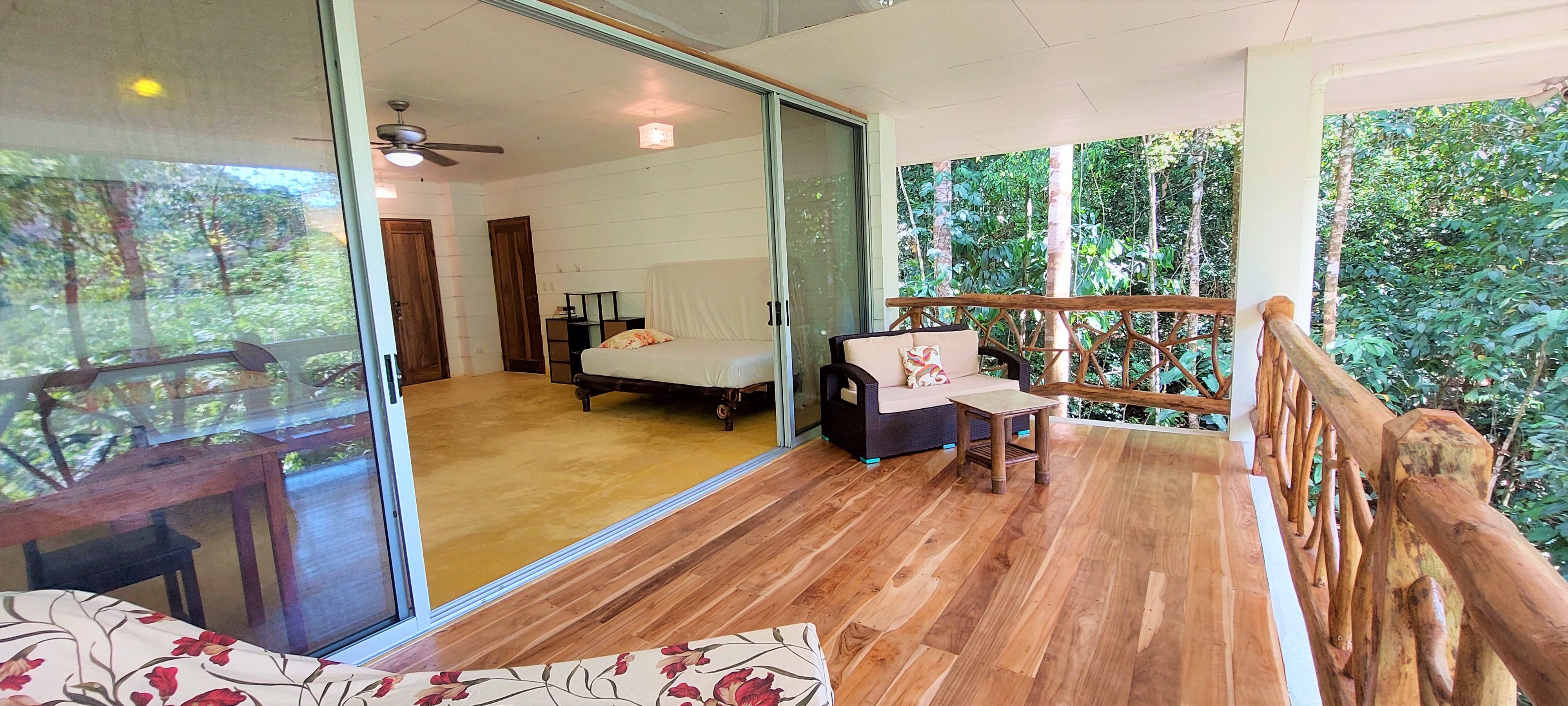 Casa Colibri: Casa Colibri is a two story home with 1 bedroom and 2 full bathrooms with over 1,000 SF of living space. On the first level there is a large open concept living and kitchen enclosed with glass doors/windows and screens, 1 full bathroom and a laundry. This area has opportunities to be extended with a large deck and a plenty of room for a pool. As you go upstairs, you will find a large bedroom, 1 full bathroom, owner’s closet and a large newly added teakwood balcony that overlooks the forest and the mountain on the other side of the river. This deck gives you the impression of living in your tree house since you are almost at the canopy level. The sounds of the river and the forest will give you a feeling of happiness, serenity and tranquility along the day.