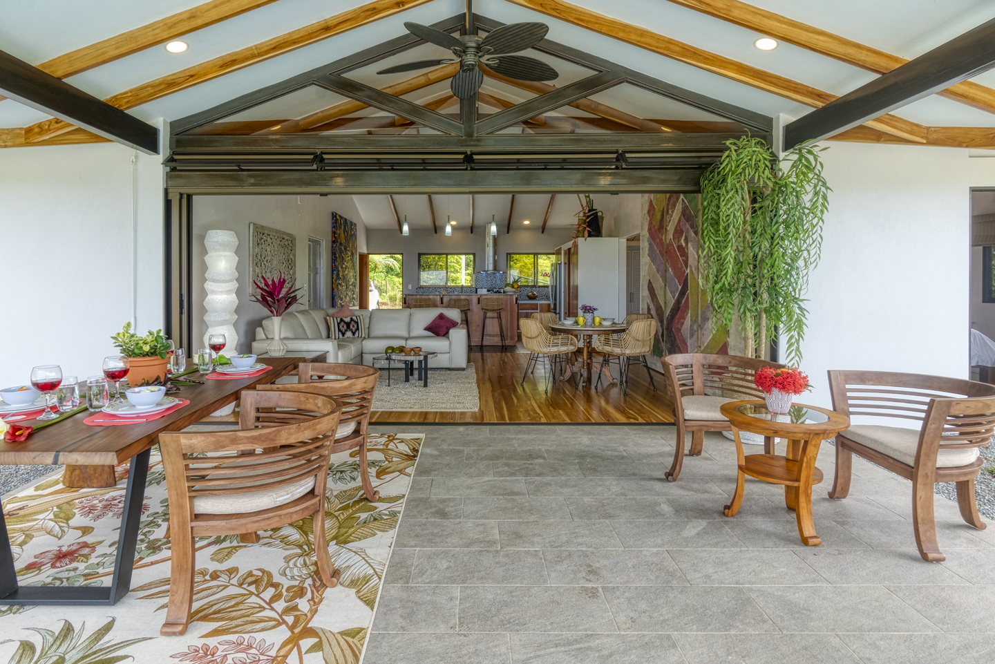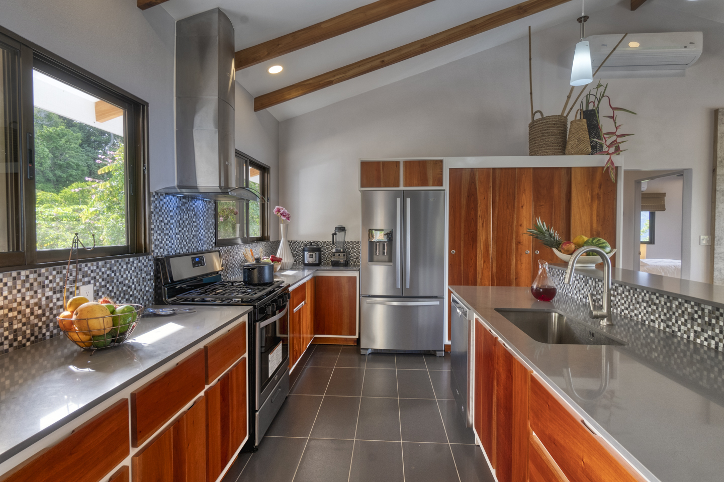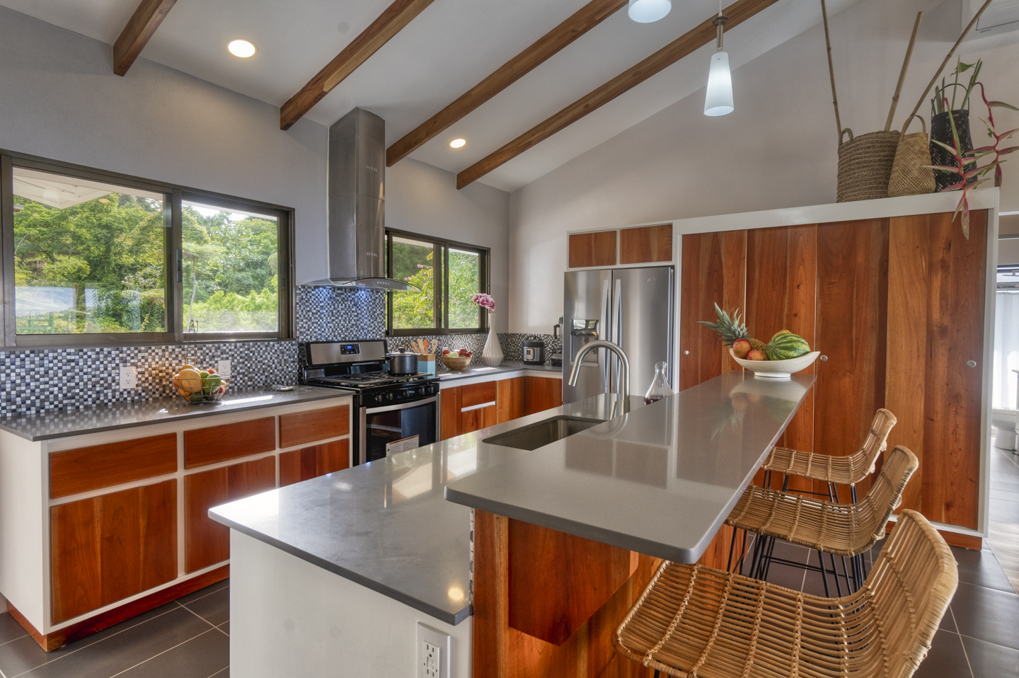 The entertaining spaces feature an eat-in kitchen with new appliances and a spacious living room. The magnificent windows in the living area can completely disappear, opening it to your outdoor patio and infinity pool. This is a truly stunning feature that makes guests drop their jaw. Each of these houses features three bedrooms and two bathrooms. Two of the bedrooms have ocean views and rainforest jungle views as well. The Master bedroom has an en-suite bathroom with two sinks. The other bathroom comfortably services guests and the other two bedrooms. Luxury home amenities include a spacious covered carport for two vehicles, a large storage locker for all of your beach and pool toys, and a covered deck.
