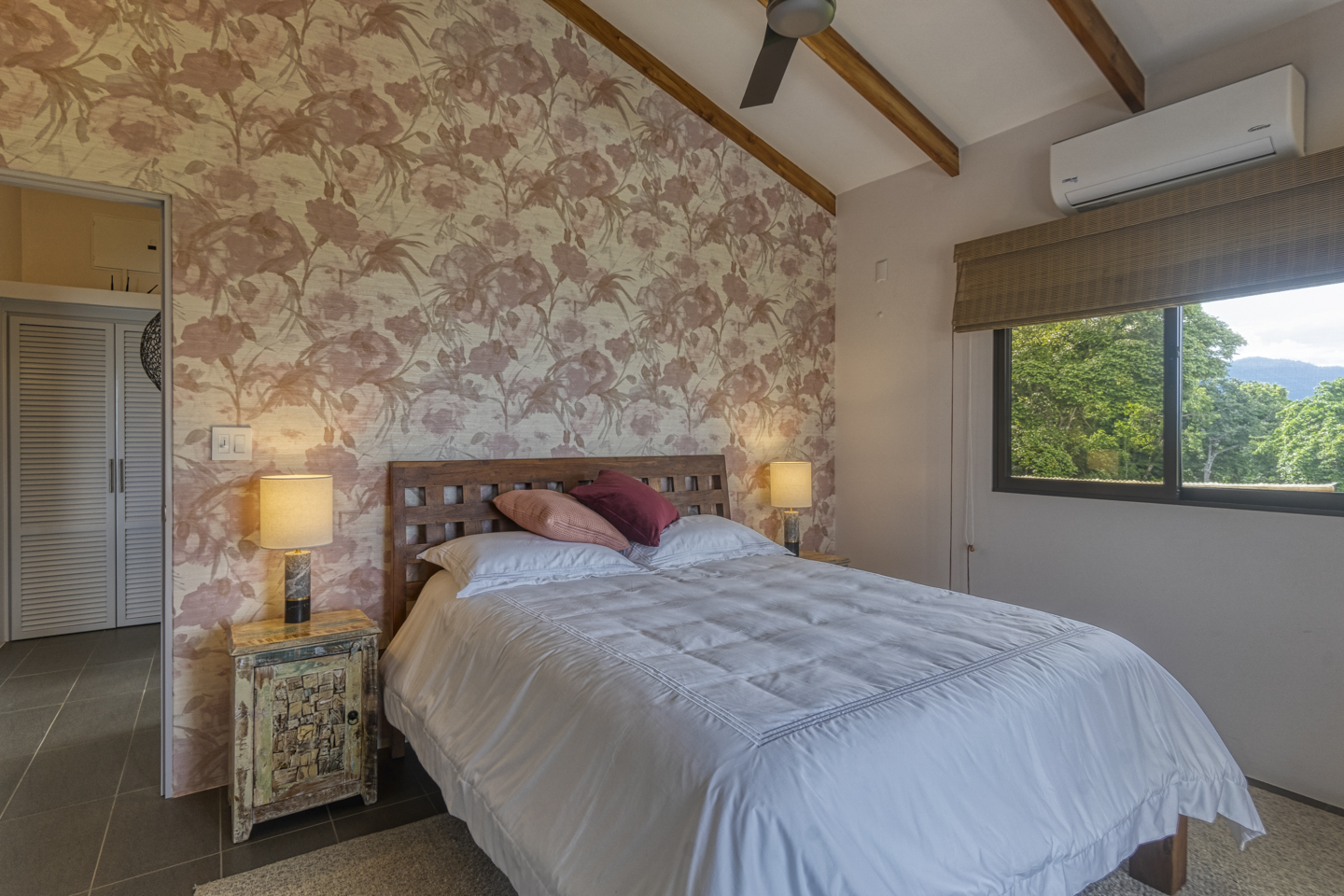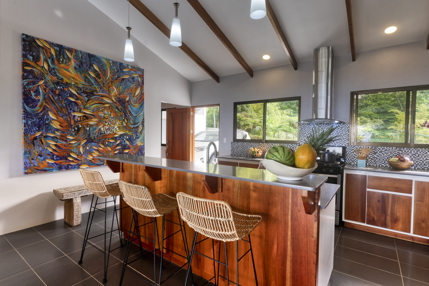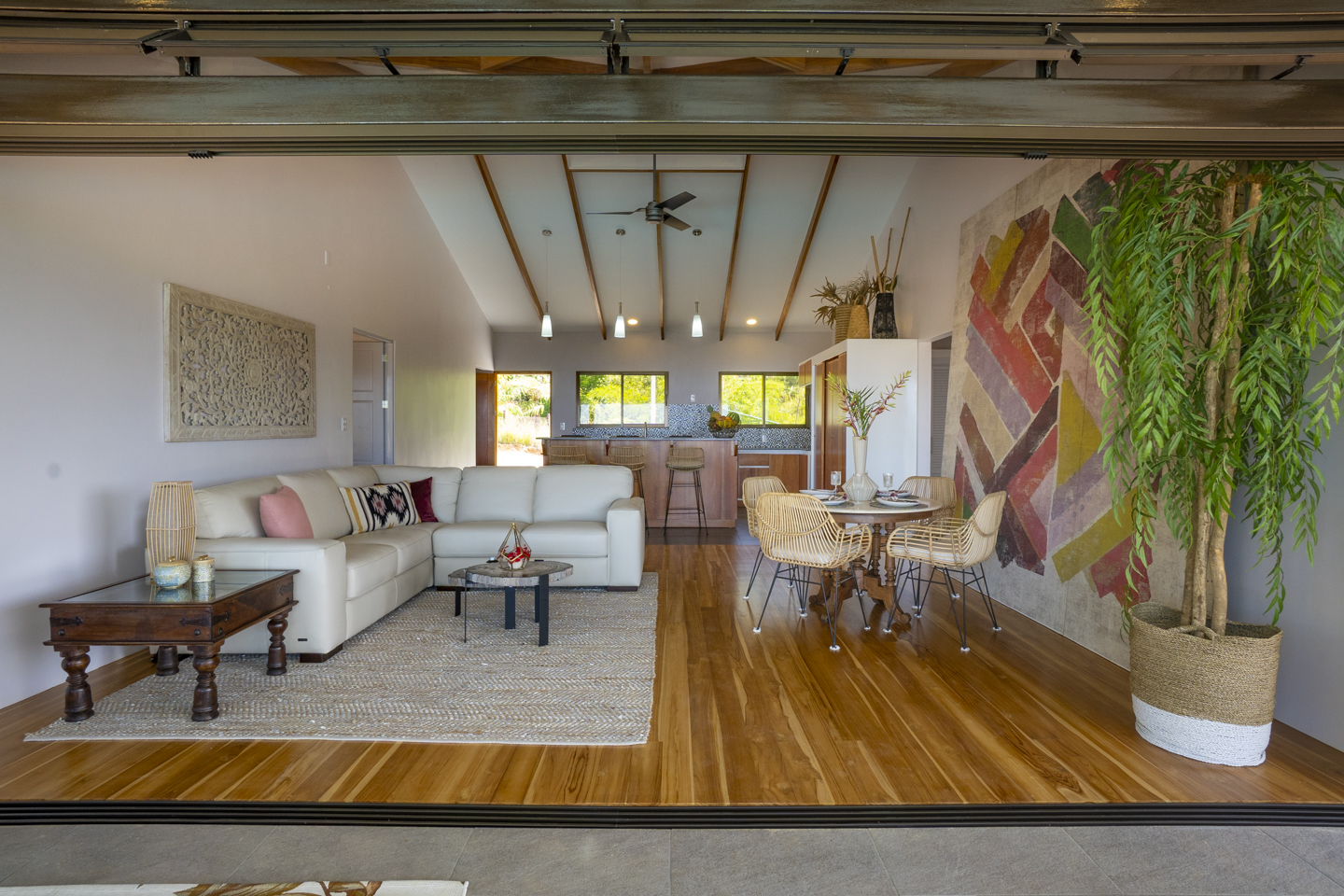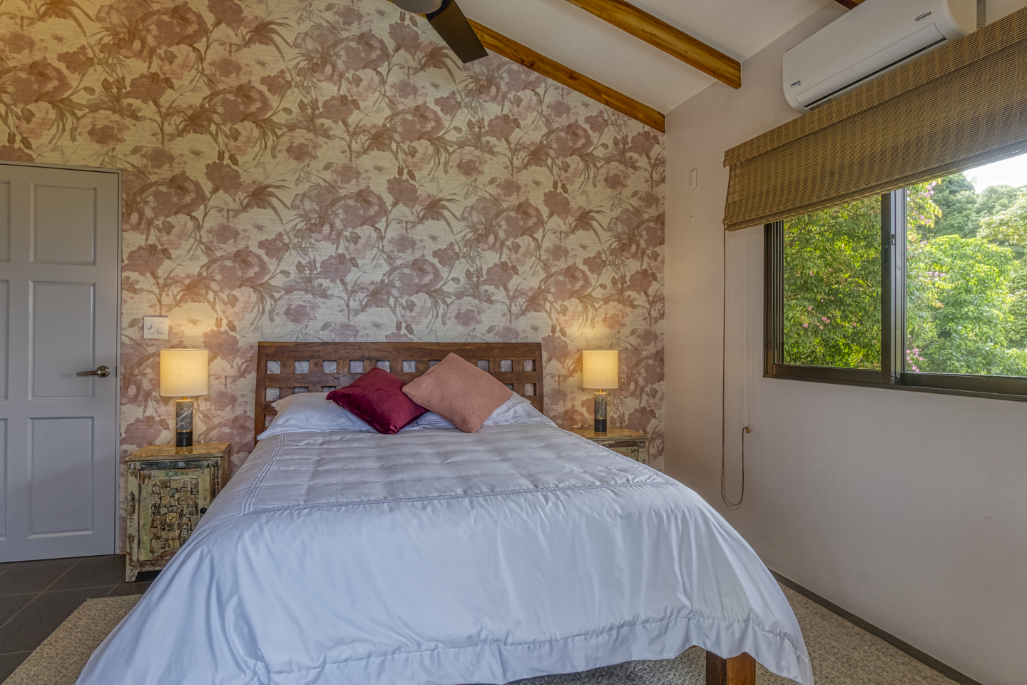 The entertaining spaces feature an eat-in kitchen with new appliances and a spacious living room. The magnificent windows in the living area can completely disappear, opening it to your outdoor patio and infinity pool. This is a truly stunning feature that makes guests drop their jaw. Each of these houses features three bedrooms and two bathrooms. Two of the bedrooms have ocean views and rainforest jungle views as well. The Master bedroom has an en-suite bathroom with two sinks. The other bathroom comfortably services guests and the other two bedrooms. Luxury home amenities include a spacious covered carport for two vehicles, a large storage locker for all of your beach and pool toys, and a covered deck.