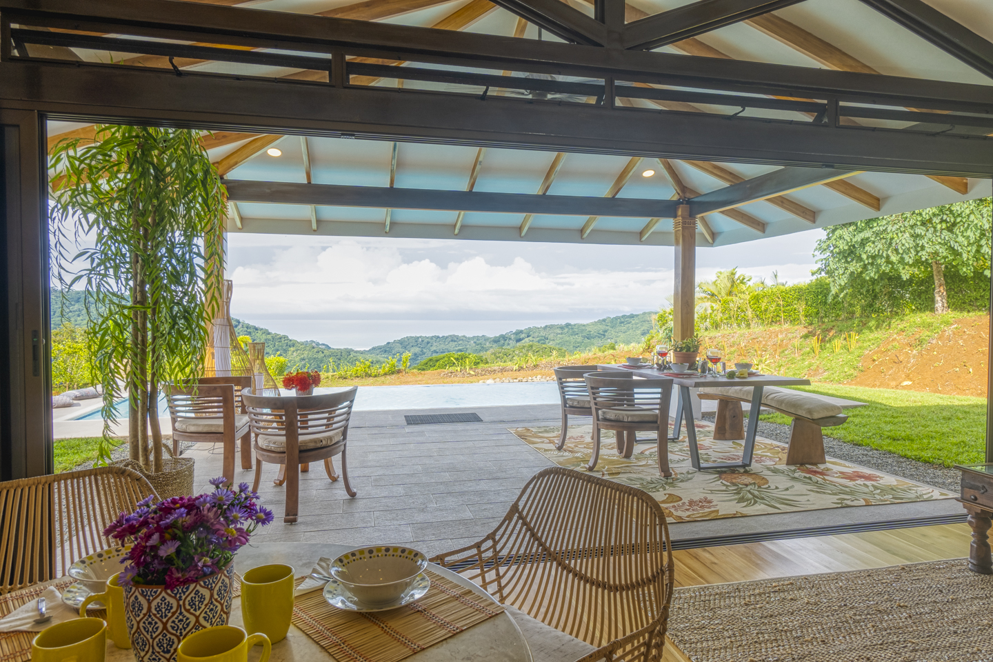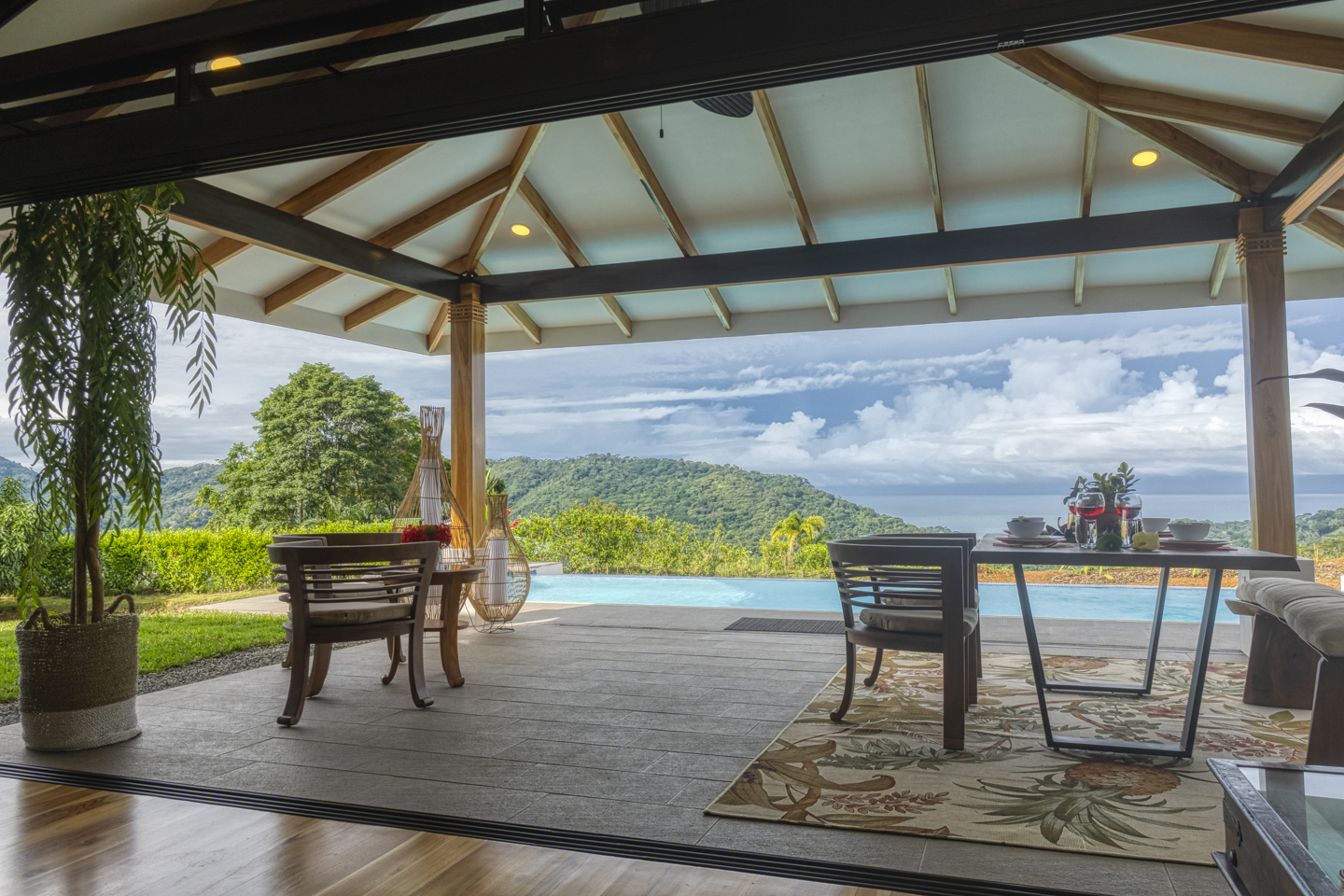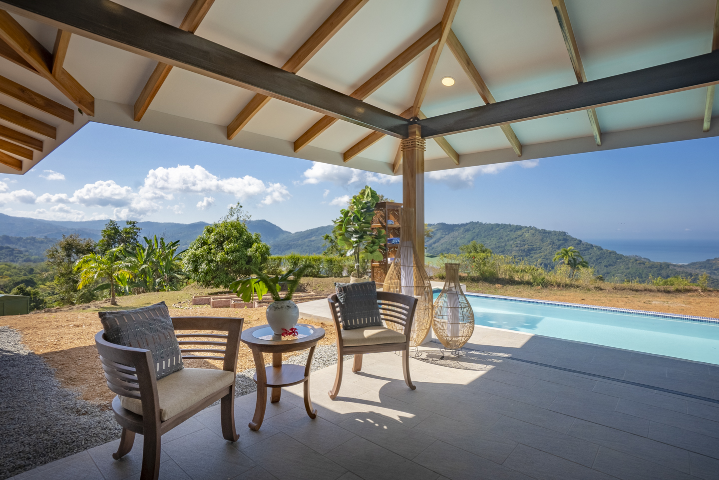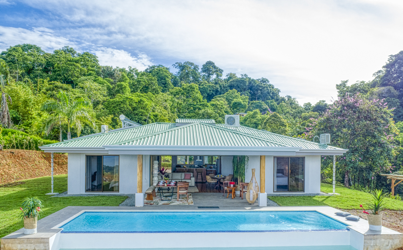 These new homes were designed with picturesque Costa Rica setting in mind. You can feel the fresh mountain air and bright sunshine from every room in these homes, but especially from the outdoor patio and the infinity pool. As soon as you enter the home, you can see dramatic ocean views for miles. If you hear a large wave, it is because the sound is magnified, almost as if by a microphone. What an experience that is!