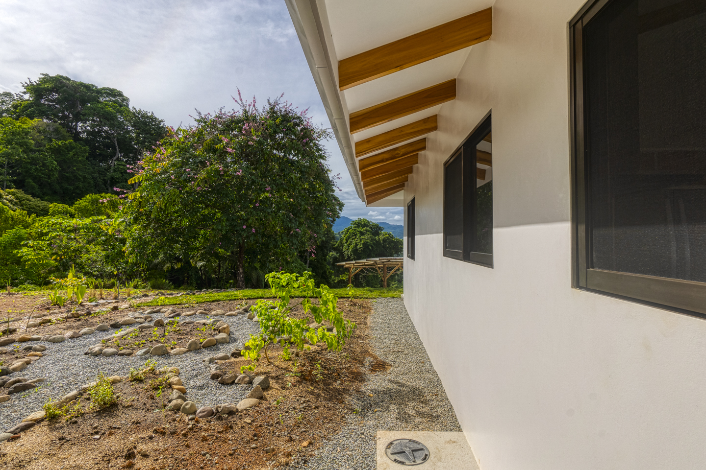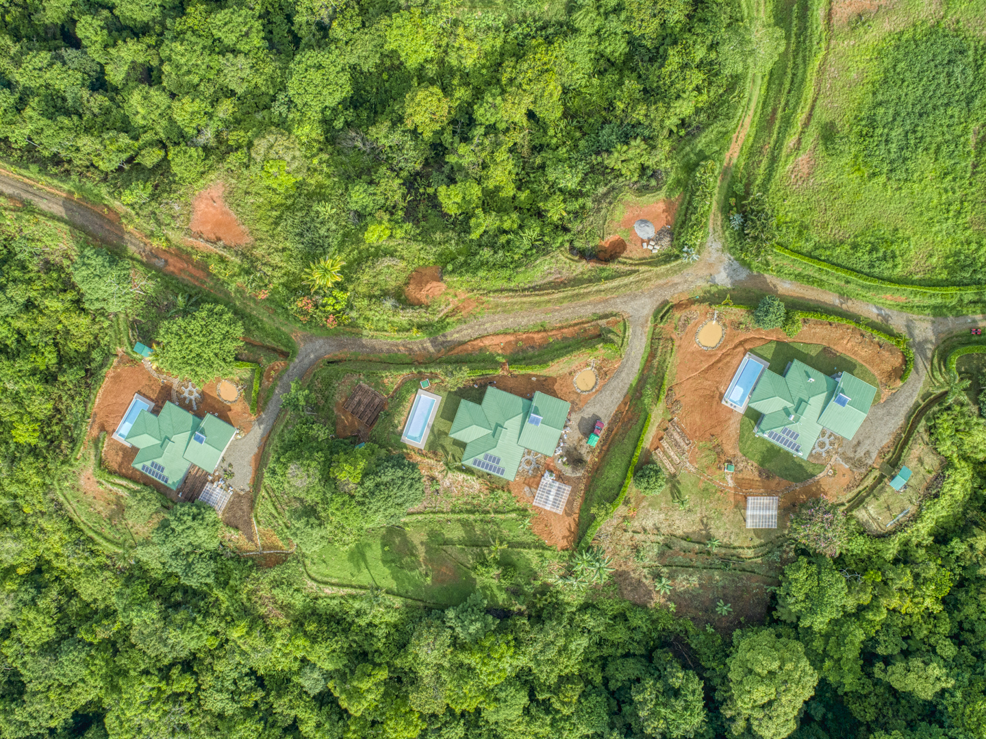 Many local tropical plants are spread throughout making it feel like a lush jungle. These houses or homesteads also serve as small sustainable farms. Each property comes with an outdoor vegetable garden, an exotic fruit orchard, a fishing pond, an herb garden, and a chicken coop. This area used to be a Cacao Plantation so the ground is fertile, and it is ideal for organic produce or a perennial garden. A natural creek runs through each lot too.