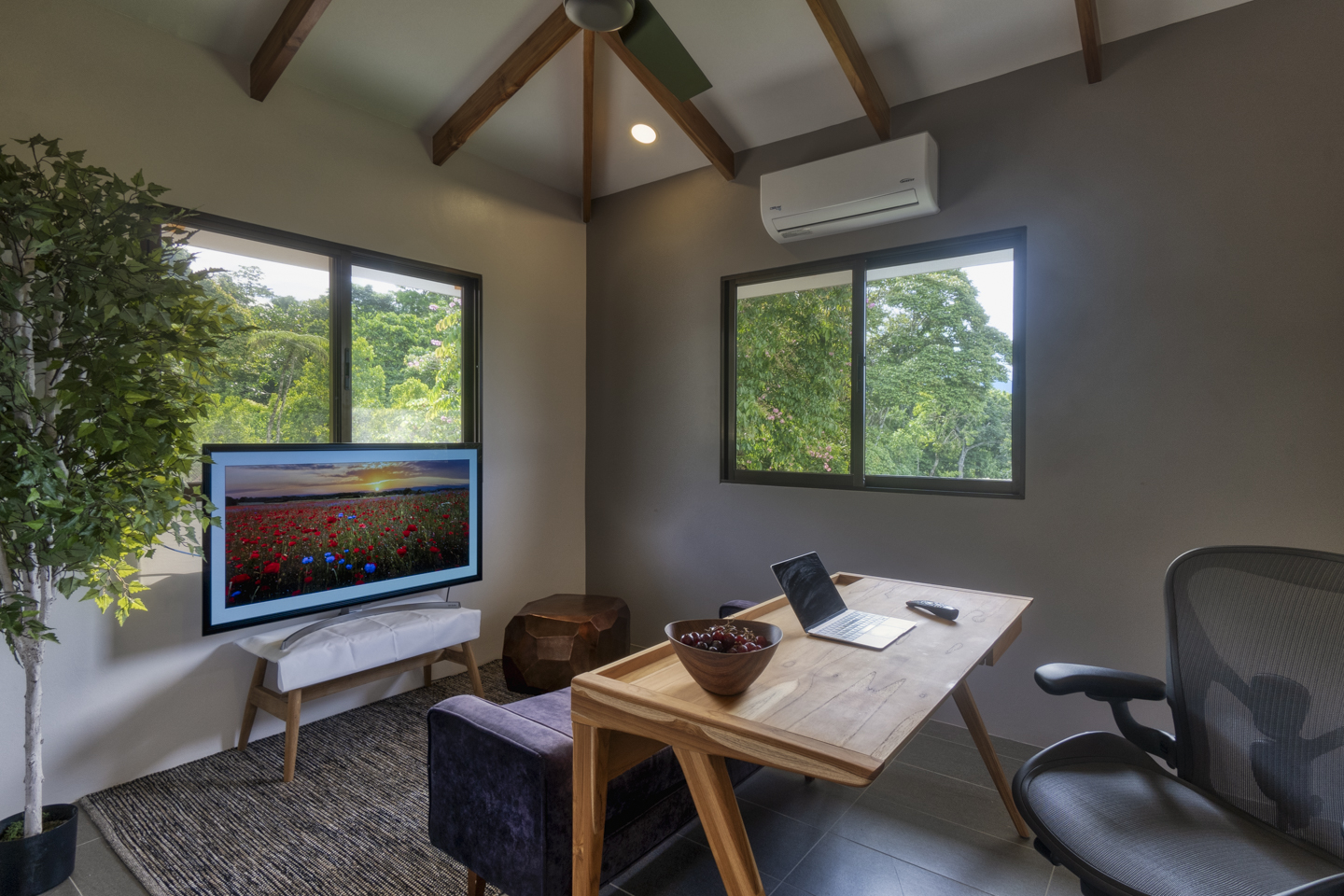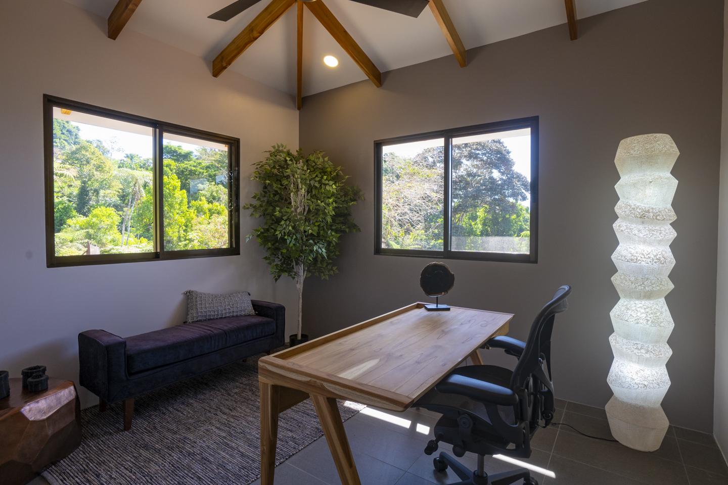 The modern design of these homes delivers both privacy and openness. The solid concrete walls are accented with gorgeous teak wood. Large glass windows either face the ocean or the lush rainforest jungle.