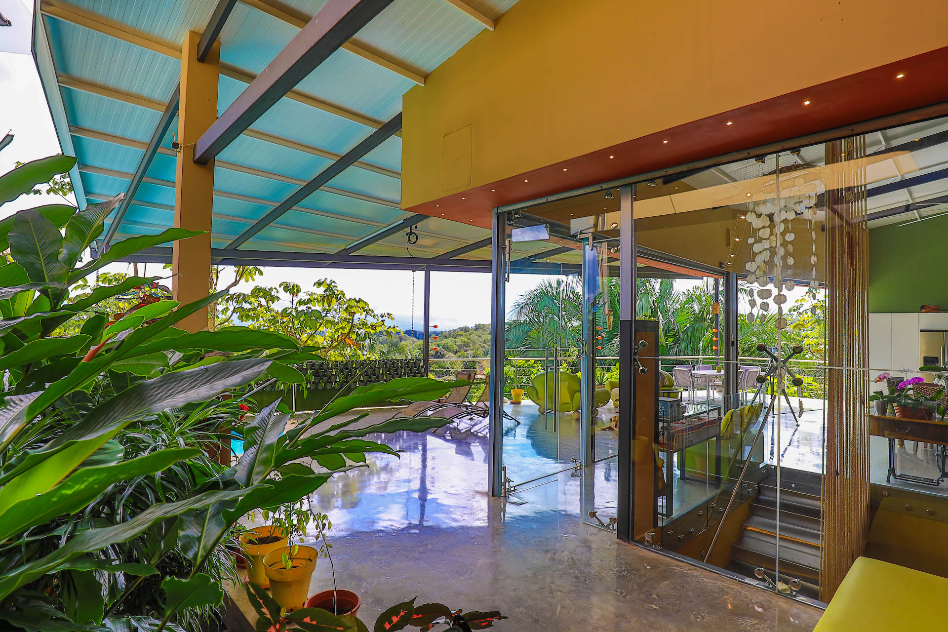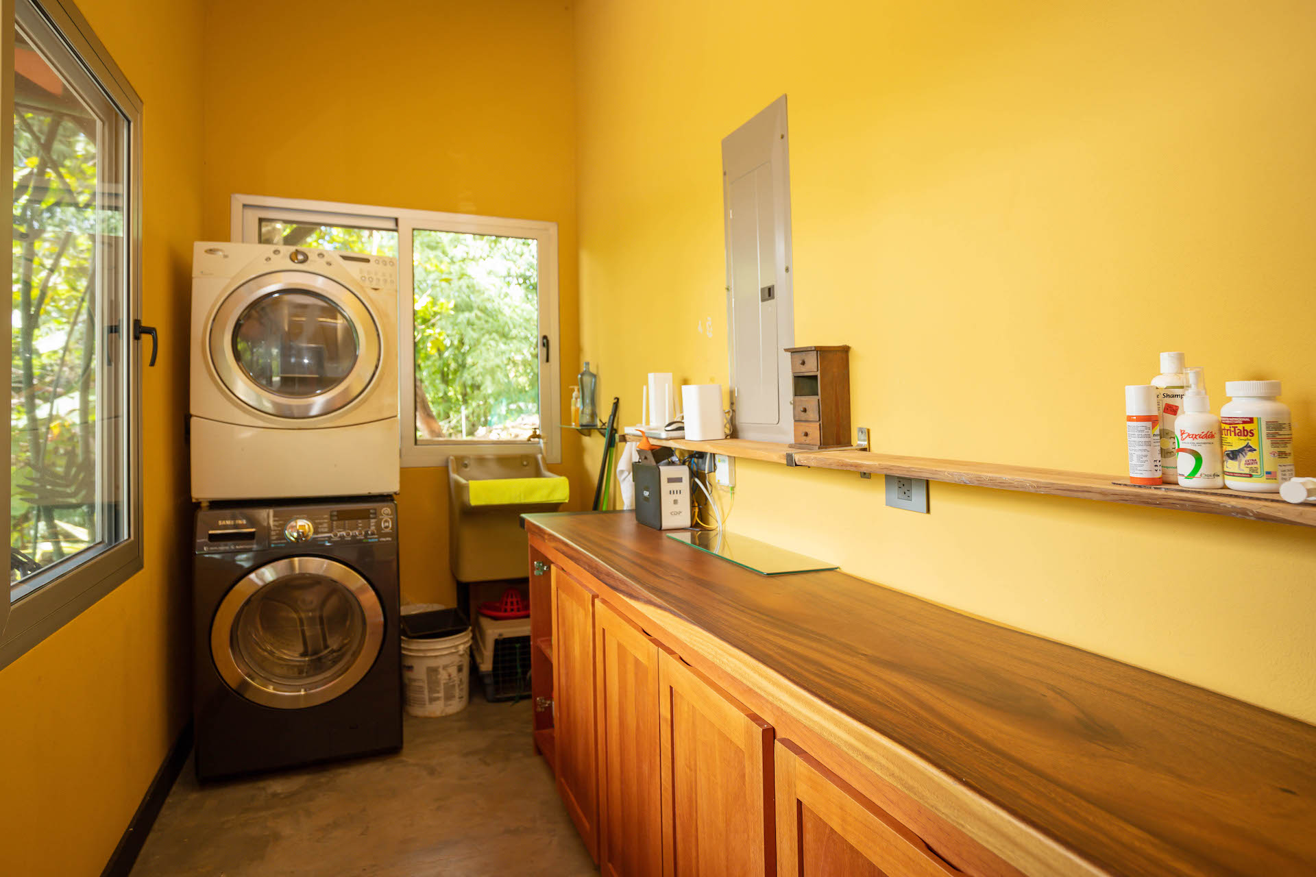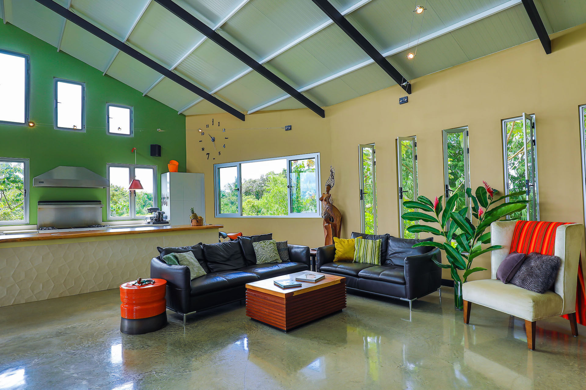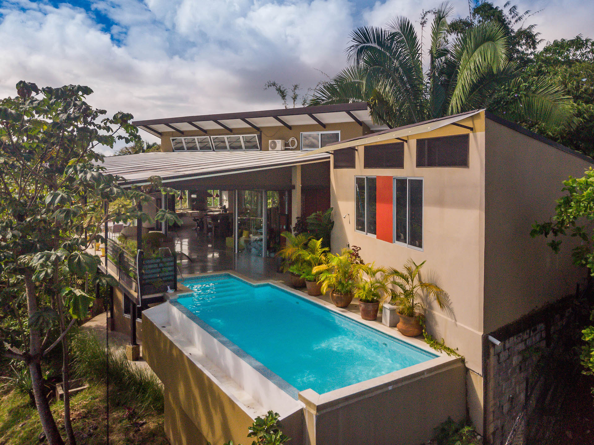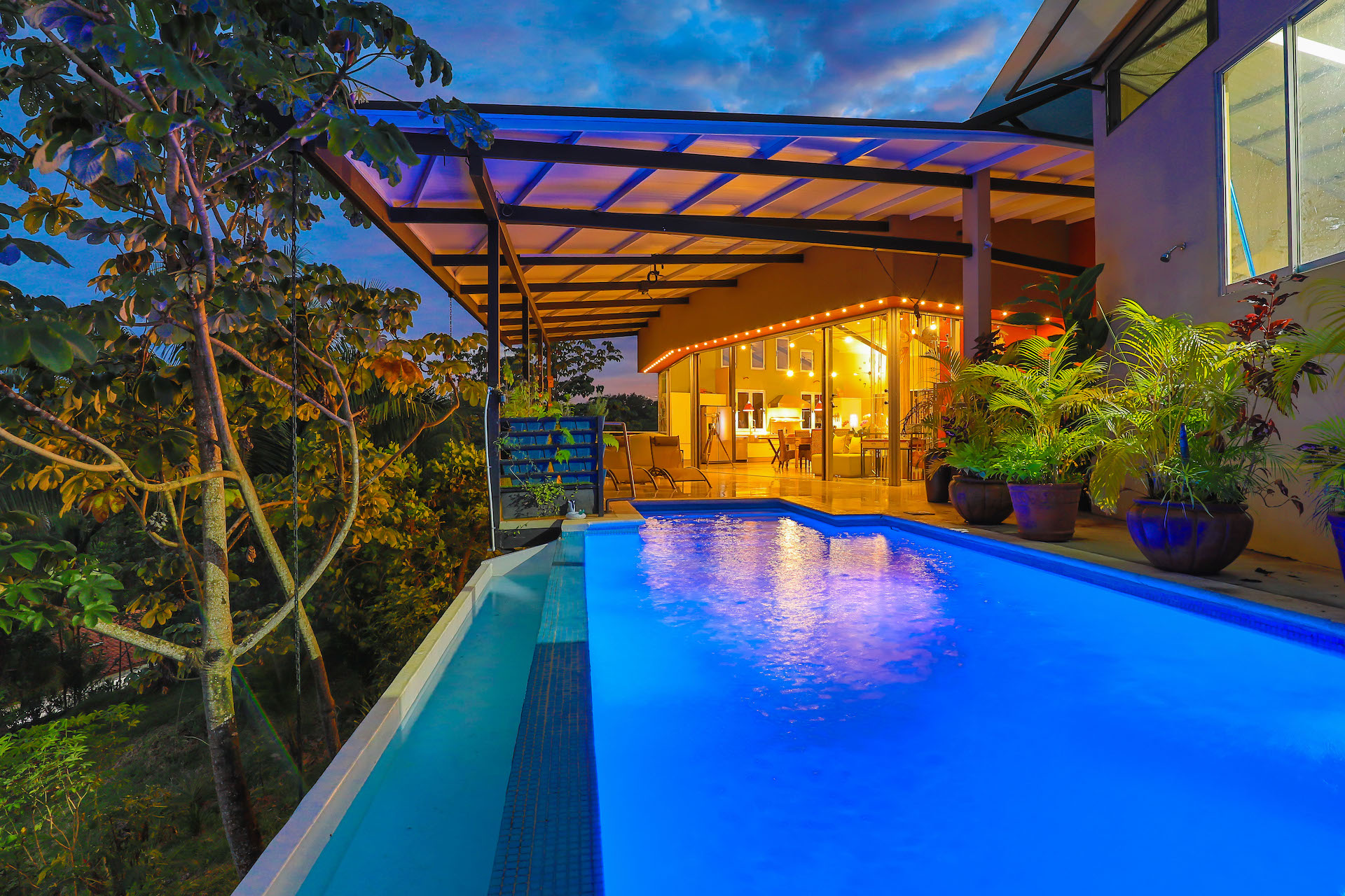 Designed by the owners, their 20+ years in Costa Rican is brought to bear on every thoughtful and satisfying detail. An a-symmetrical roof has imported Italian motor-operated windows to allow heat to escape. A solar panel powers the pool pump, All electrical outlets imported to ensure quality. The German-made toilets, Turkish bathroom sinks, retractable mosquito screens, and custom bedroom doors are all of the highest quality. Fiber optic 100 MG internet is available throughout the home as well as the large workshop at the bottom of the property. The main floor is also wired to support a complete surround sound system.