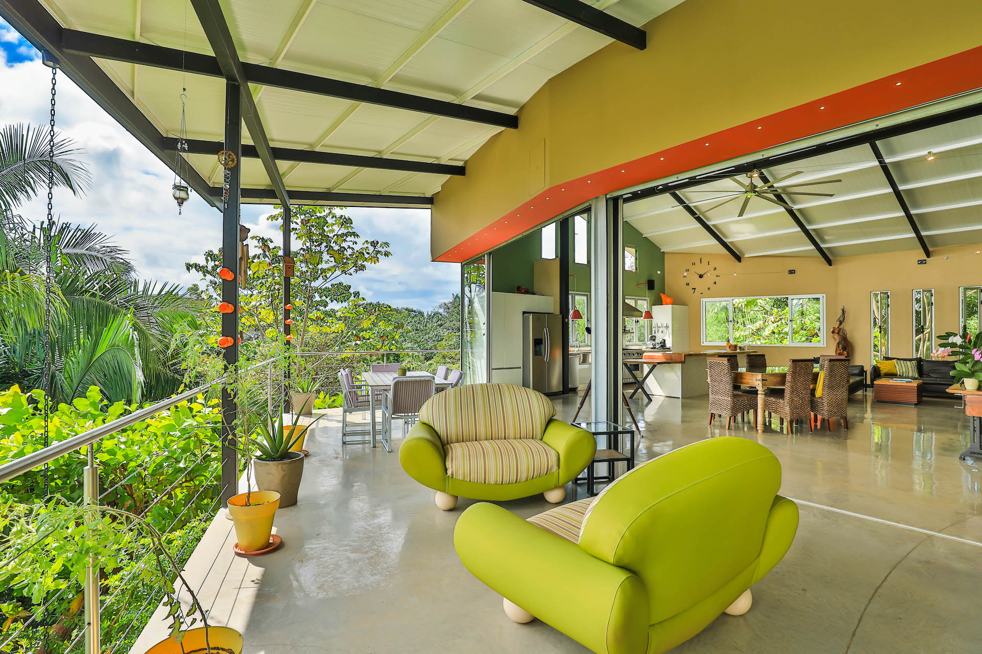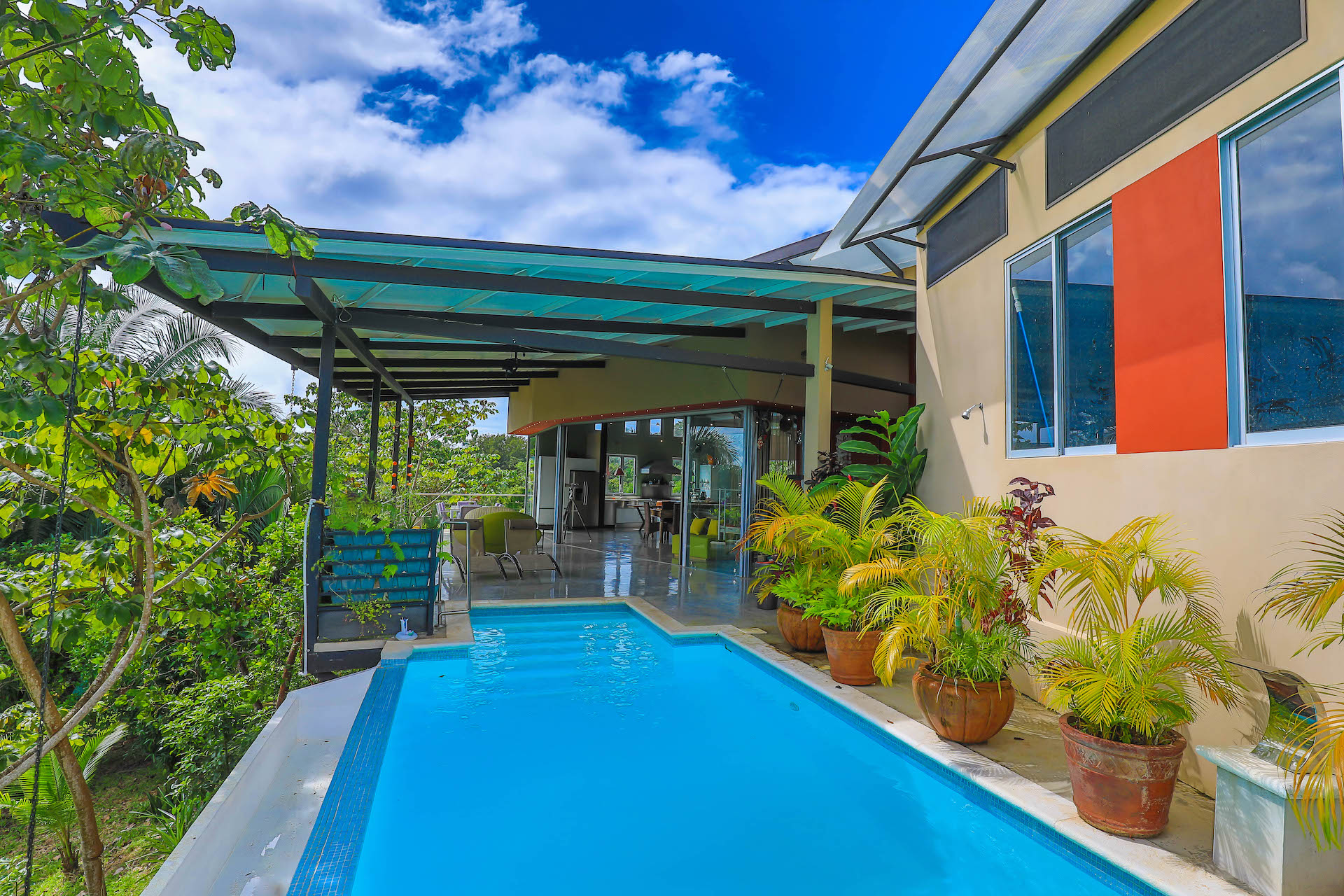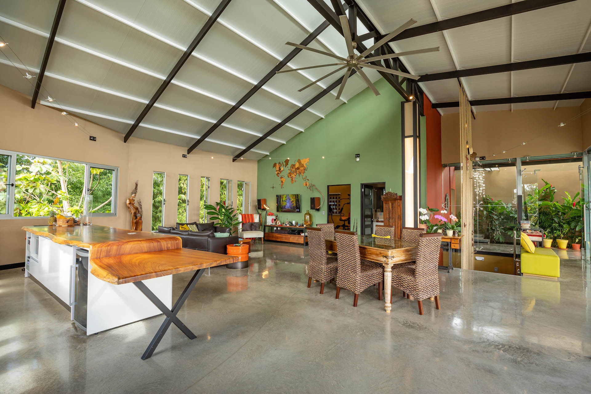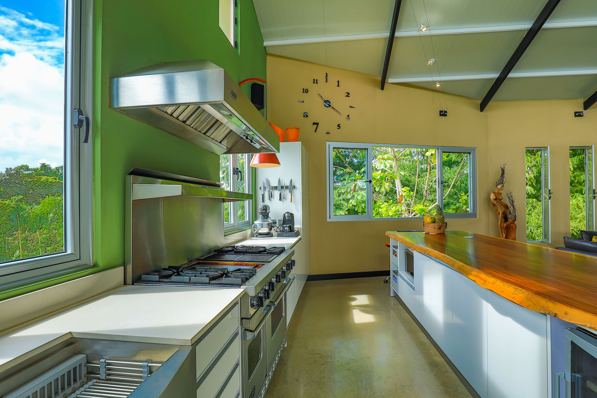 Designed by the owners, their 20+ years in Costa Rican is brought to bear on every thoughtful and satisfying detail. An a-symmetrical roof has imported Italian motor-operated windows to allow heat to escape. A solar panel powers the pool pump, All electrical outlets imported to ensure quality. The German-made toilets, Turkish bathroom sinks, retractable mosquito screens, and custom bedroom doors are all of the highest quality. Fiber optic 100 MG internet is available throughout the home as well as the large workshop at the bottom of the property. The main floor is also wired to support a complete surround sound system.
