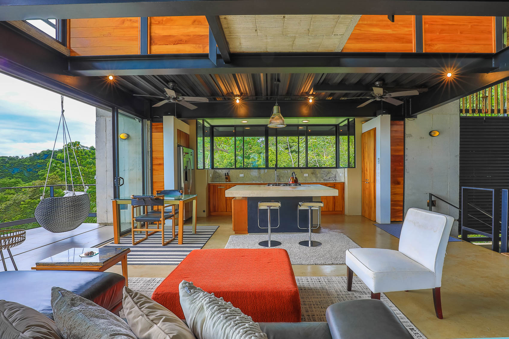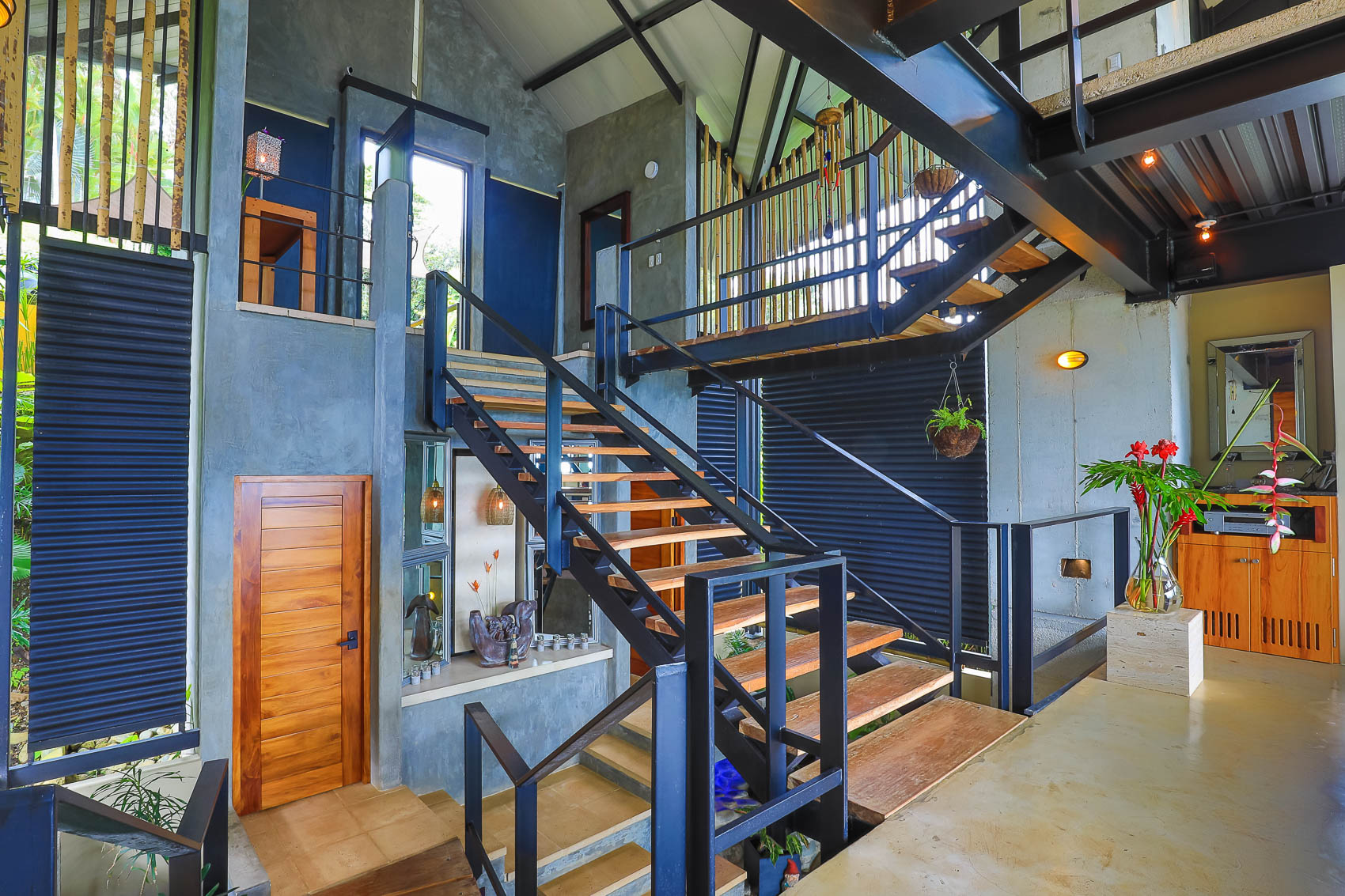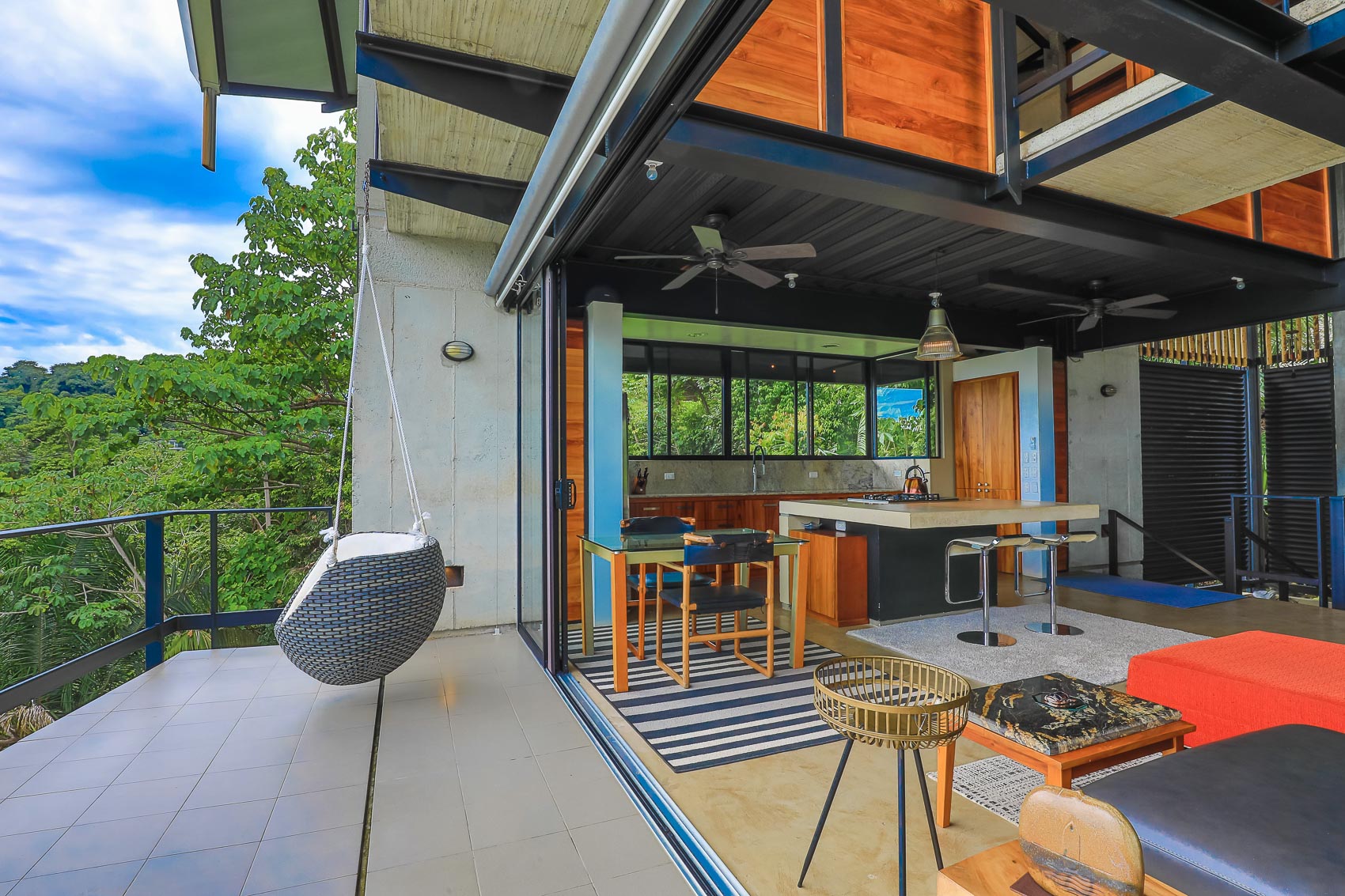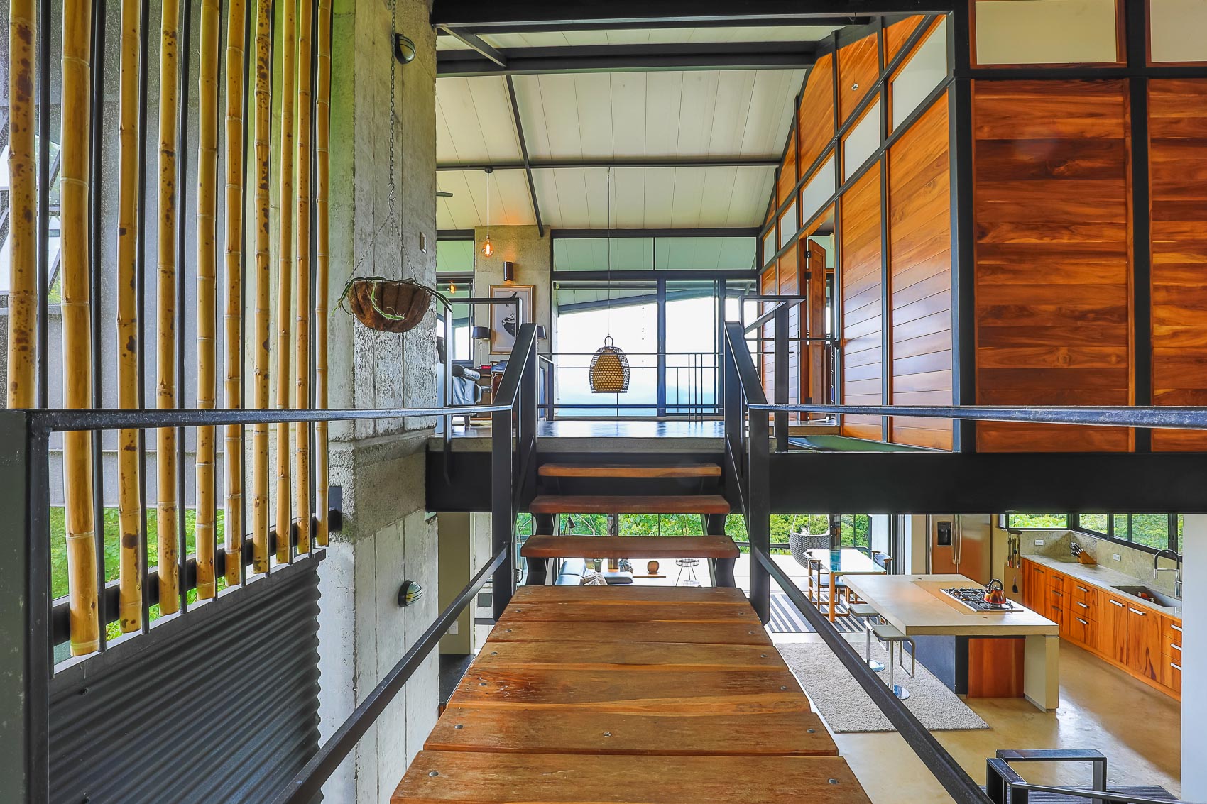 This property is an amazing new offering at an incredible price point for a luxury villa. this 3 bedroom, 3.5 bathroom home is located in the El Salto gated community which offers up spacious lots, all over an acre in size which ensures that each and every property has privacy, wildlife, and serenity, but all within the heart of Manuel Antonio. The home itself is a magical combination of steel, wood, glass, and natural stones which fuses modern lines and architecture with the organic elements of the region and the panoramic mountain, valley, and Ocean views. When you enter the home, beneath the unique rooflines and bridged entrance, you are bathed in natural light and a split floor plan. the upper level is host to one of the master bedrooms, complete with a suite bath and open-air shower, along with a lofted living or workspace with amazing views. The level below hosts the modern kitchen area, dining space, and another living area with the same panoramic views. There is a half bath just off this space as well and the large sliding glass windows allow for seamless integration of indoor and outdoor space.