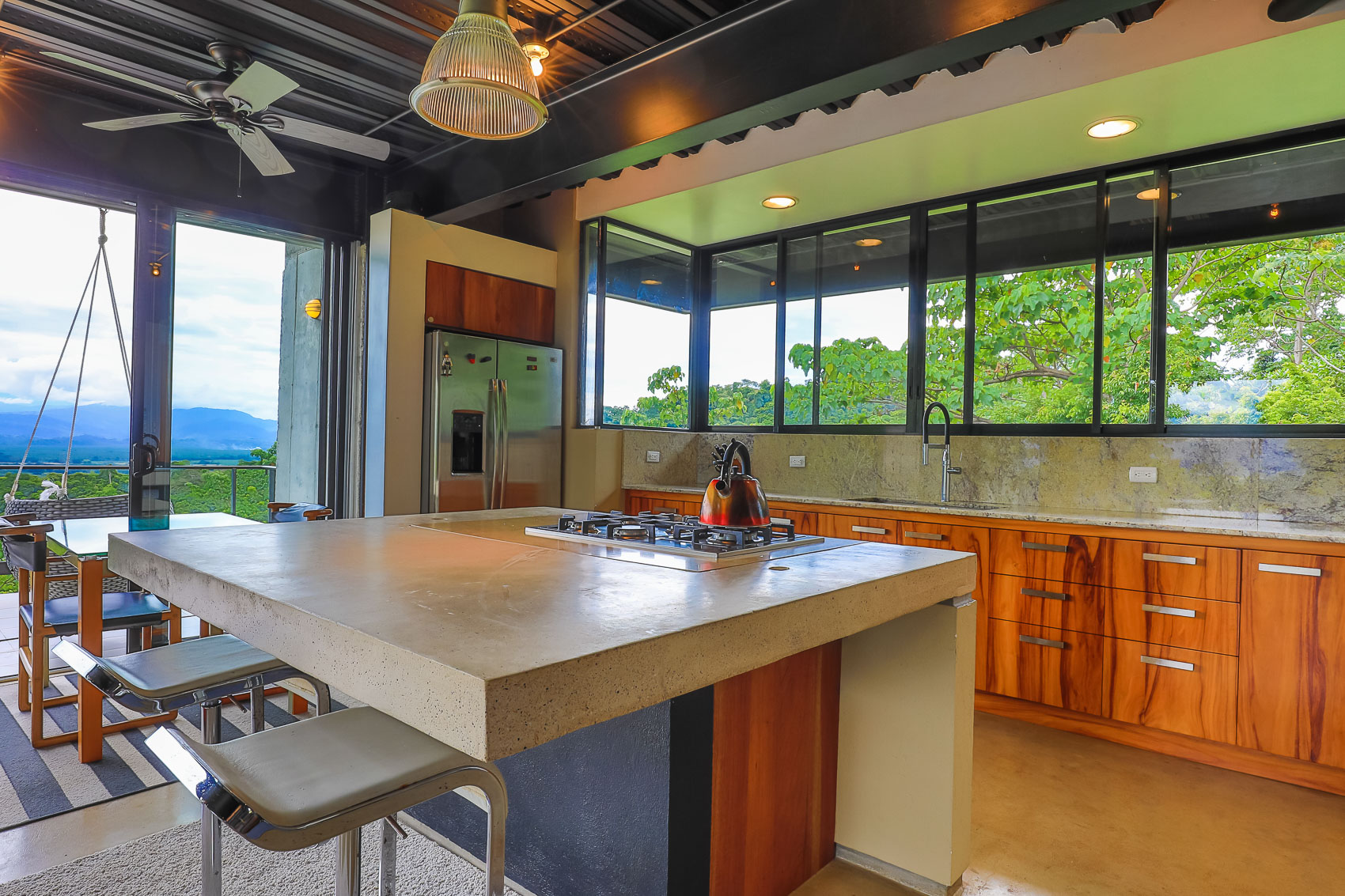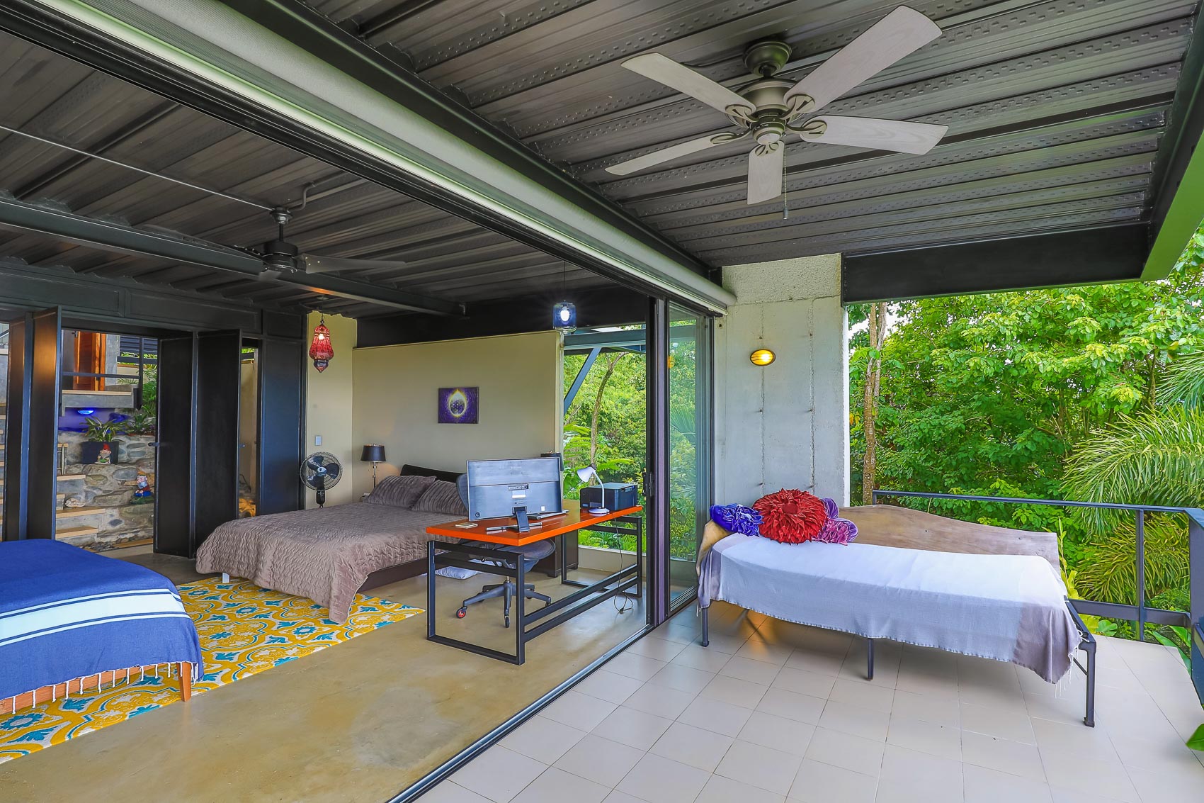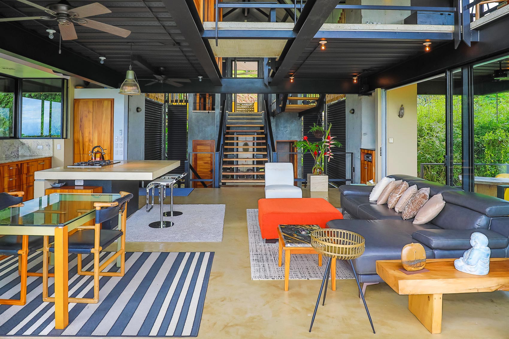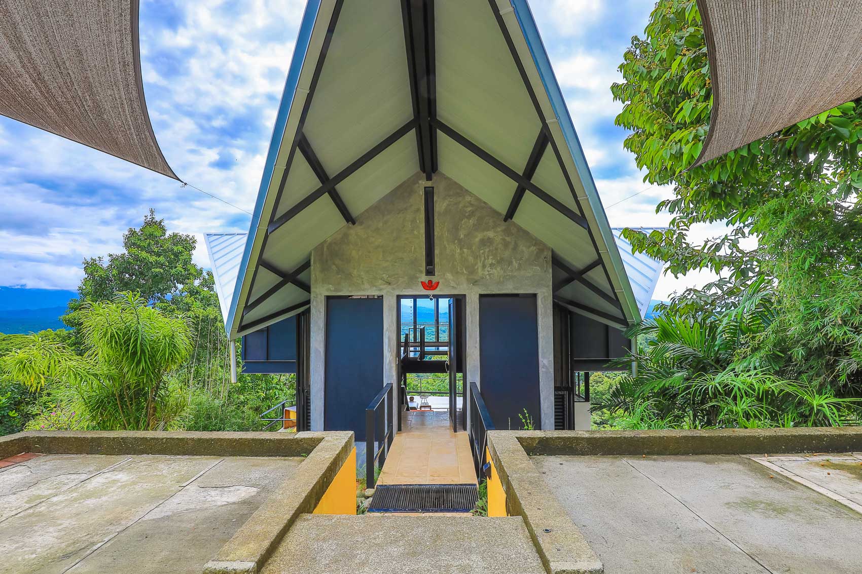 This property is an amazing new offering at an incredible price point for a luxury villa. this 3 bedroom, 3.5 bathroom home is located in the El Salto gated community which offers up spacious lots, all over an acre in size which ensures that each and every property has privacy, wildlife, and serenity, but all within the heart of Manuel Antonio. The home itself is a magical combination of steel, wood, glass, and natural stones which fuses modern lines and architecture with the organic elements of the region and the panoramic mountain, valley, and Ocean views. When you enter the home, beneath the unique rooflines and bridged entrance, you are bathed in natural light and a split floor plan. the upper level is host to one of the master bedrooms, complete with a suite bath and open-air shower, along with a lofted living or workspace with amazing views. The level below hosts the modern kitchen area, dining space, and another living area with the same panoramic views. There is a half bath just off this space as well and the large sliding glass windows allow for seamless integration of indoor and outdoor space.