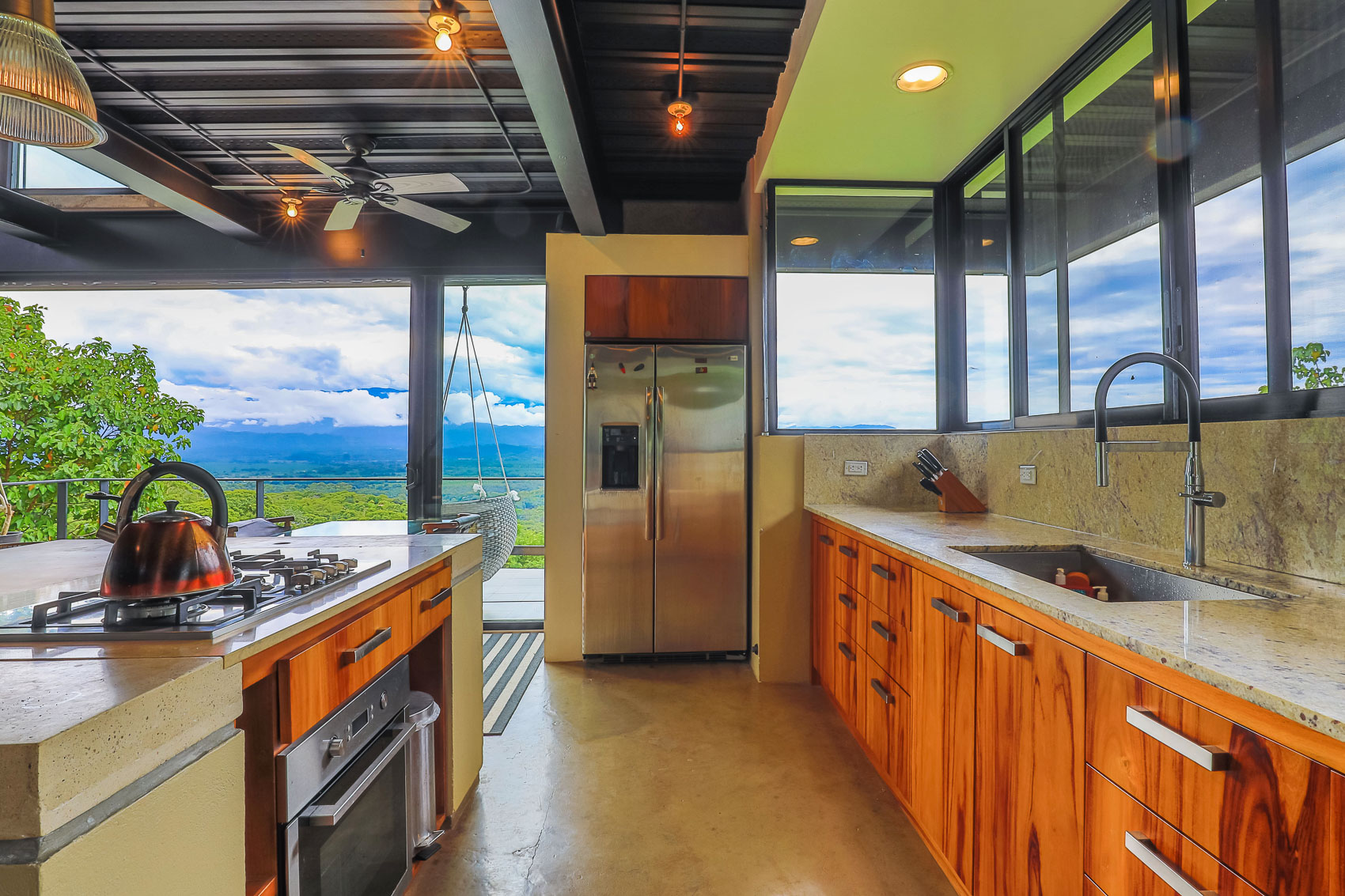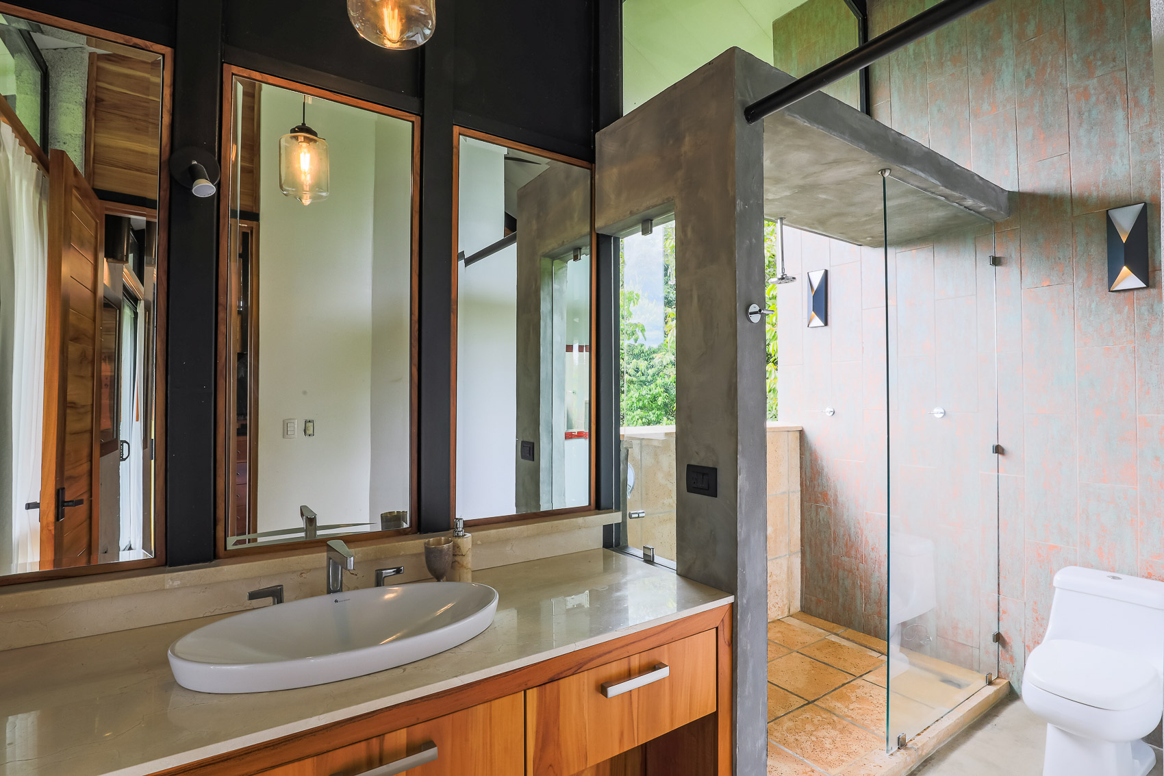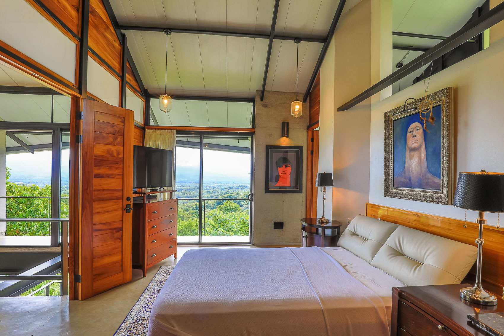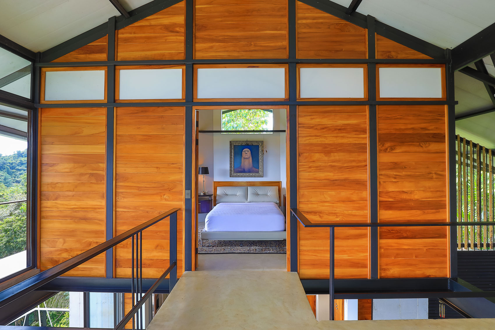 This property is an amazing new offering at an incredible price point for a luxury villa. this 3 bedroom, 3.5 bathroom home is located in the El Salto gated community which offers up spacious lots, all over an acre in size which ensures that each and every property has privacy, wildlife, and serenity, but all within the heart of Manuel Antonio. The home itself is a magical combination of steel, wood, glass, and natural stones which fuses modern lines and architecture with the organic elements of the region and the panoramic mountain, valley, and Ocean views. When you enter the home, beneath the unique rooflines and bridged entrance, you are bathed in natural light and a split floor plan. the upper level is host to one of the master bedrooms, complete with a suite bath and open-air shower, along with a lofted living or workspace with amazing views. The level below hosts the modern kitchen area, dining space, and another living area with the same panoramic views. There is a half bath just off this space as well and the large sliding glass windows allow for seamless integration of indoor and outdoor space.