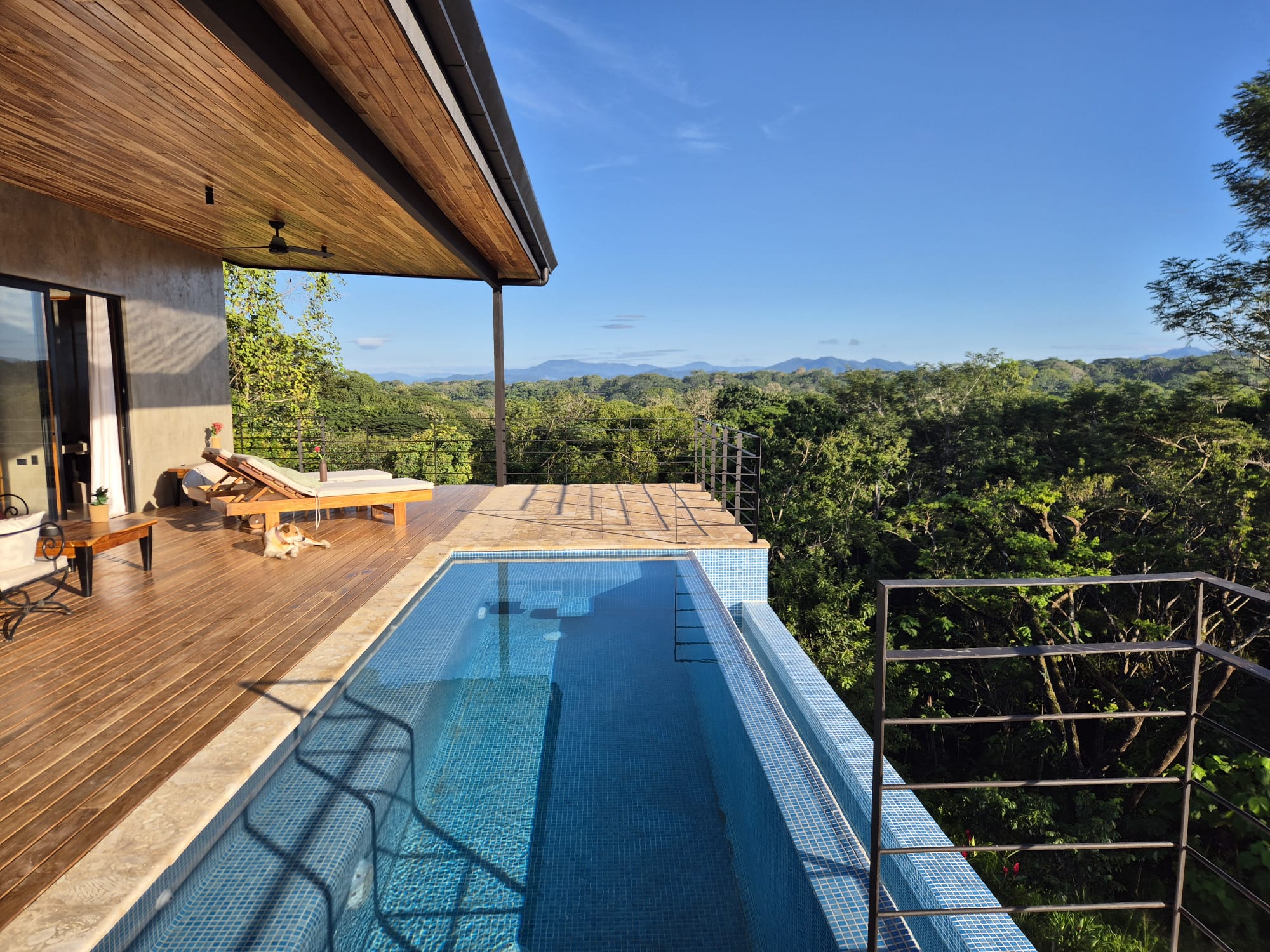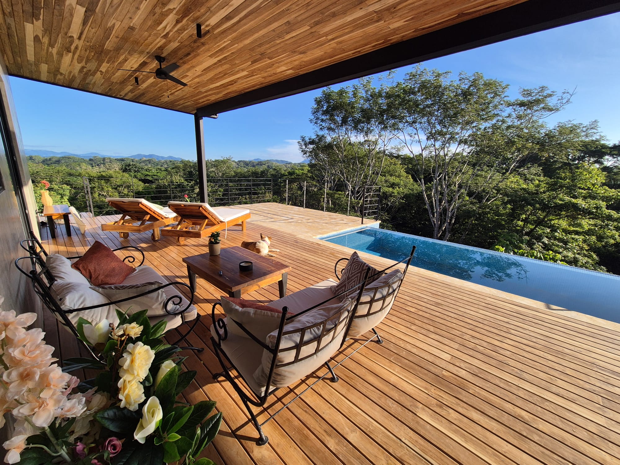 Built in 2024, the single-level home features approximately 237 m² of total construction and sits on an elevated position with spectacular 180-degree valley and mountain views. The design combines solid concrete construction with warm teak wood finishes, creating a bright, airy interior with a smooth and practical flow.