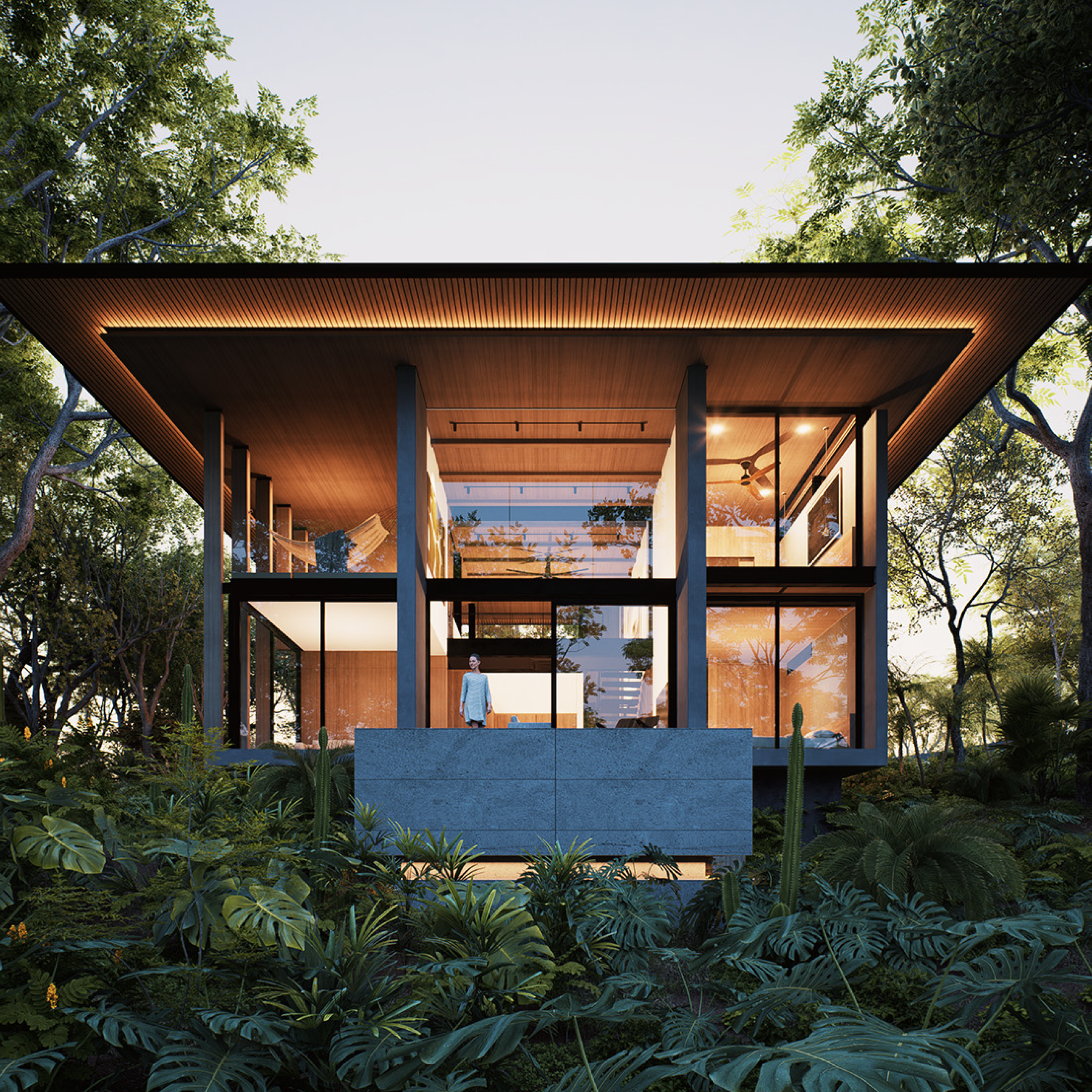 • Includes solar panels and battery systems for energy efficiency. • Designed for Lot 10, providing one of the best views of El Pochote. • Adaptable design as spaces can be reconfigured or repurposed over time. • Can be delivered with different floor plans. • Privately located at the end of the road, near Jardin de Contemplacion. • The backyard is against a green buffer of the neighboring property. • Each room and feature is arranged to enhance the connection with nature. • Built-in BBQ for outdoor entertaining. • Minimalist style. • Seamless integration with natural surroundings. • Yoga deck (optional). • Private outdoor pool (optional).