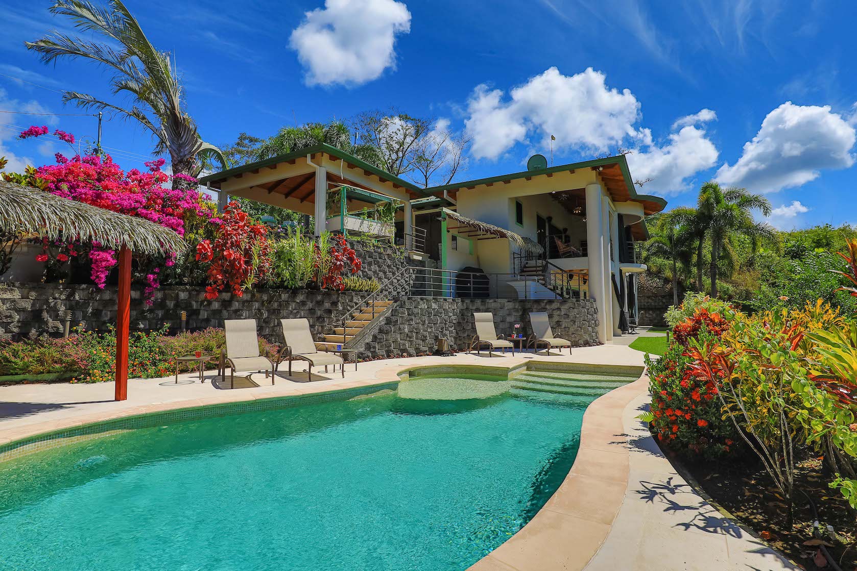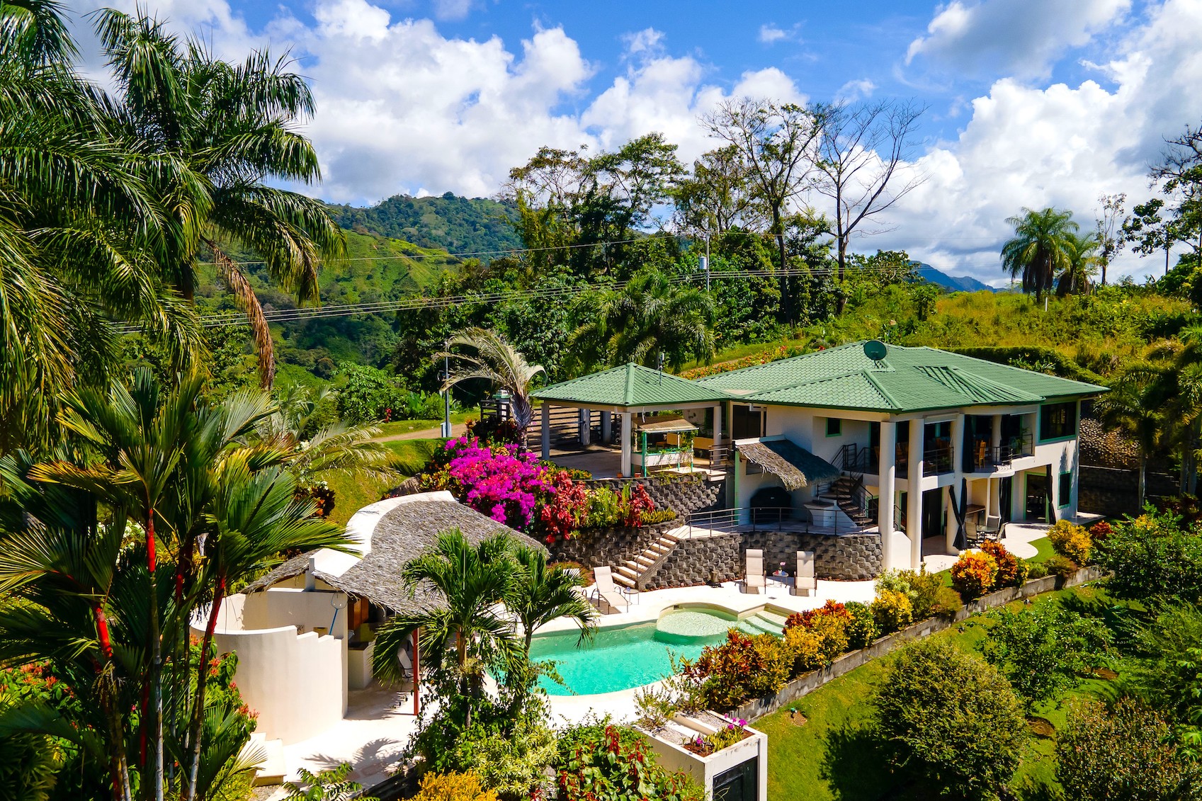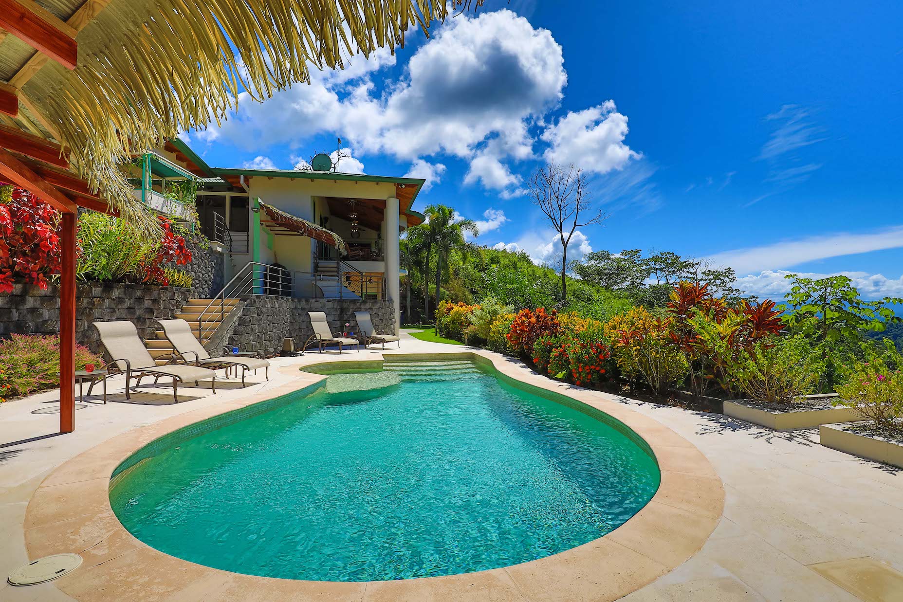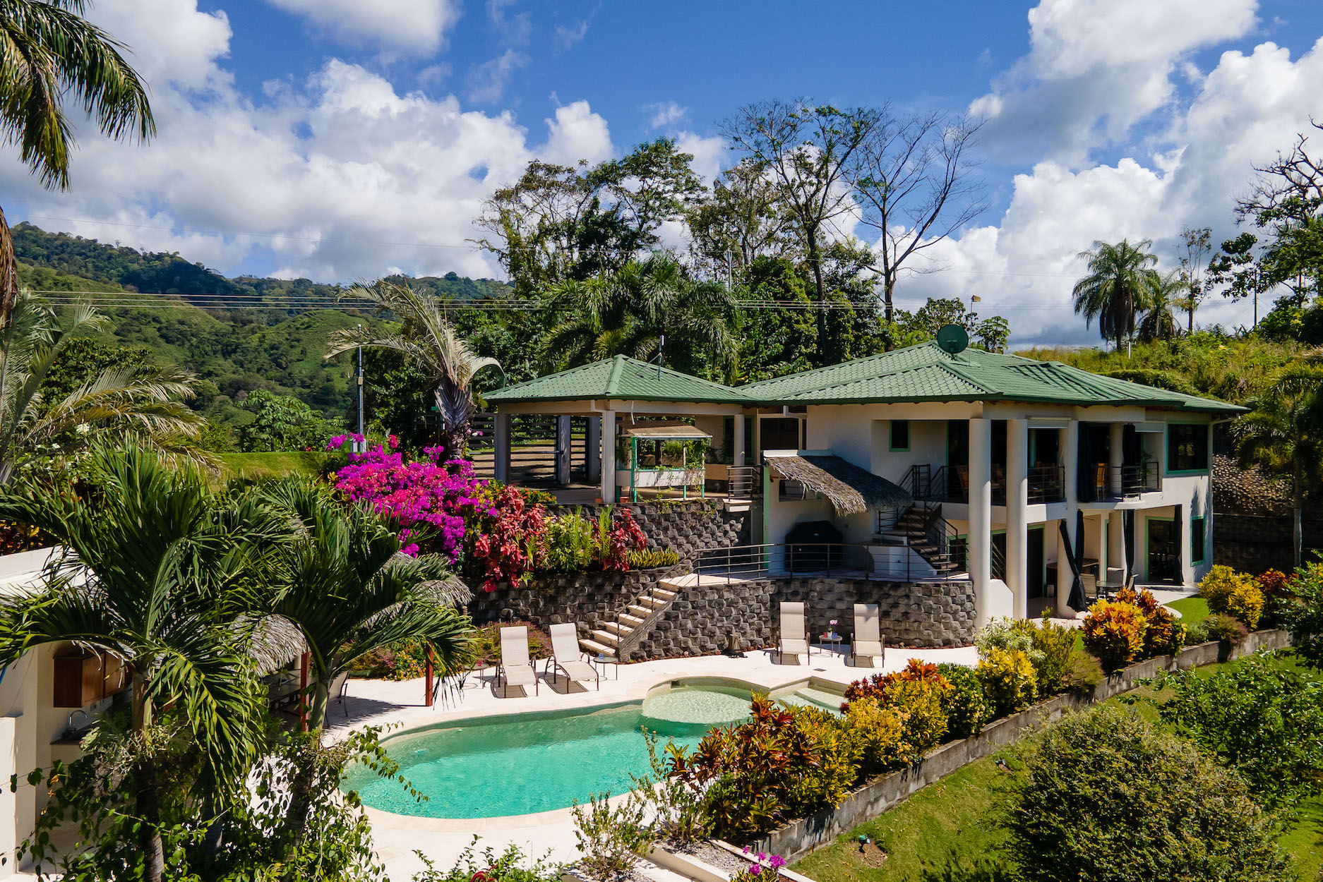 The immediate area is covered by a tropical rain forest which attracts the famous Costa Rican wildlife - colorful birds, scarlet macaws, toucans, parrots, monkeys and beautiful Blue Morpho butterflies (amongst many others) these will be your new neighbors! Currently the beautiful Montezuma Oropendola birds have built their hanging nests in giant Royal Palms which surround the house.