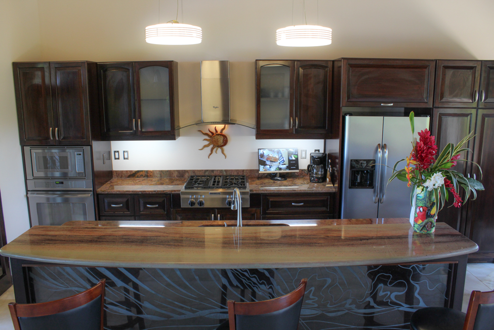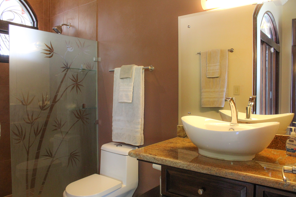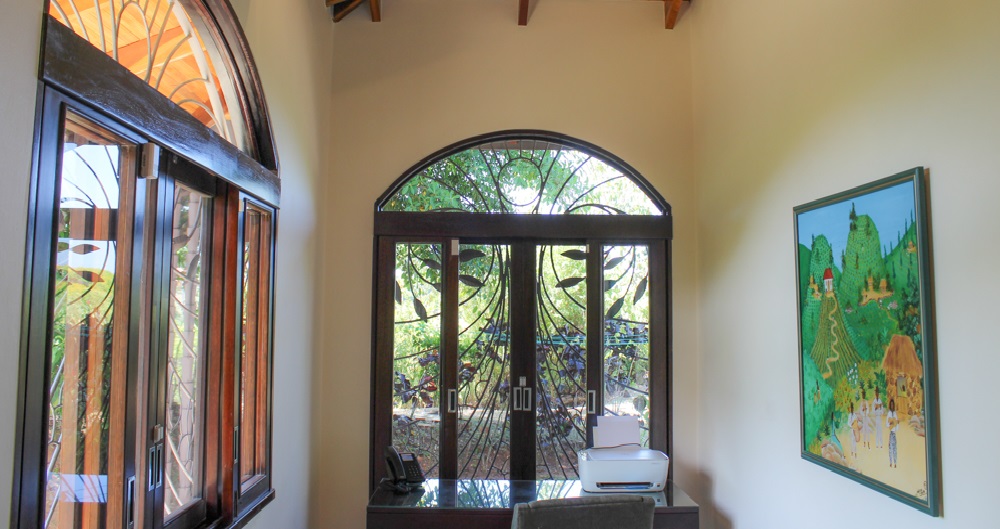 Across the terrace from the master suite, there are two spacious ocean-view bedrooms. Both are steps away from the pool, each featuring large wardrobes and ensuite bathrooms. The bathrooms have unique tile work, and etched glass, engaging the senses with color, texture and design! There are five air conditioning units for comfort, one in each of the three bedrooms plus one in each office, but with the comfortable breezes and 15 ceiling fans throughout the house and on the patio, you may never need air conditioning at all!