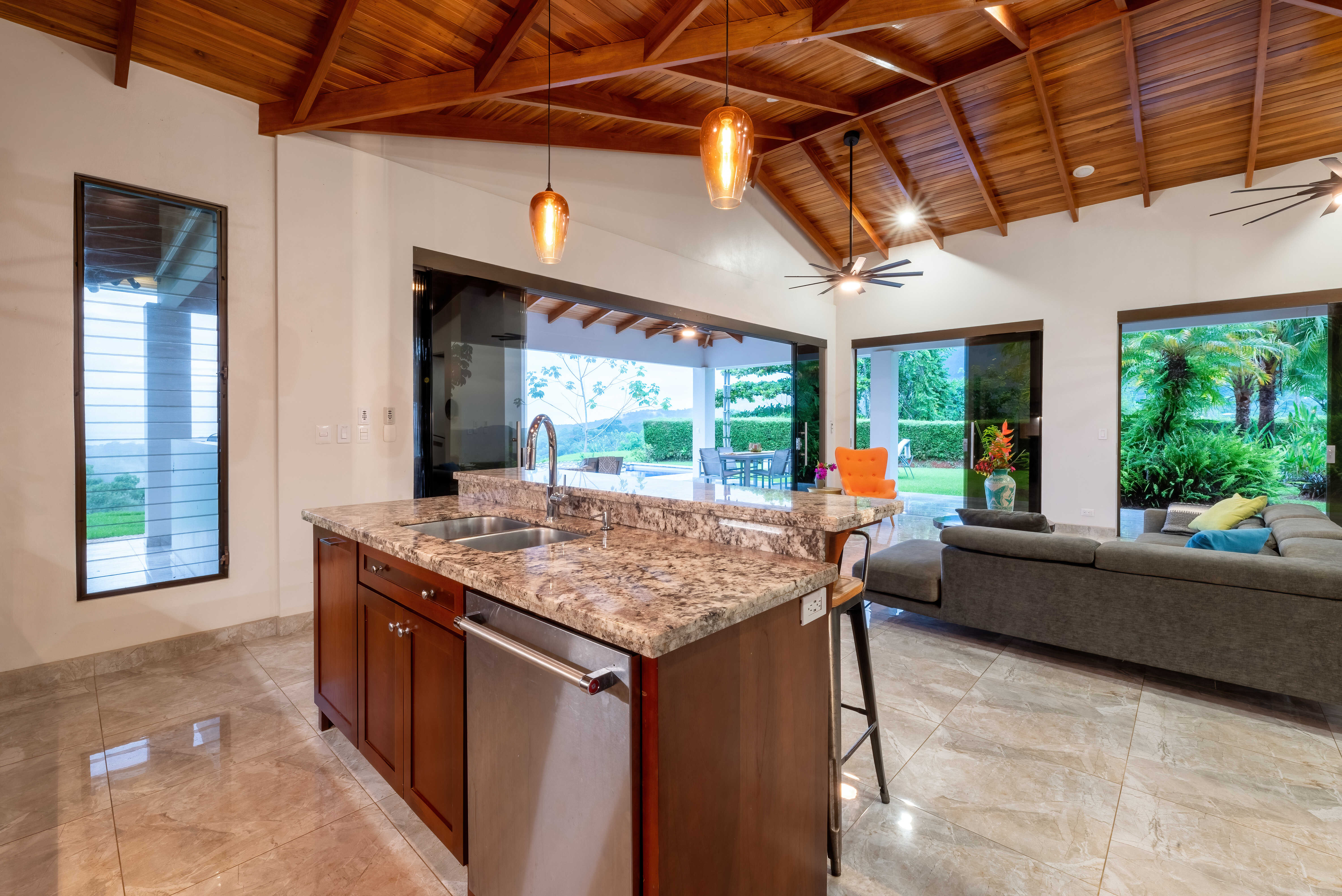 Designed to harmonize modern elegance with tropical allure, the home features soaring vaulted ceilings, a gourmet kitchen equipped for culinary artistry, and a seamless indoor-outdoor flow. Step outside to discover an entertainer’s paradise: fire up the built-in BBQ on the ample covered patio, dine alfresco under ambient lighting, or take a dip in the sparkling oversized pool framed by lush greenery. The expansive grassy lawn invites endless possibilities—let children play freely, host spirited volleyball matches, or set up a cricket pitch for friendly competitions.