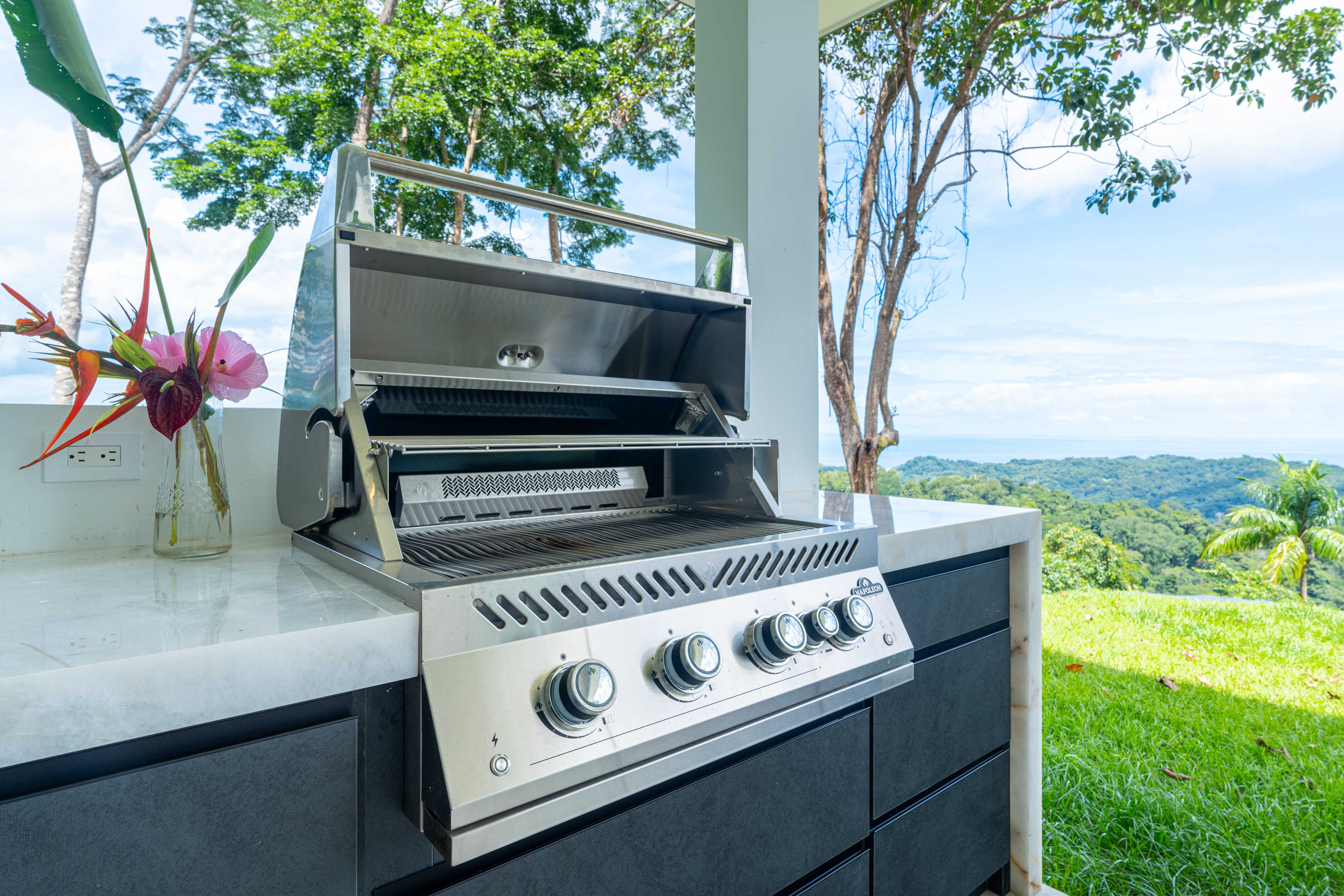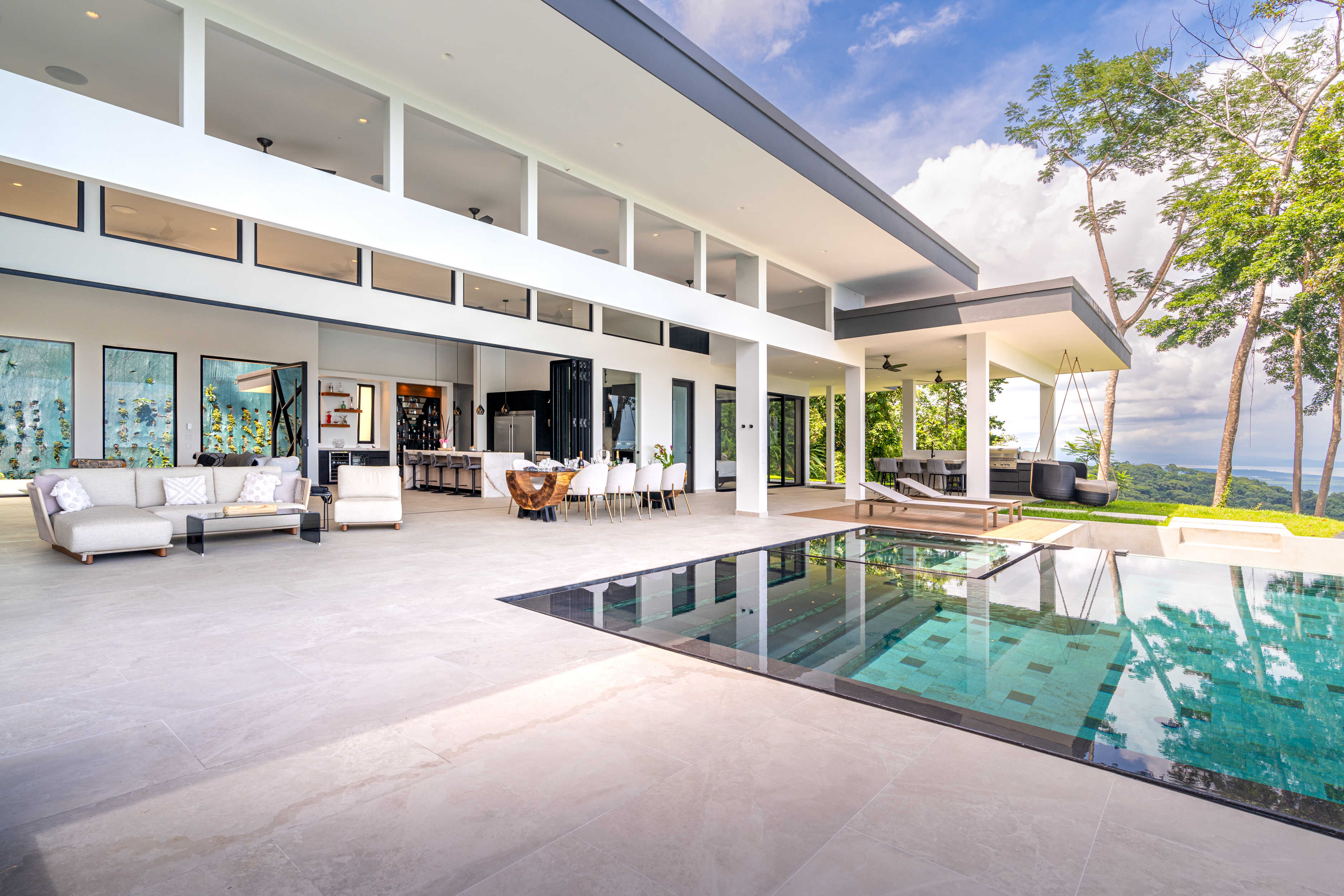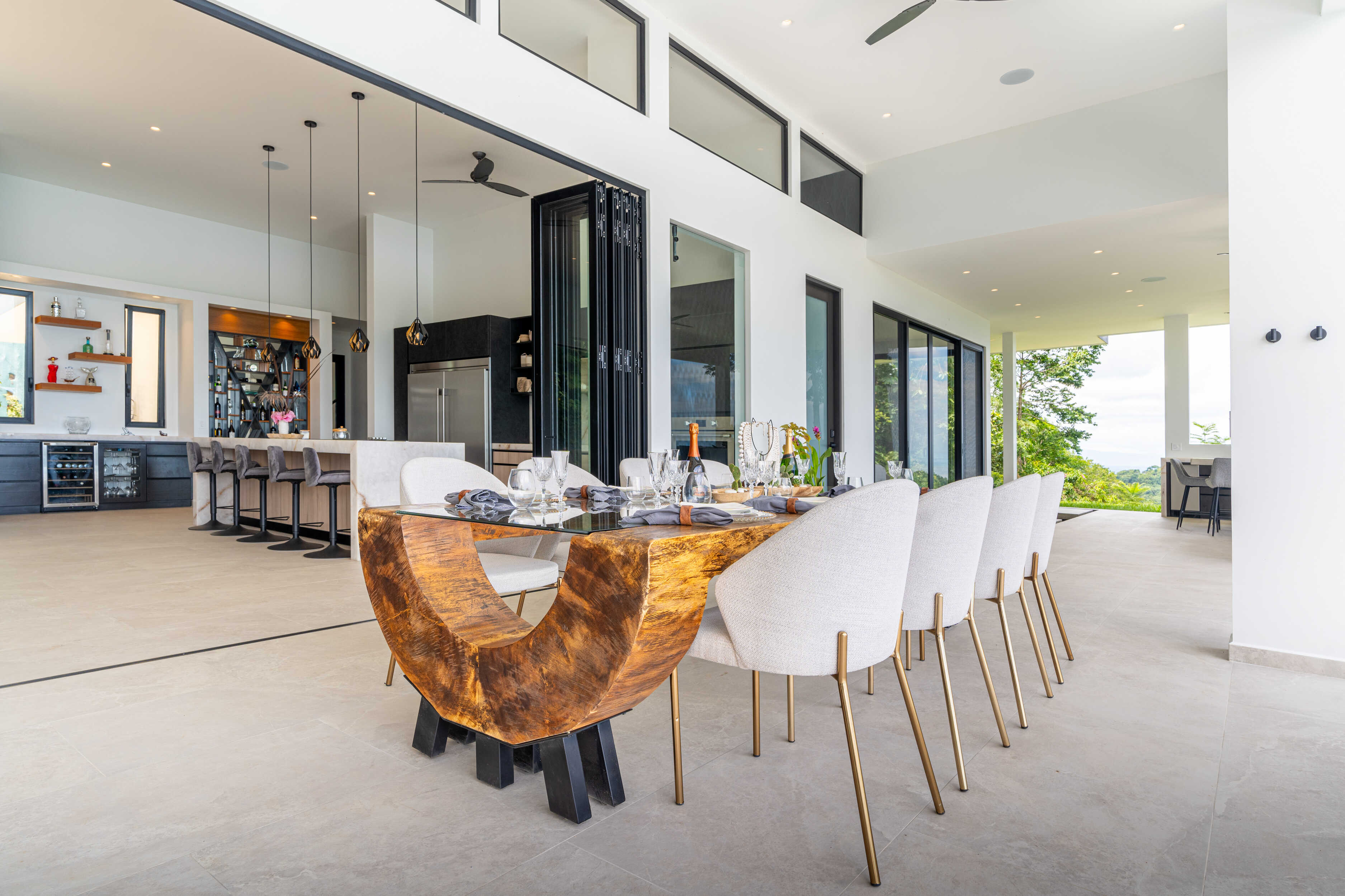 The chef’s kitchen flows into expansive indoor-outdoor living spaces, ideal for alfresco dining or sunset cocktails.