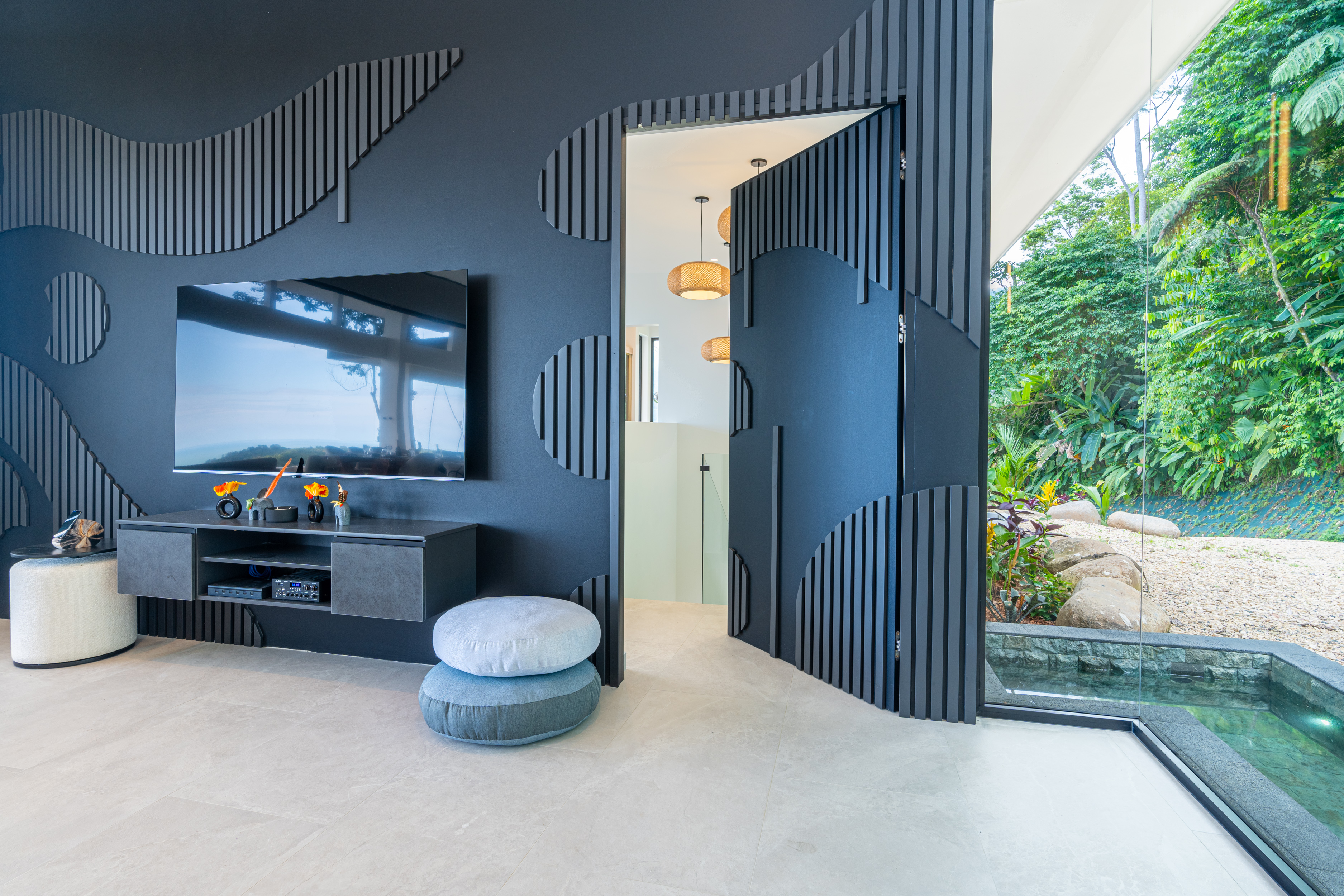 Earth anchors the home in lush tropical gardens and ancient trees that whisper with the wind.