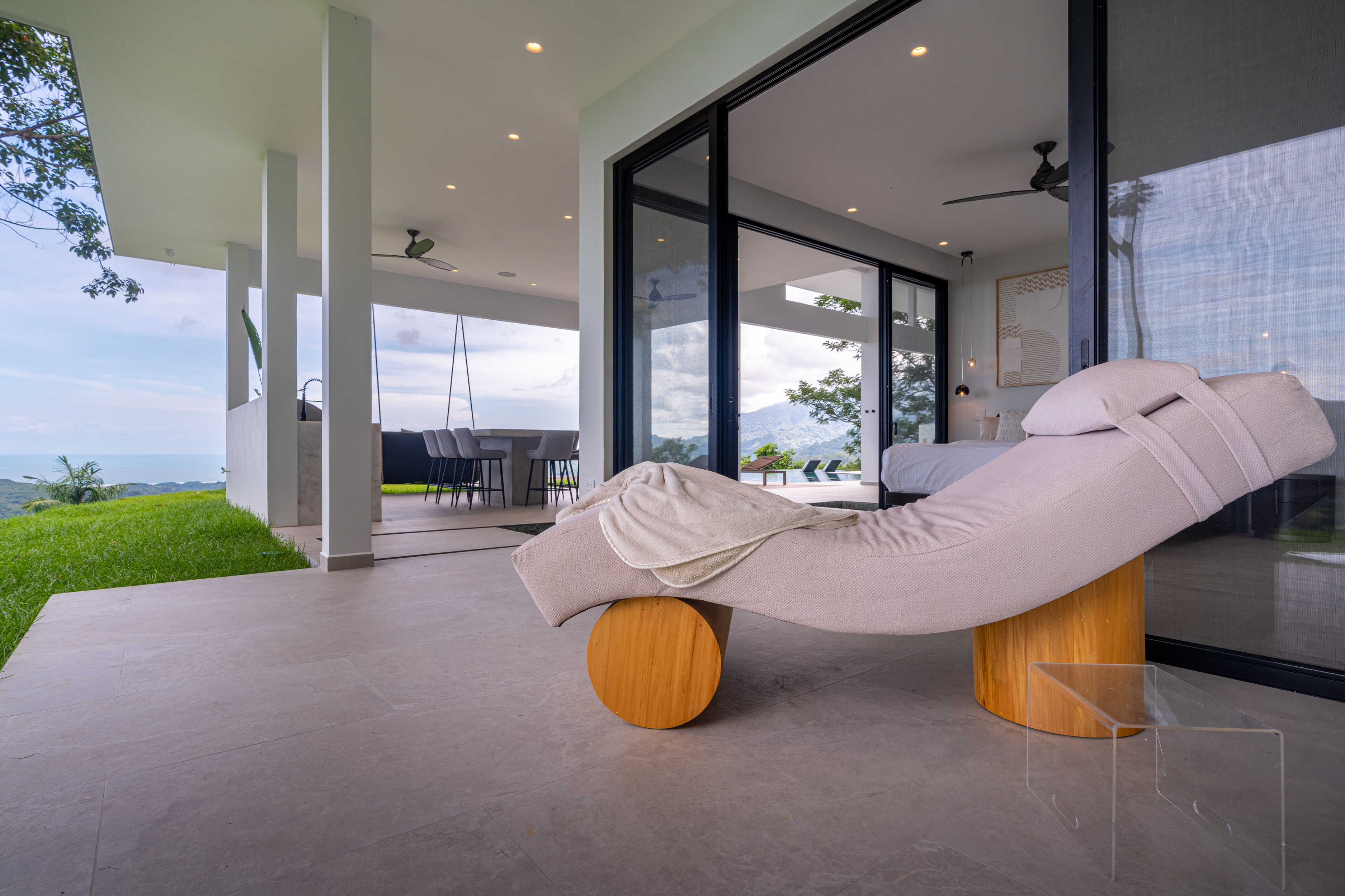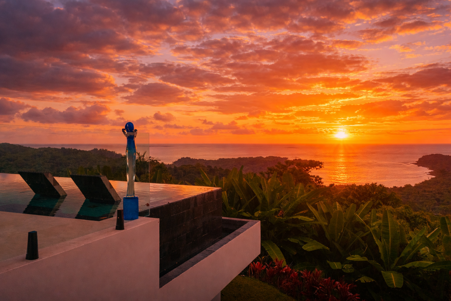 Commanding 280-degree panoramic ocean views, Casa Armonía Elements gazes across the deep blue Pacific, taking in three distinct whitewater coastlines, Caño Island, and the iconic Whale’s Tail formation at Marino Ballena National Park. Every evening, the sky bursts into color with year-round sunsets, while the twinkling lights of Ojochal shimmer below, painting a scene of magic and mystery.