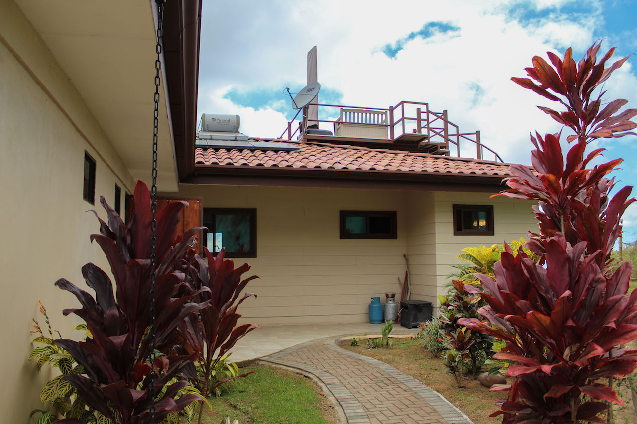 This house has a number of great features!You will enjoy spectacular 360 views from the deck on the roof, which is accessed by a spiral staircase at the side of the house.The electricity and hot water is powered by 9 solar panels mounted on the roof.Speaking of the roof, there are two layers, an insulated galvanized tin, followed by a recycled plastic layer on top which does a fantastic job of drowning out the sound of rain.