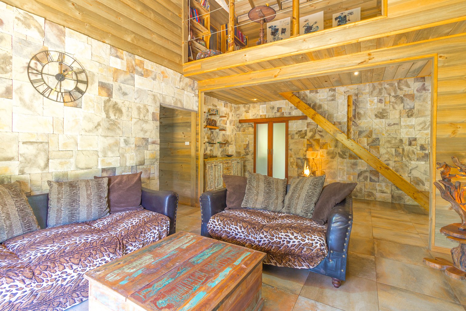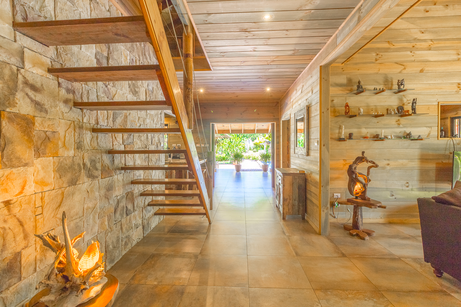 This artistic house features beautiful decorative stone, gorgeous woodwork, and decorative wrought iron designs on the doors. In addition to its great design, the house is also environmentally friendly and energy-efficient, with solar power and battery back-ups, including solar hot water.