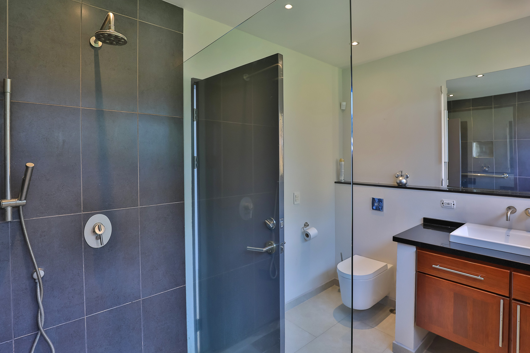 The three bedrooms, each with its own exquisite view, are laid out on a single-story, with a separate master bedroom and guest room wings on opposite sides of the home to maximize privacy and comfort. The master bedroom opens onto the sunset view of your dreams, to be enjoyed directly from the bed. The master bath features a large European spa tub to comfortably accommodate two, and a separate multi-function rainfall shower. The guest wing of the home contains two guest rooms which can be used for visitors or as an office or home studio. Between the two bedrooms is a shared bathroom elegantly finished in the same high-end quality as the rest of the home. The shared dining, living, and kitchen spaces feature many design elements. You will find a sophisticated kitchen finished in tasteful black granite.