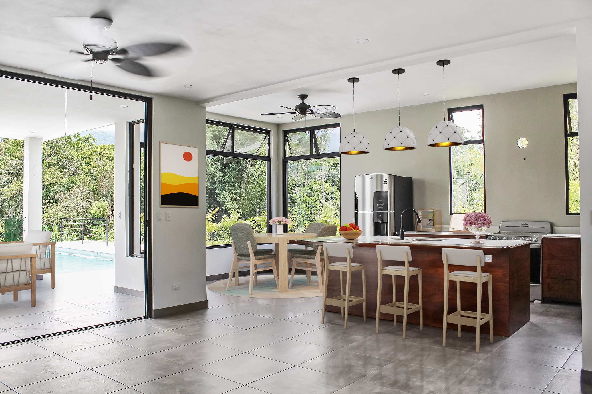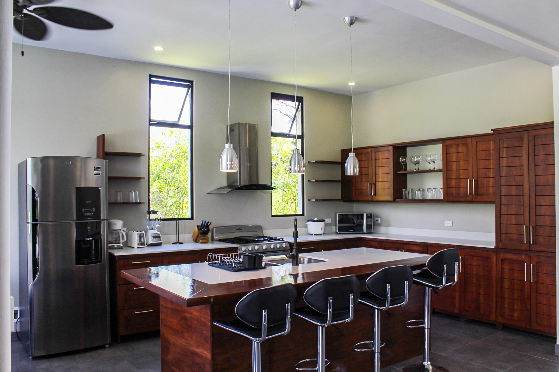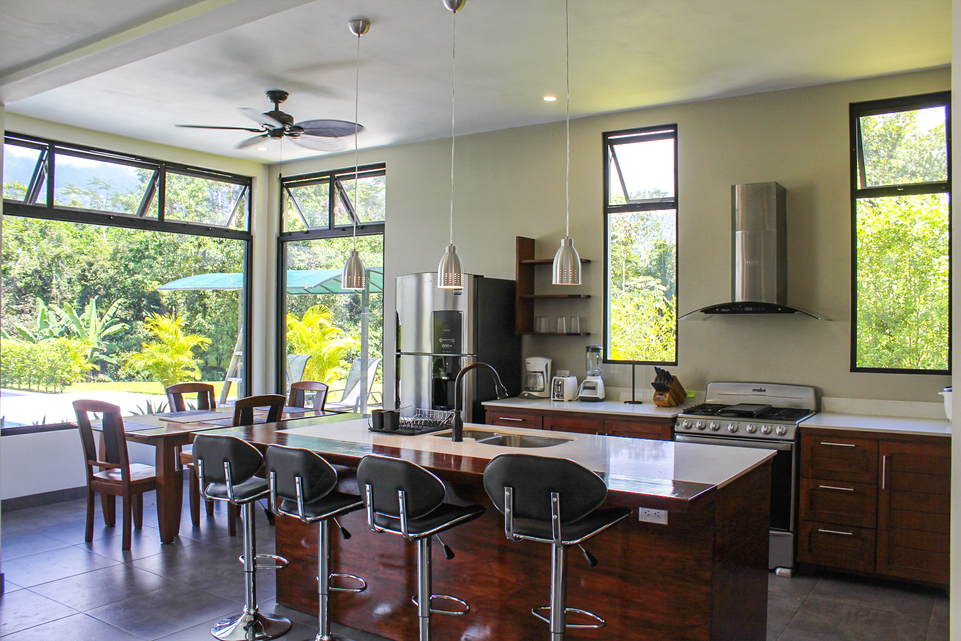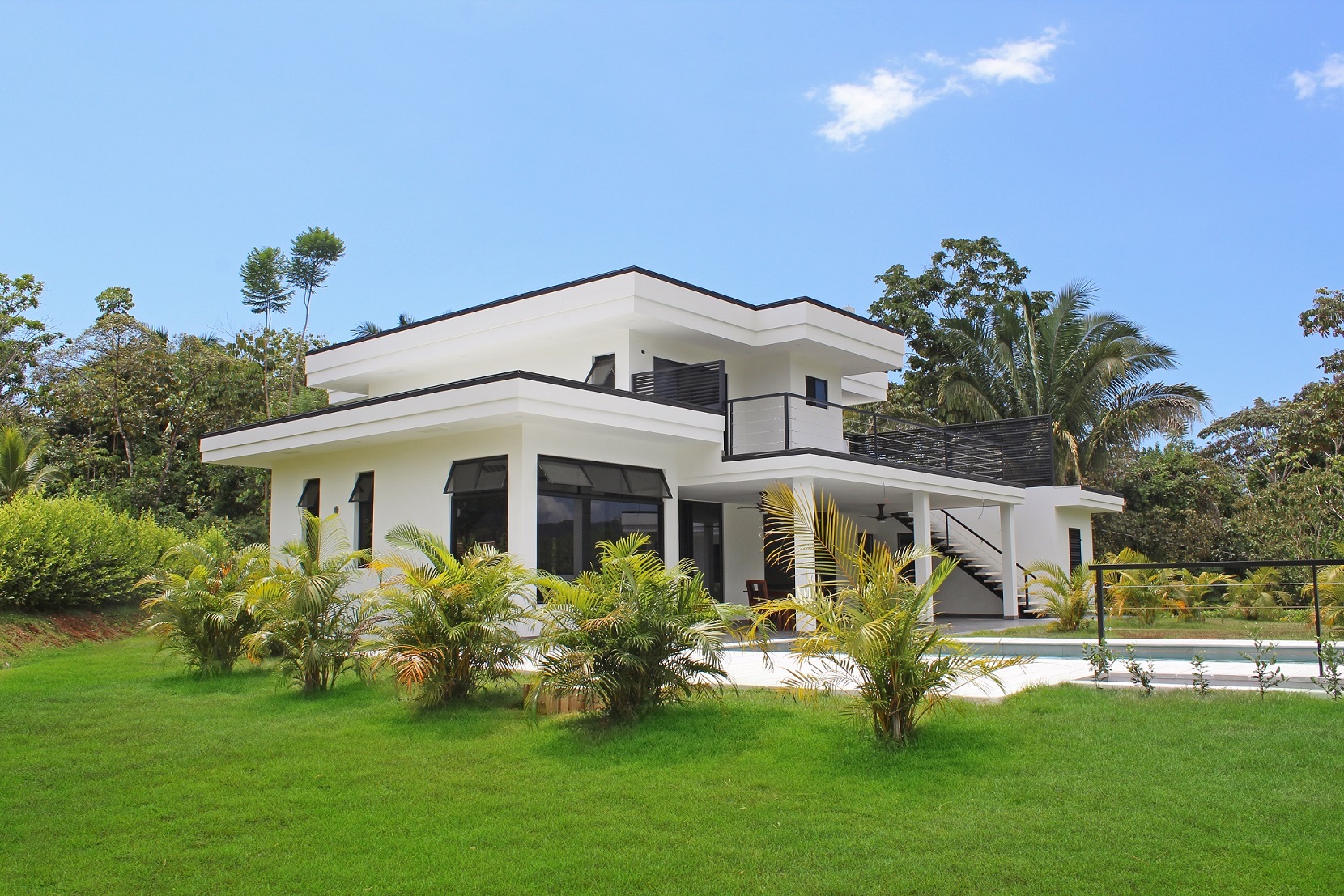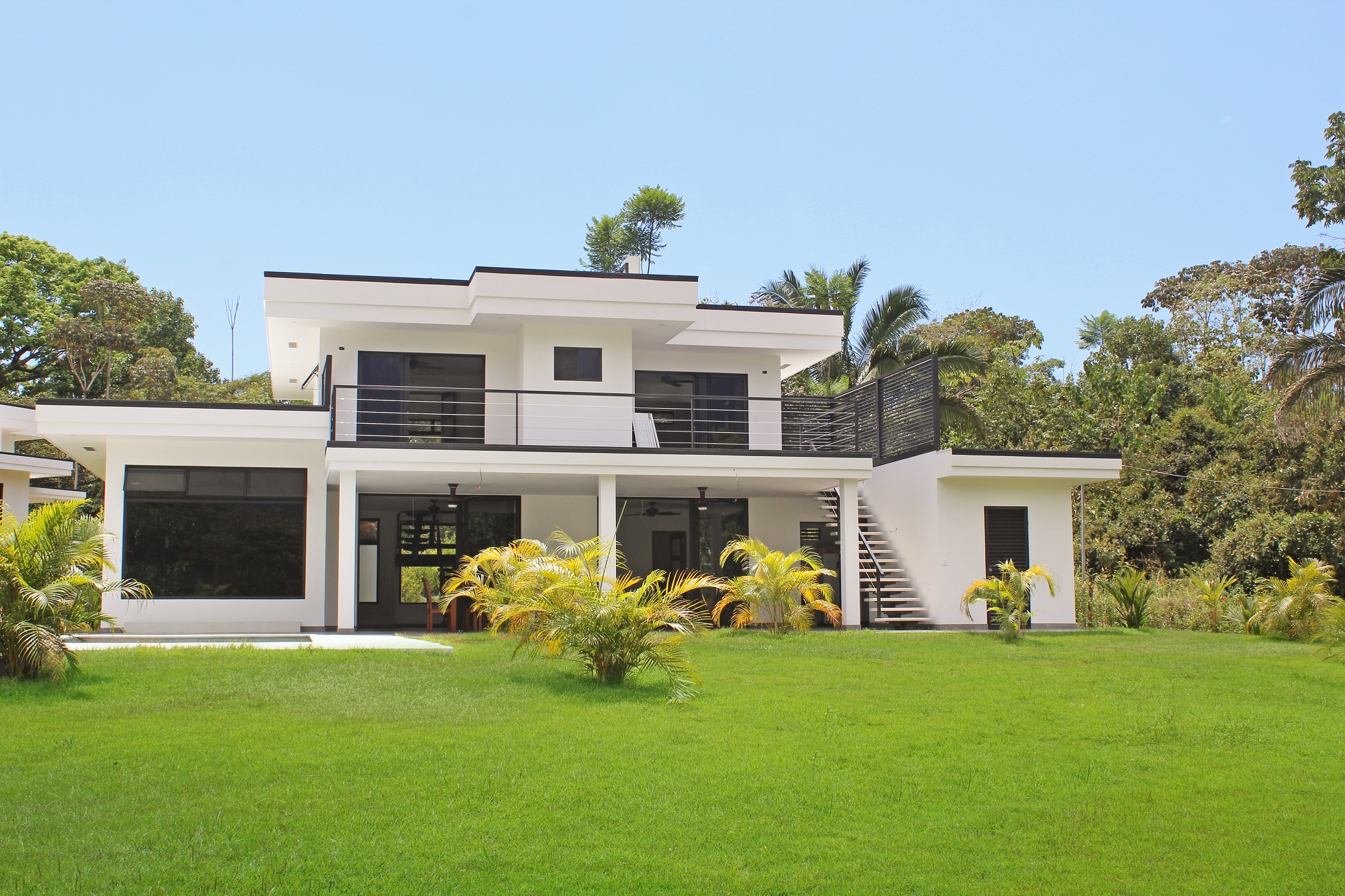 This modern home combines the clean lines and muted color palette of contemporary design with exotic hardwoods native to this region for a simple architectural complement to the colorful tropical landscape surrounding this home. The modern, clean lines of the home create a blank canvas through which to experience the exhilaration of nature’s wonders, both inside and out. On or completely off-grid are optional with the expansive solar-power system, and high-speed internet is installed, making it easy to stay connected in this high-quality retreat.