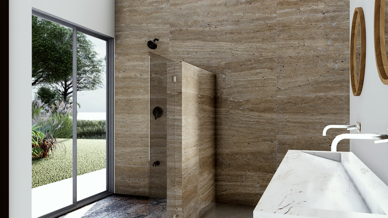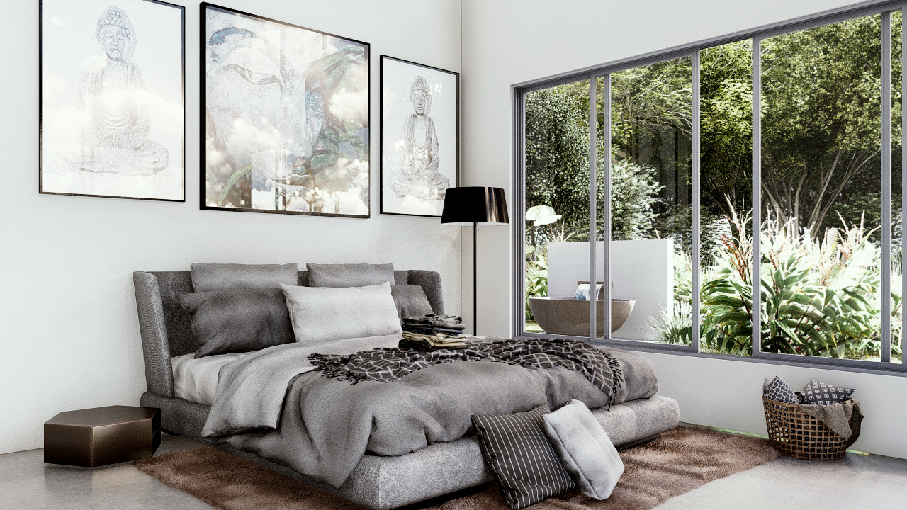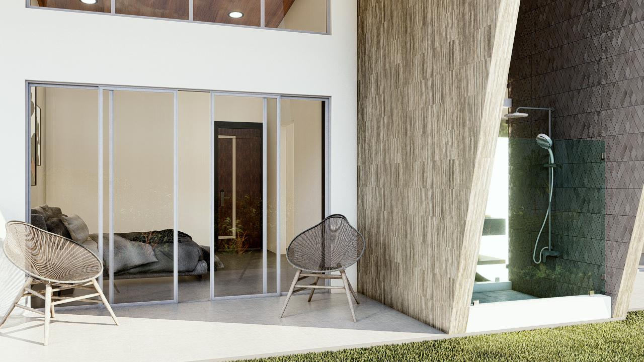 Also opening to the terrace, the opulent main bedroom suite is complete with inside and outside showers, an outdoor Bali solid stone tub, and a luxurious walk-in closet. Two additional double bedrooms include unraveled views of the mystic mountain ranges and ocean views.
