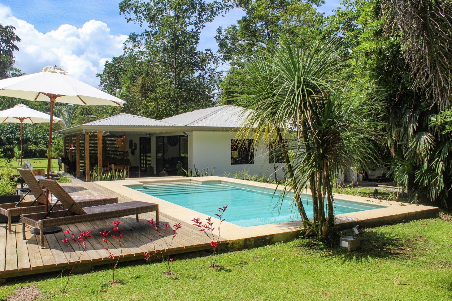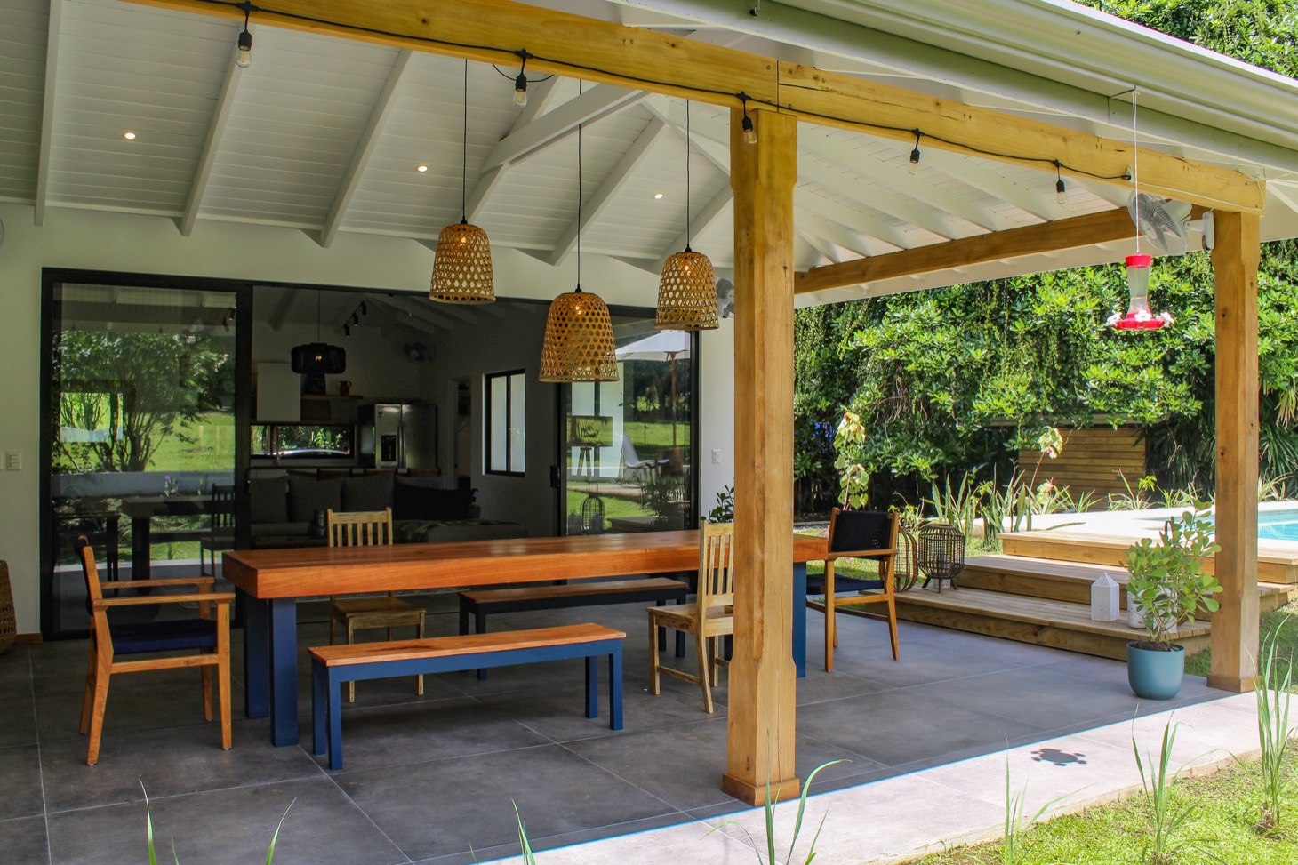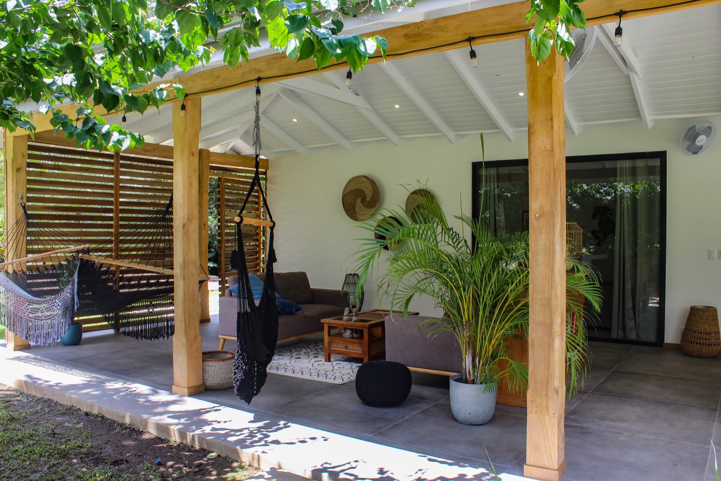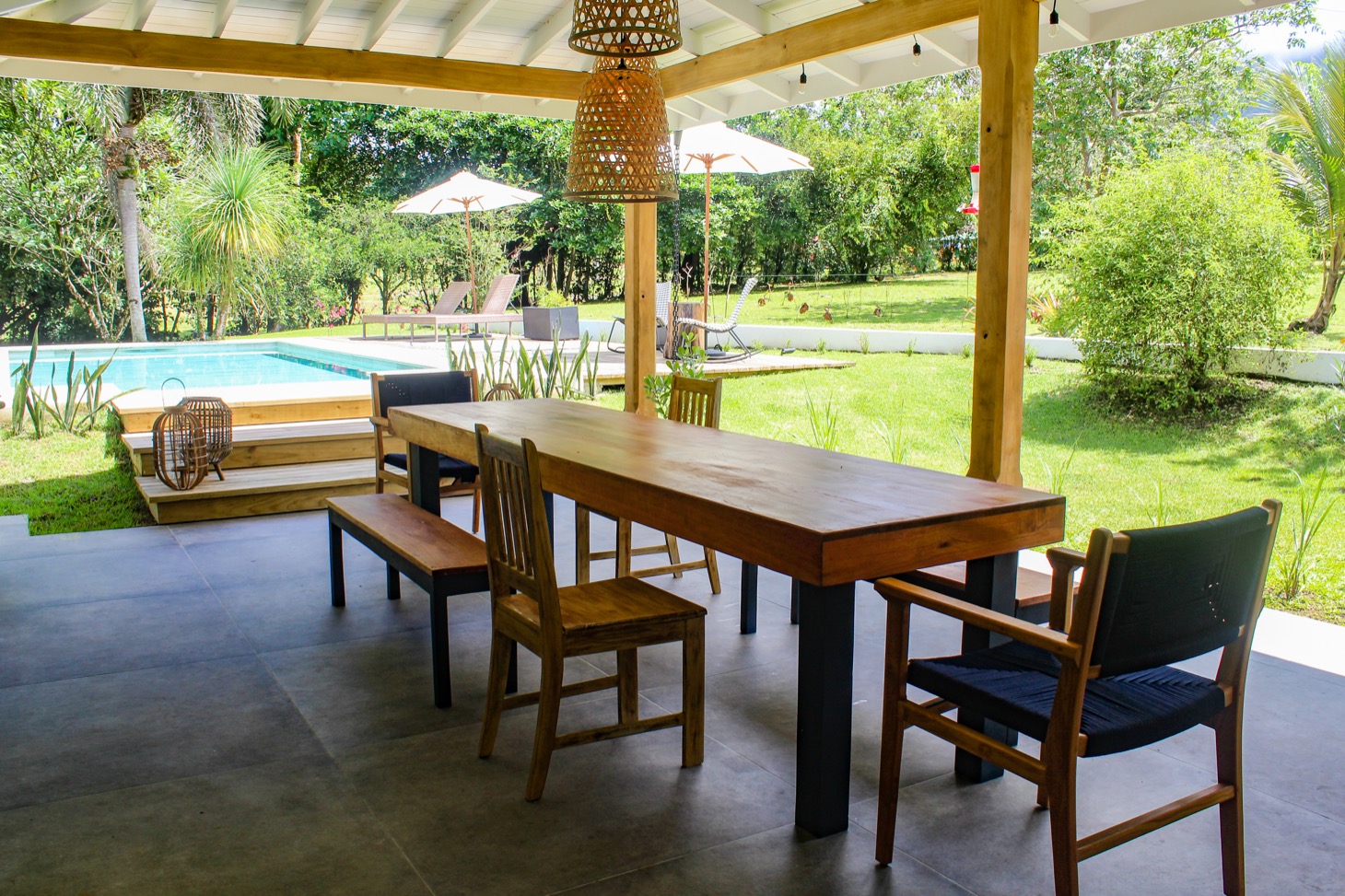 This boho-chic home combines the clean lines and muted color palette of contemporary design with exotic hardwoods native to this region for a simple architectural complement to the colorful tropical landscape surrounding this home. The décor creates a harmonious environment through which to experience the exhilaration of nature’s wonders, both inside and out. This home is a truly divine retreat! The highlight of this home is the simply gorgeous living spaces, with a spacious indoor living room that flows directly out to the huge, covered terrace which is luxuriously furnished. The outdoor living space with its’ large pool and deck is a wow factor!
