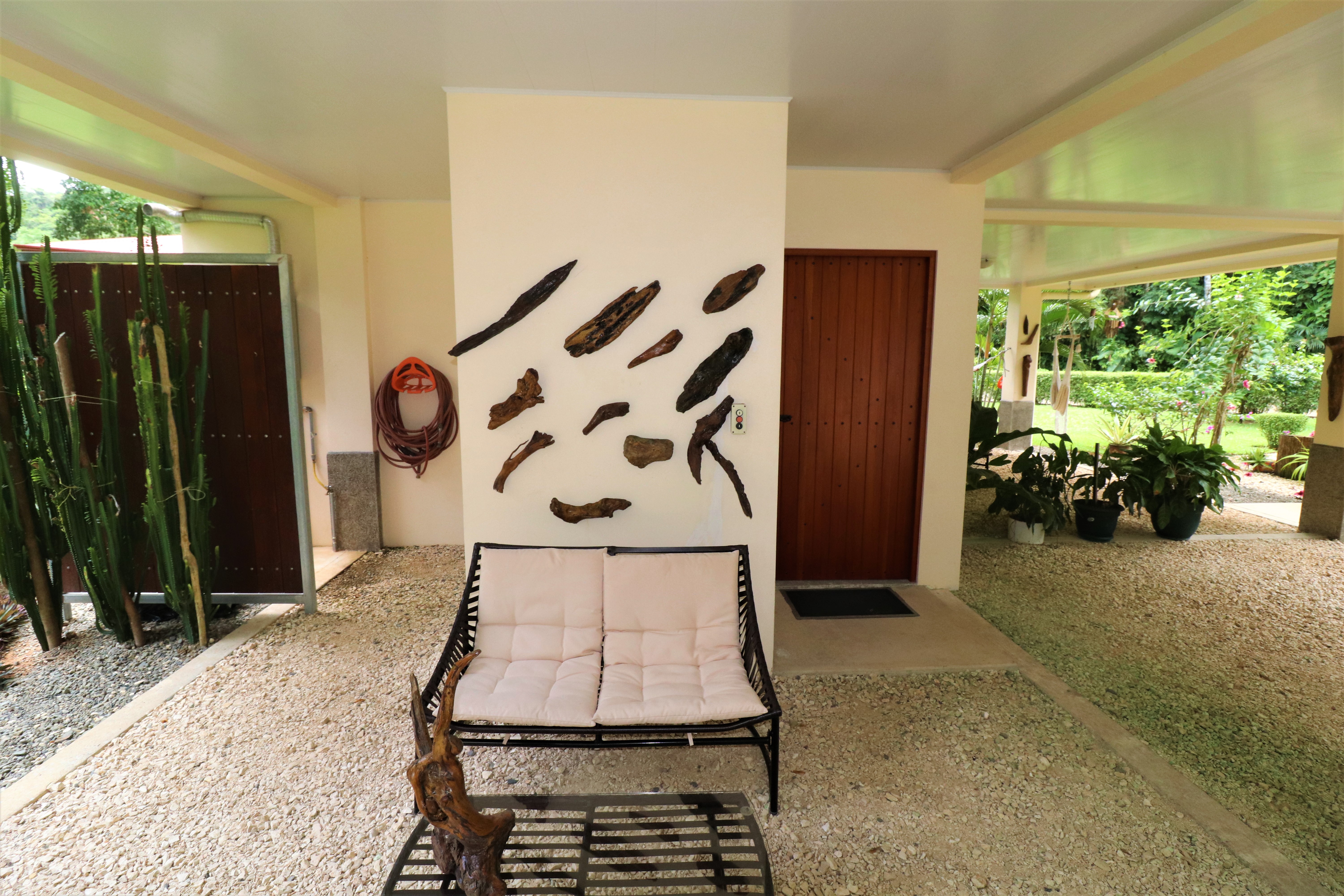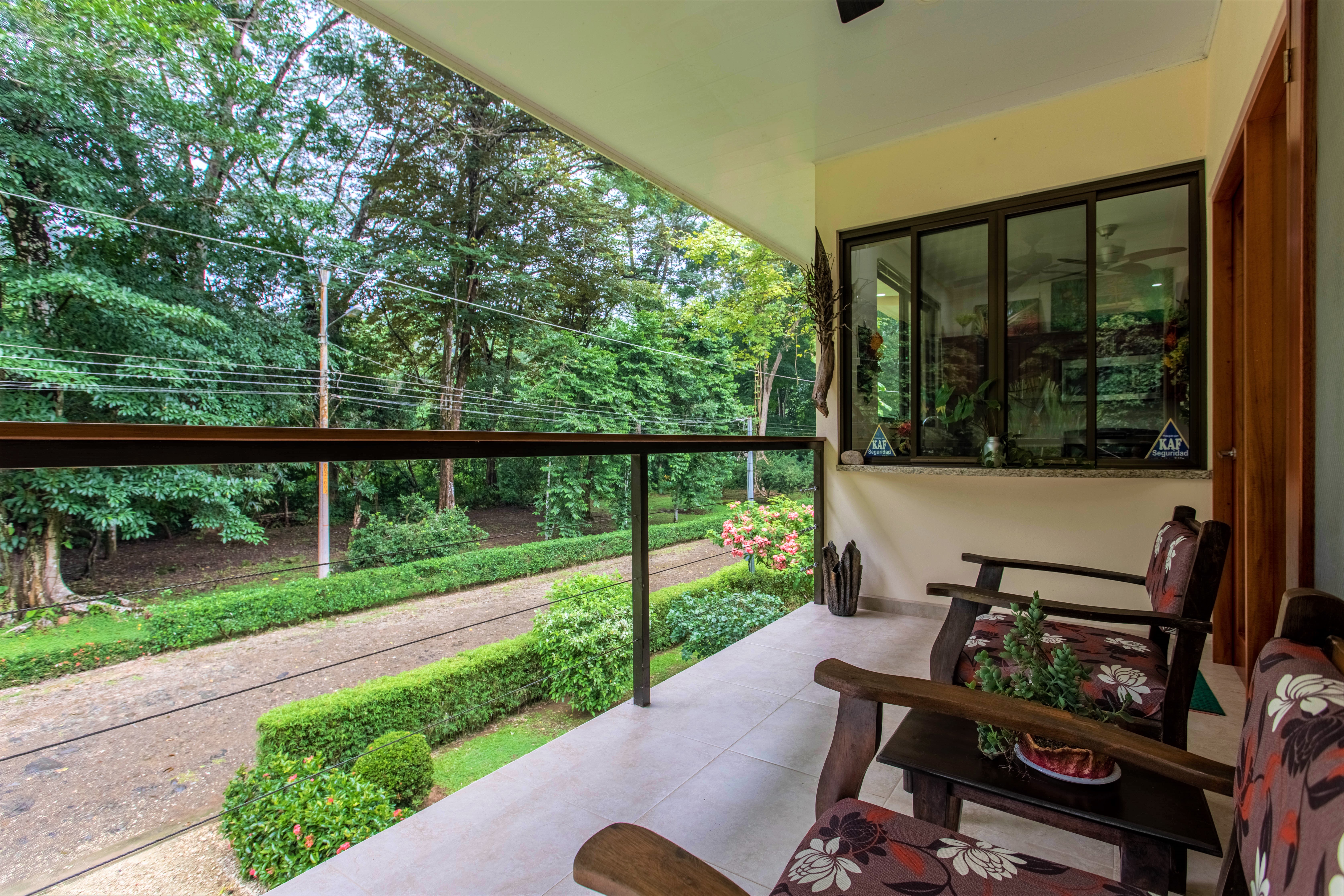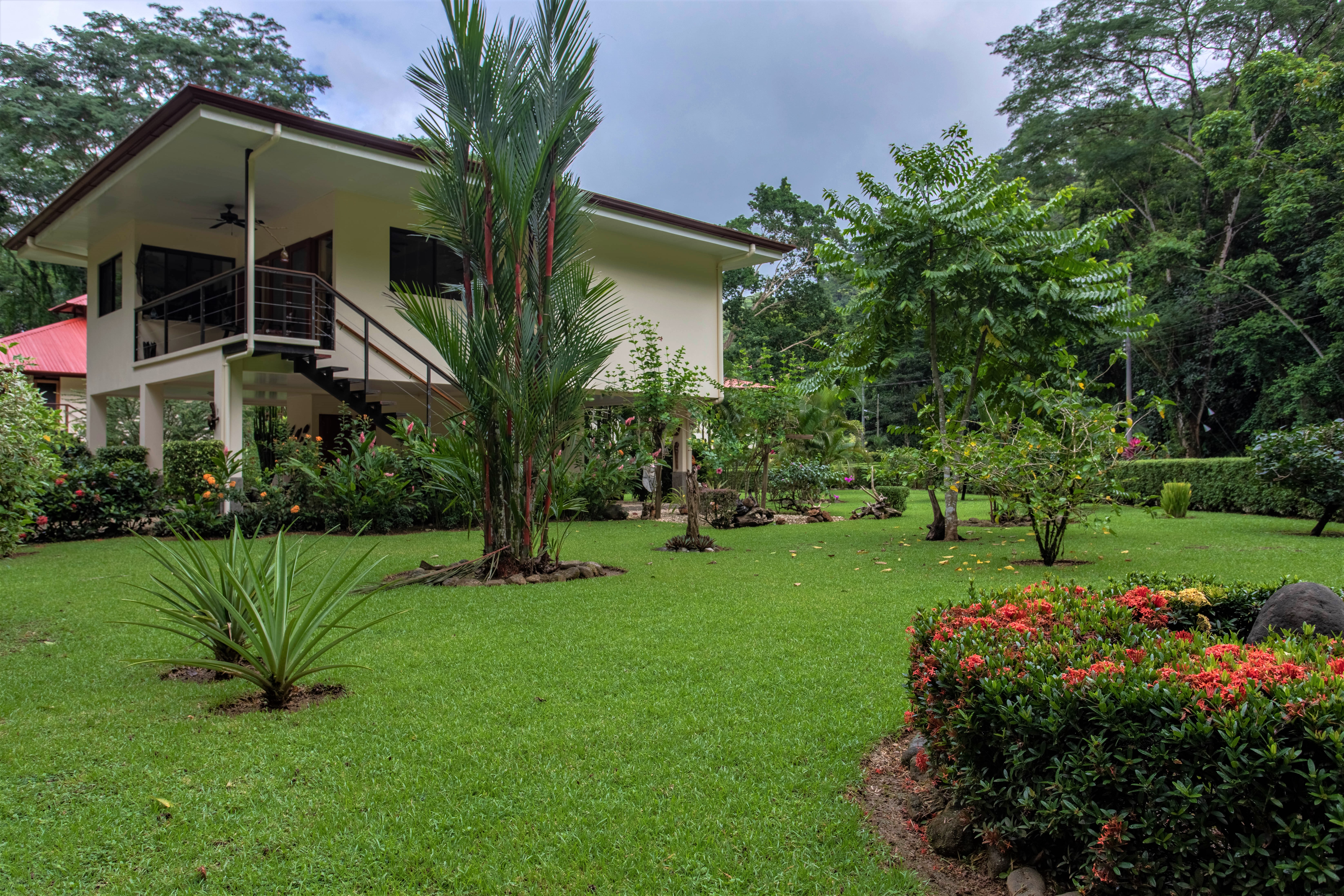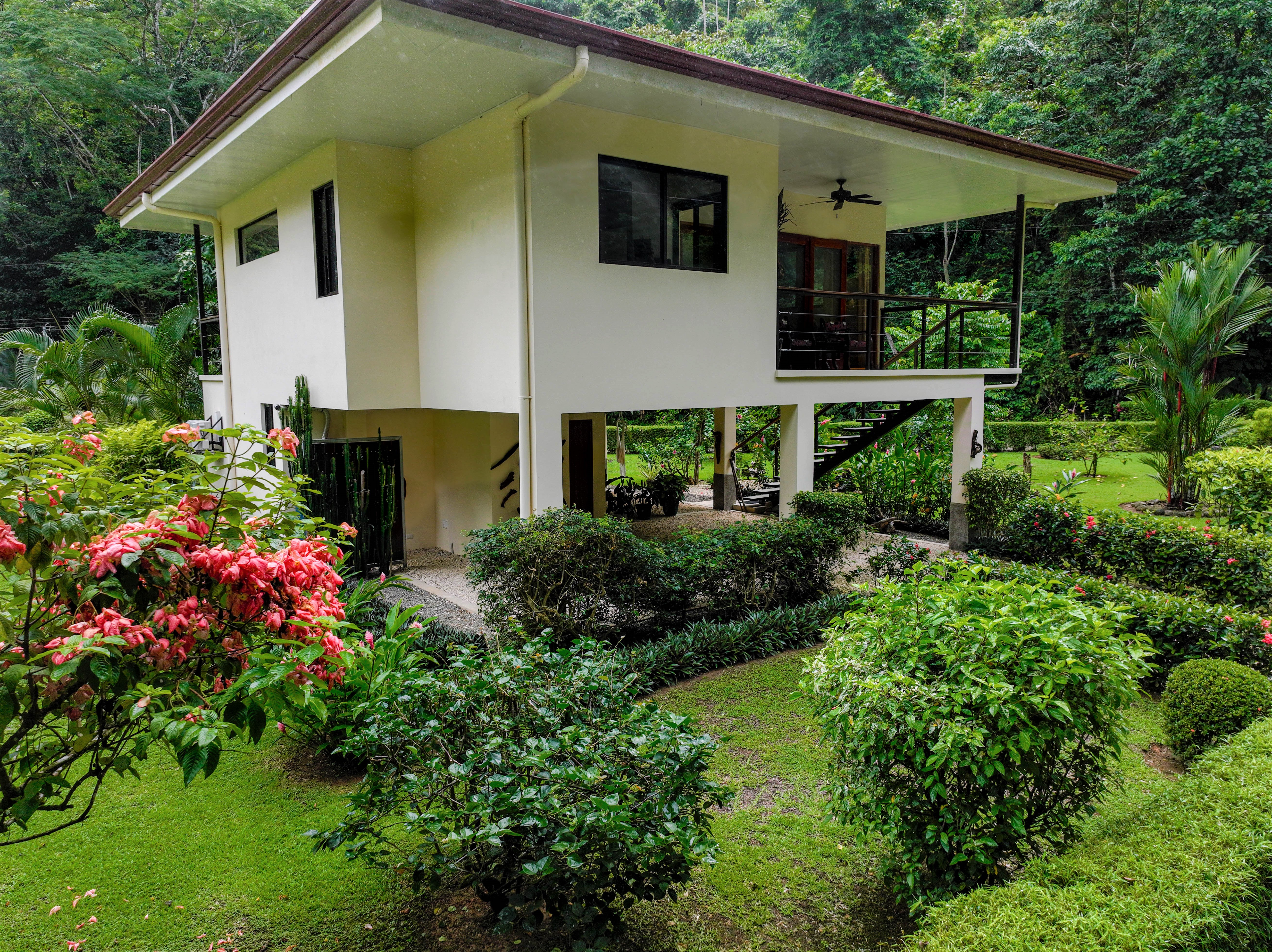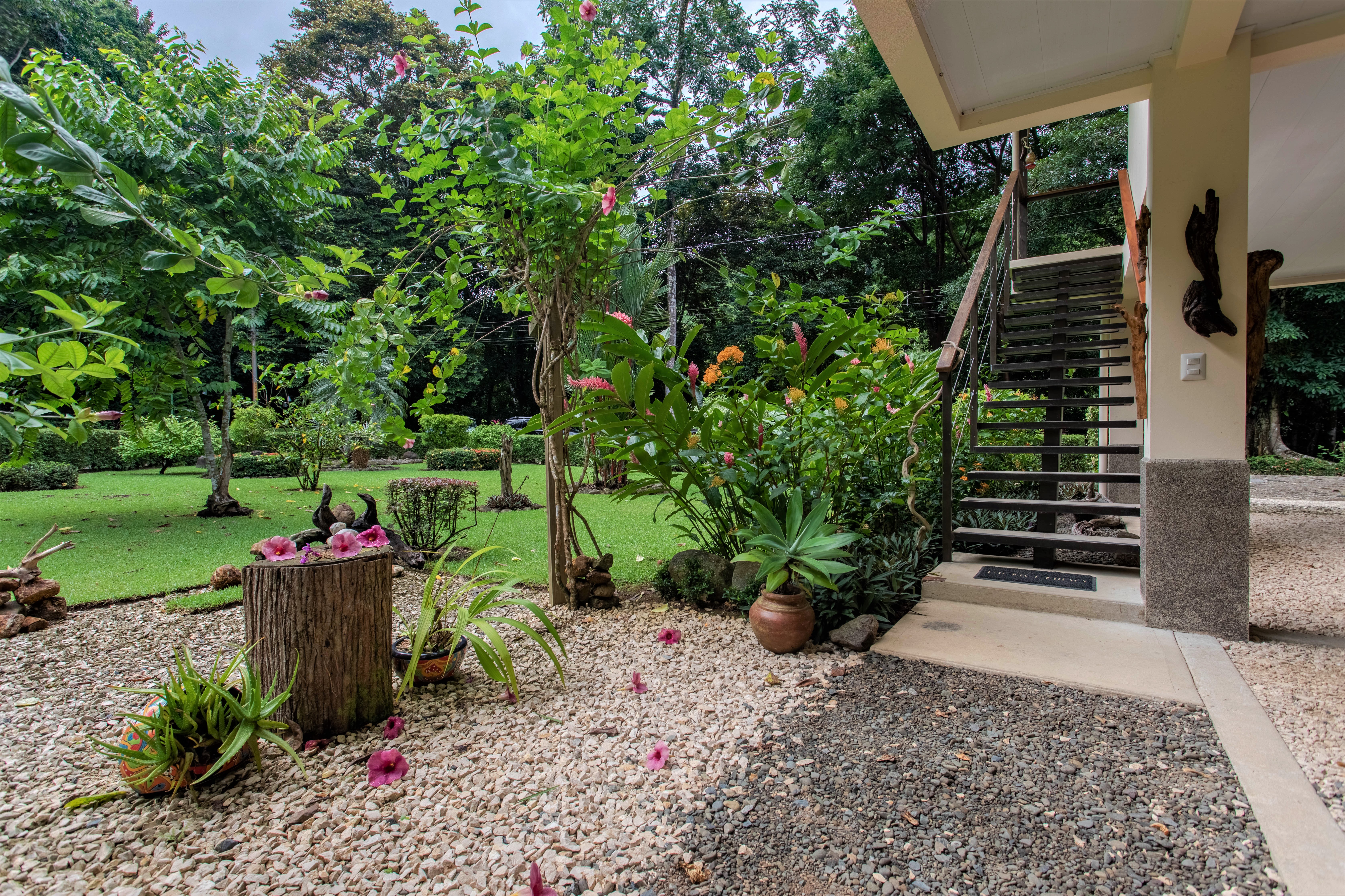 The jungle begins on the other side of the road and surrounds the house, on three sides, with monumental trees including several Guanacaste trees (national tree of Costa Rica). You can observe all kinds of tropical birds, butterflies, and animals straight from your home or from the hiking trails that start very close to the property.