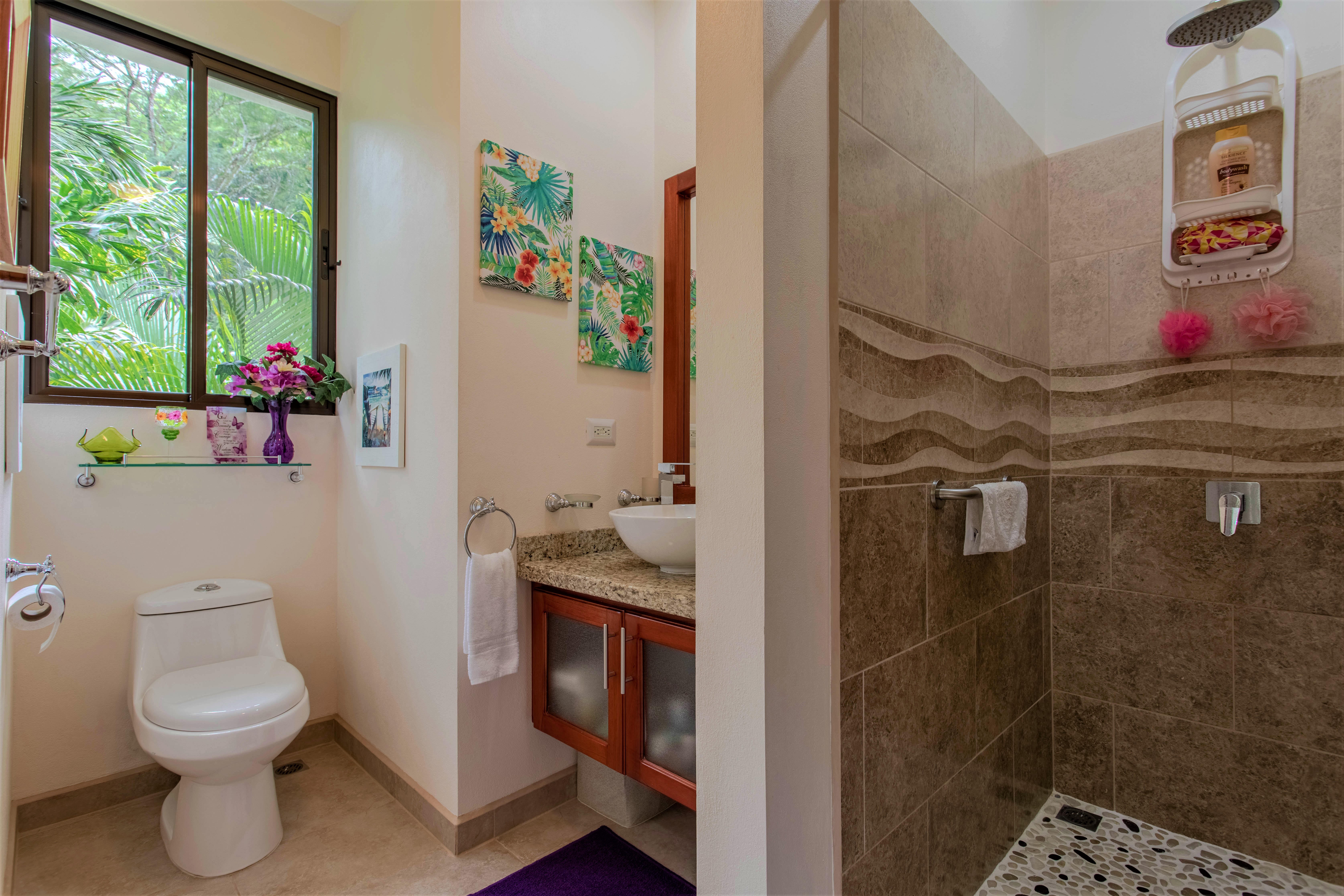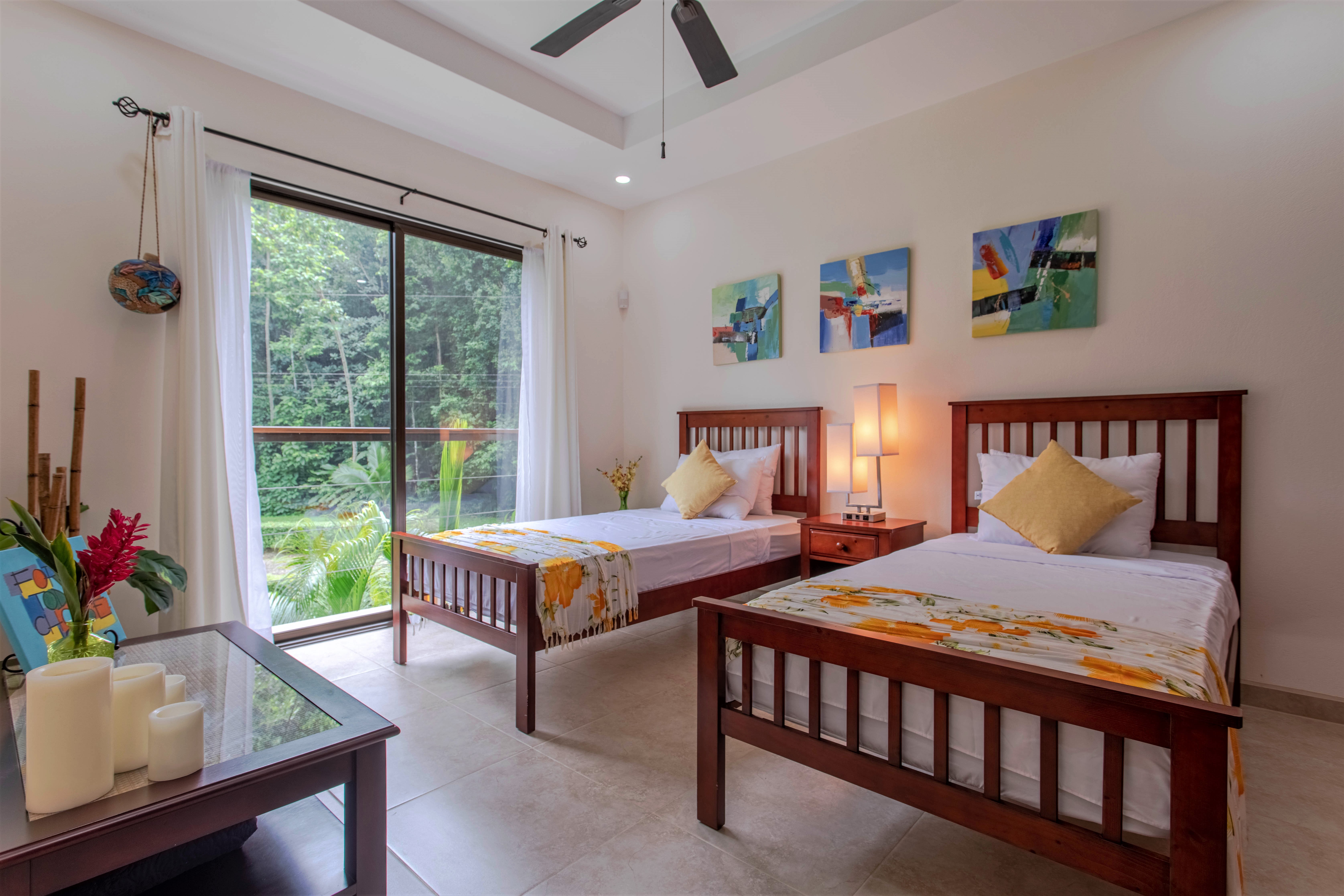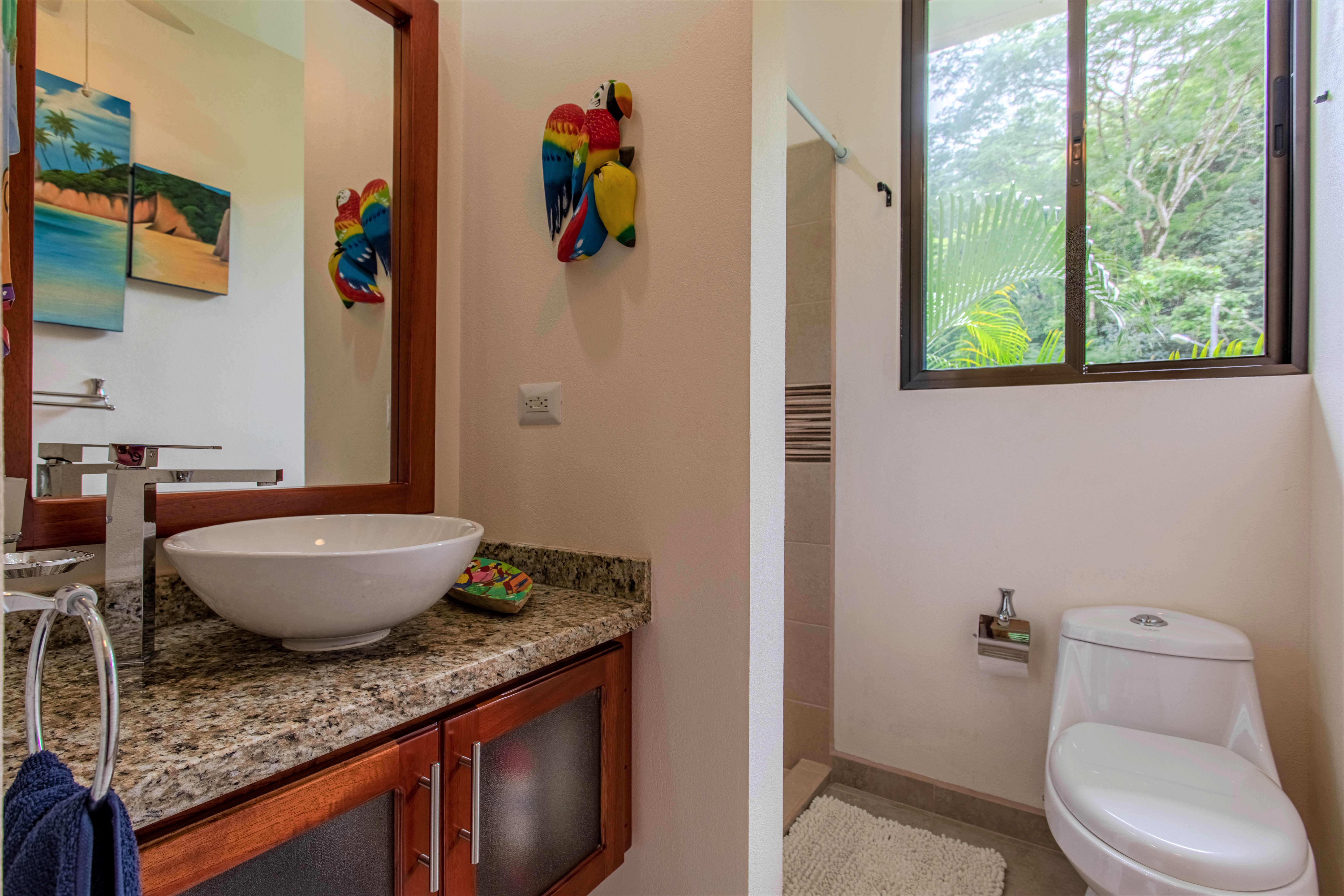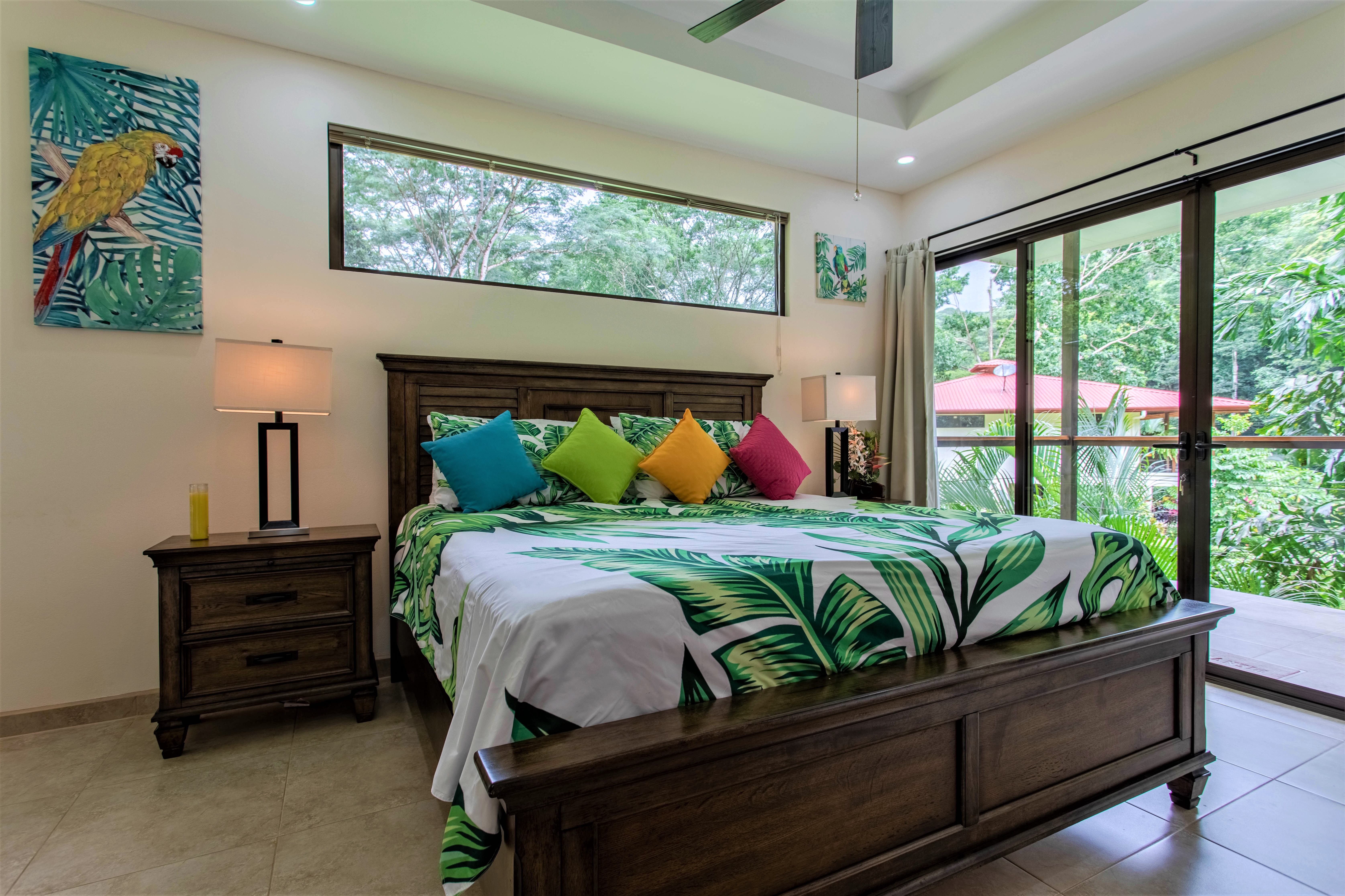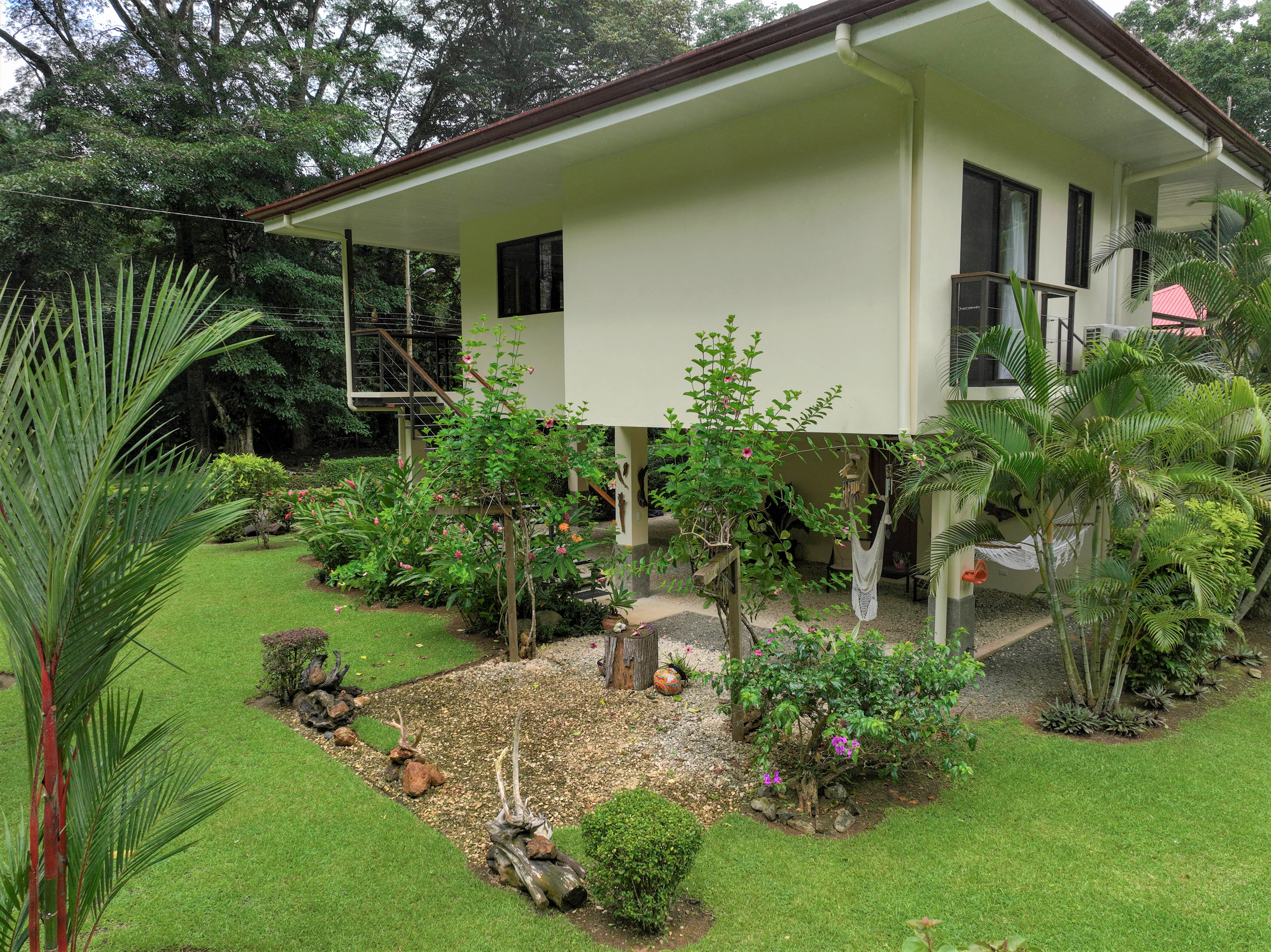 The jungle begins on the other side of the road and surrounds the house, on three sides, with monumental trees including several Guanacaste trees (national tree of Costa Rica). You can observe all kinds of tropical birds, butterflies, and animals straight from your home or from the hiking trails that start very close to the property.