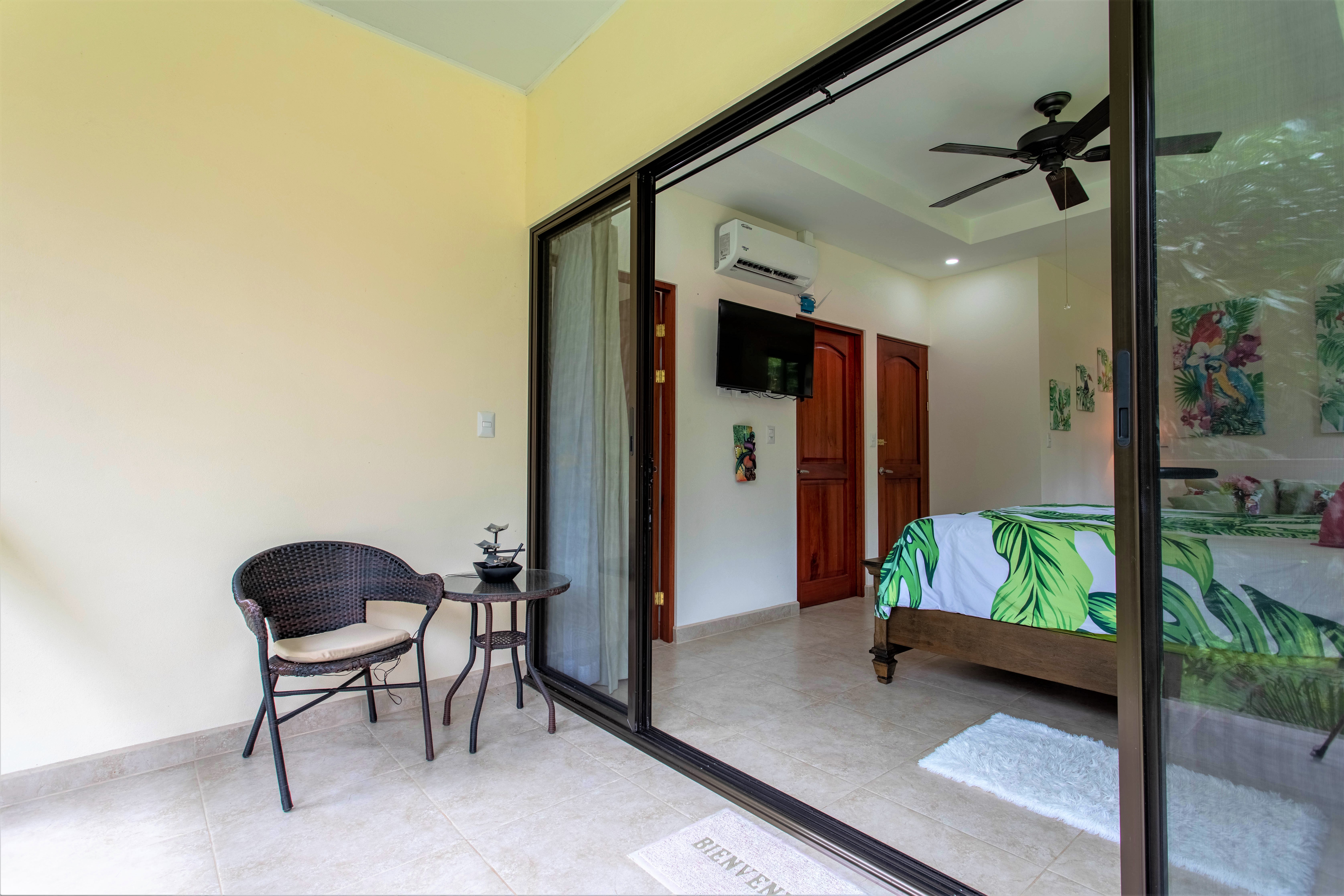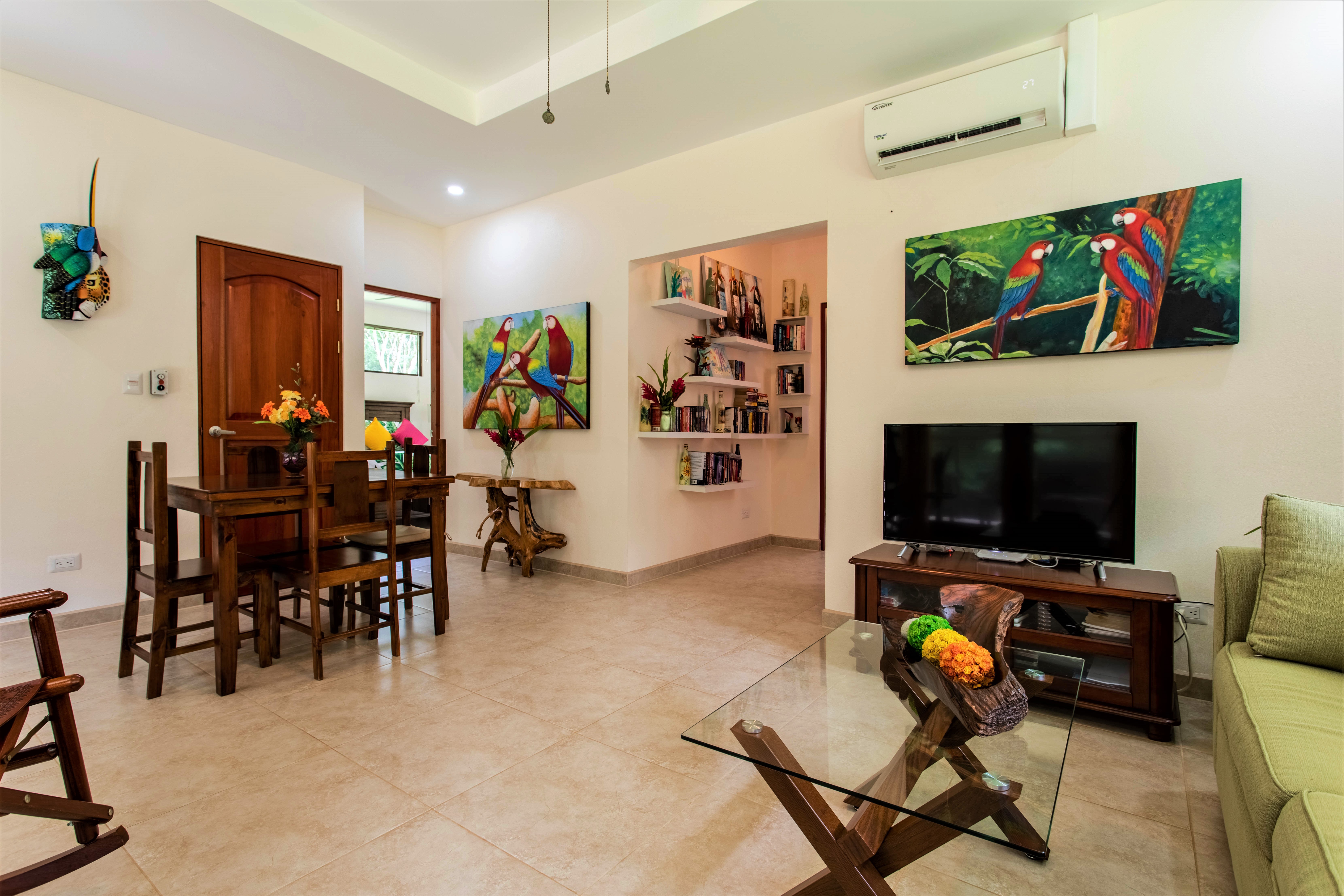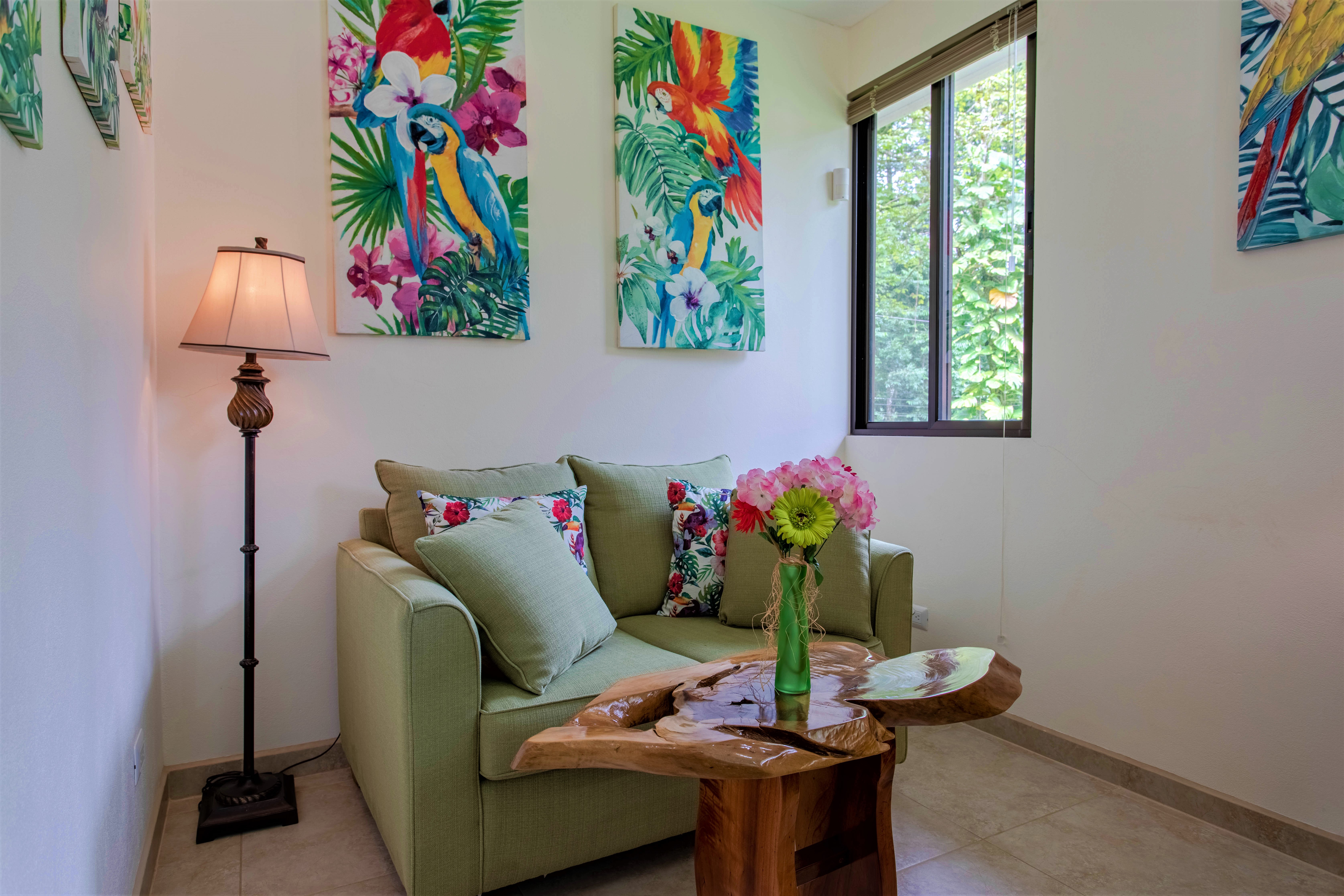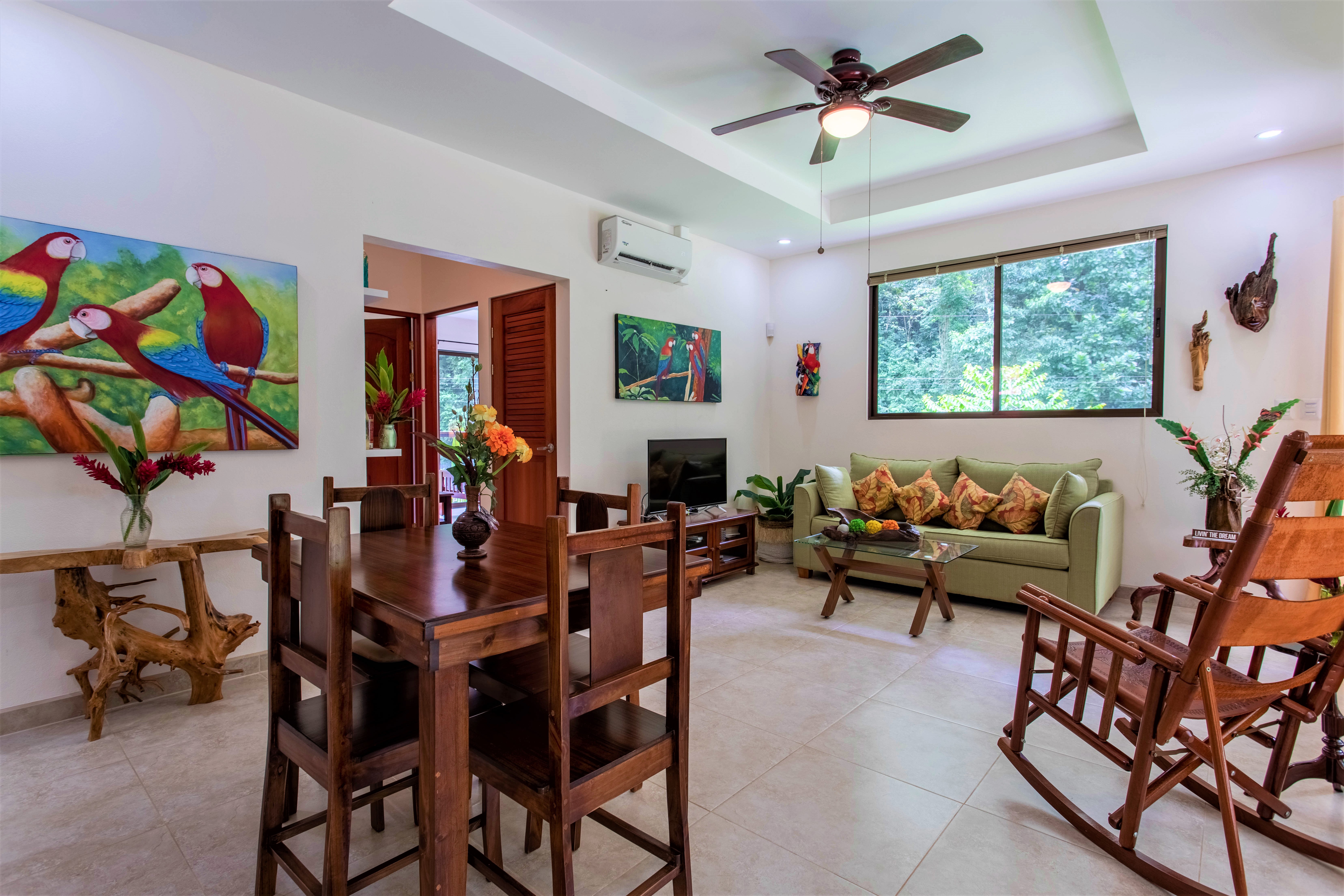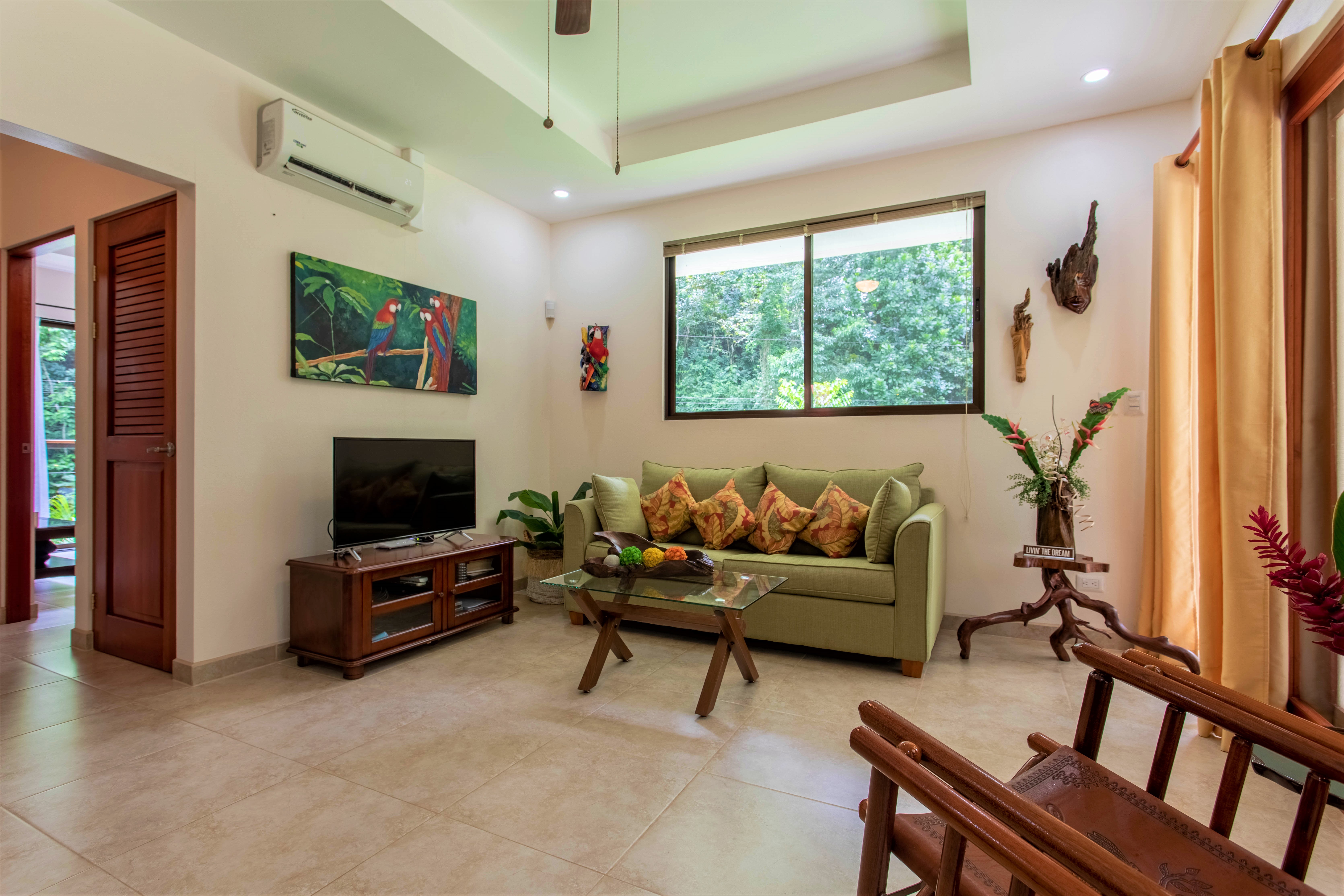 The living room gives jungle views all around, while the wide full-length patio glass door enlarges the space and, when opened, merges the living room with the patio and the nature outside.