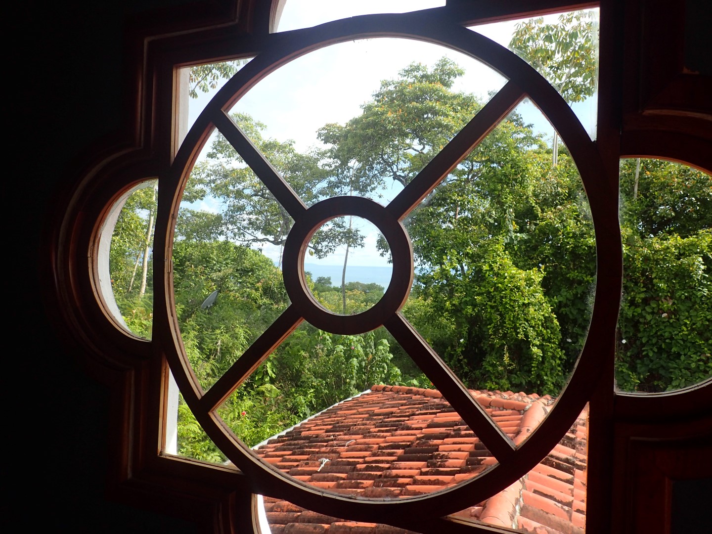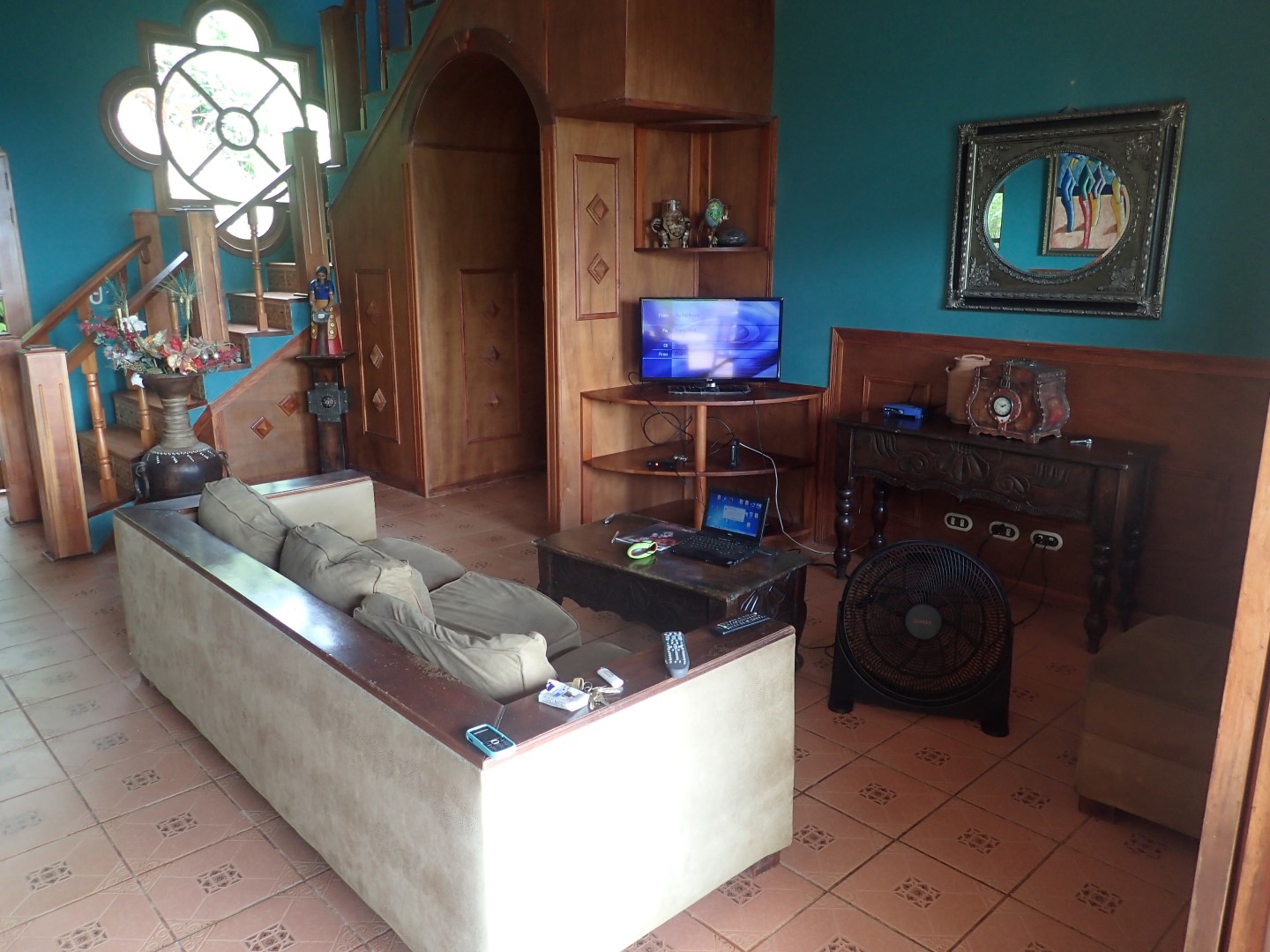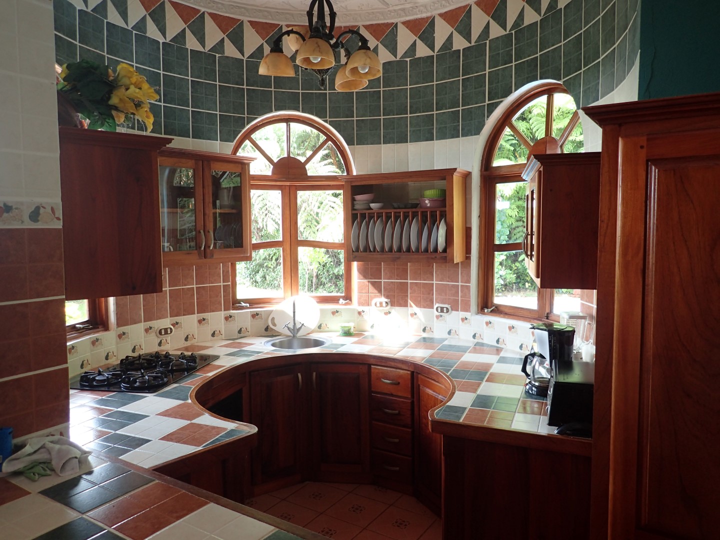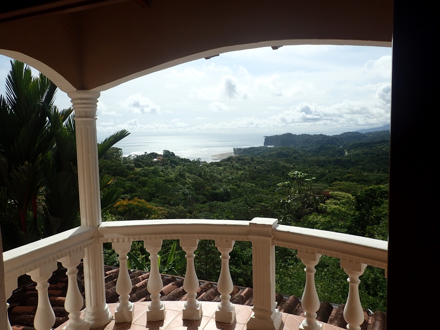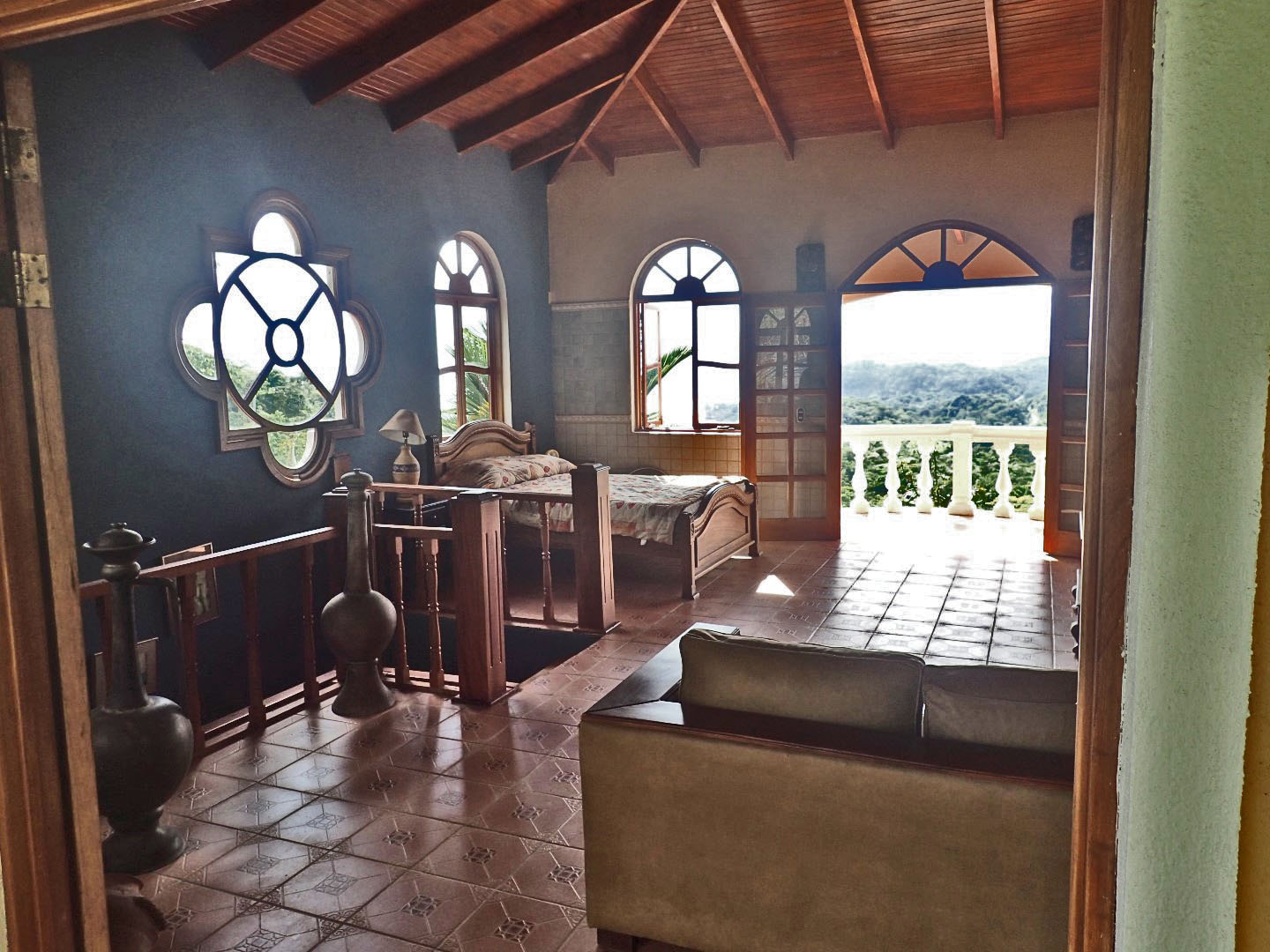 Pull into the garage and walk up the stairs onto one of the front porches and you'll stop right there for a few moments to look out over the Pacific Ocean clear up to Manual Antonio. Then go on inside and you'll be in a kitchen/dining/living area that has creative touches throughout. There is an old world look to it all, with the arched doors, celtic style windows high on the walls, patterned ceiling tiles, and curved wooden staircase.