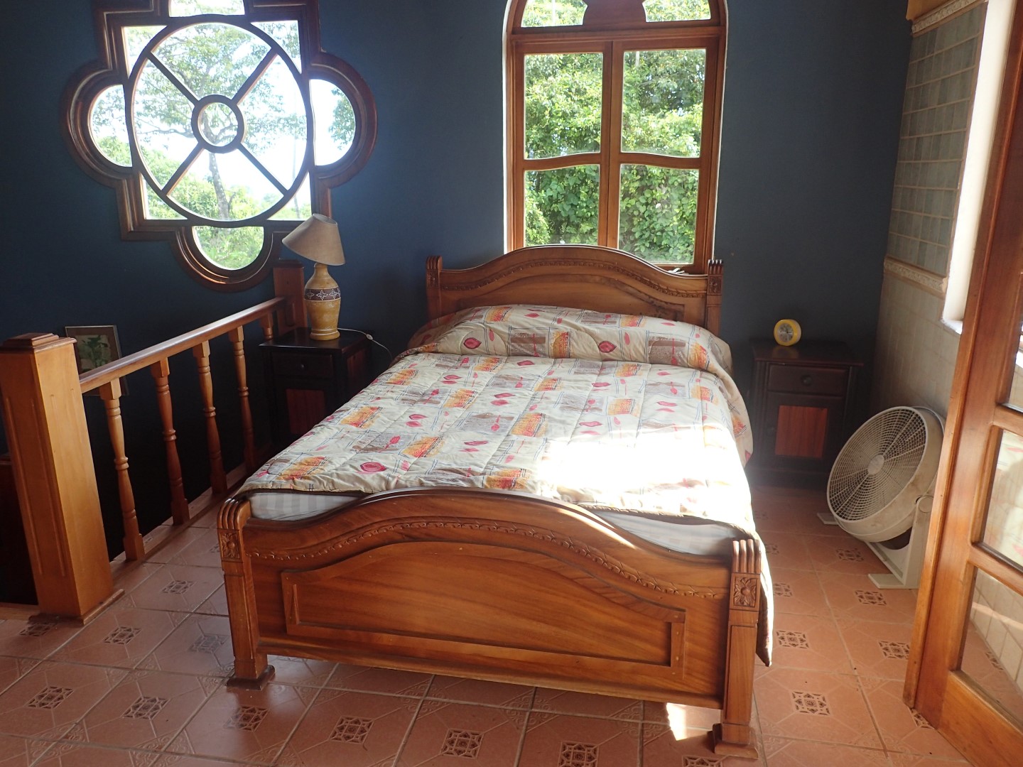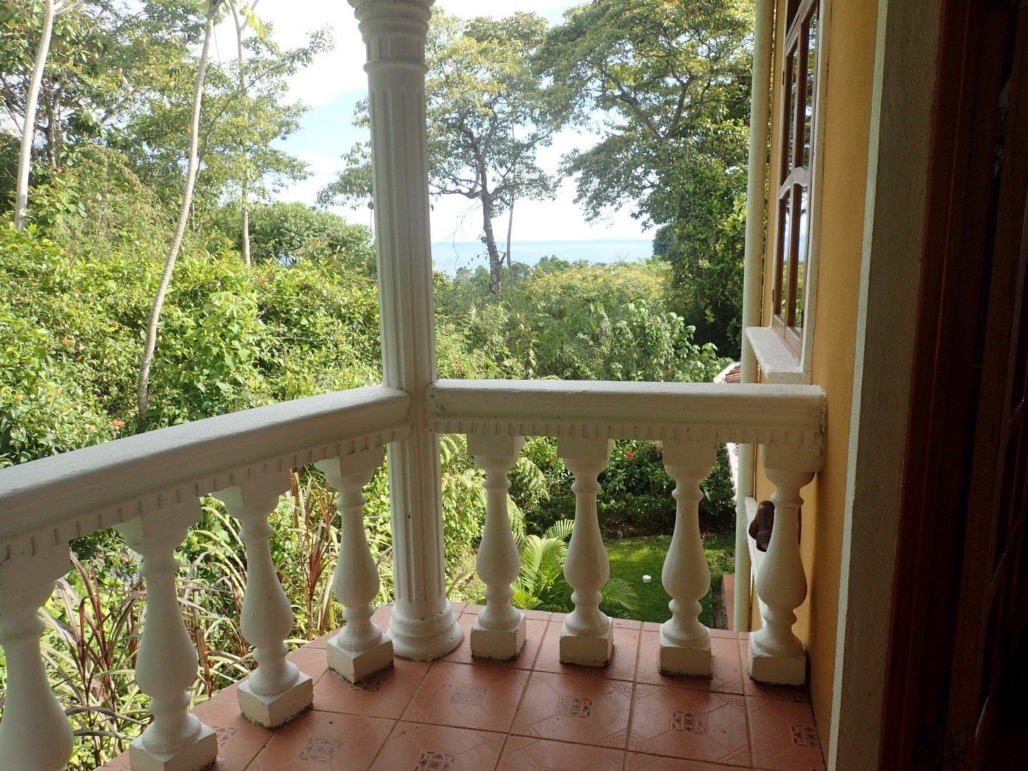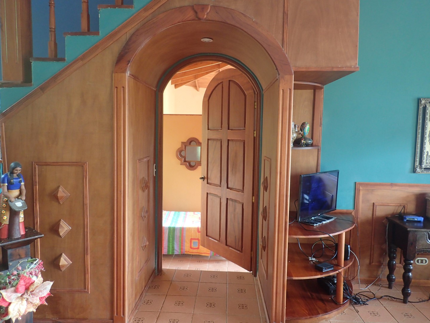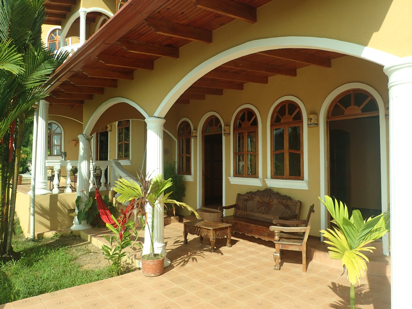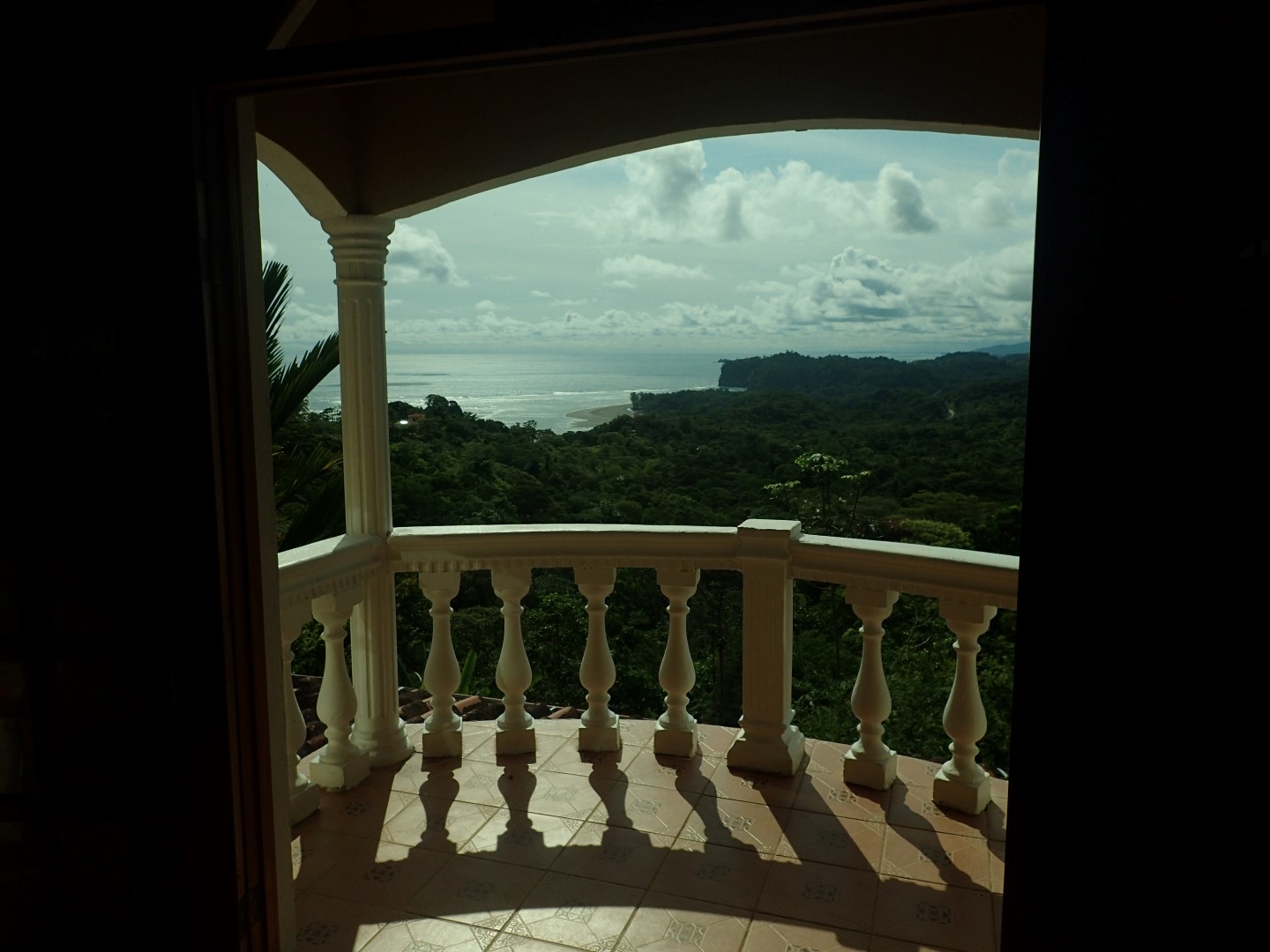 Pull into the garage and walk up the stairs onto one of the front porches and you'll stop right there for a few moments to look out over the Pacific Ocean clear up to Manual Antonio. Then go on inside and you'll be in a kitchen/dining/living area that has creative touches throughout. There is an old world look to it all, with the arched doors, celtic style windows high on the walls, patterned ceiling tiles, and curved wooden staircase.