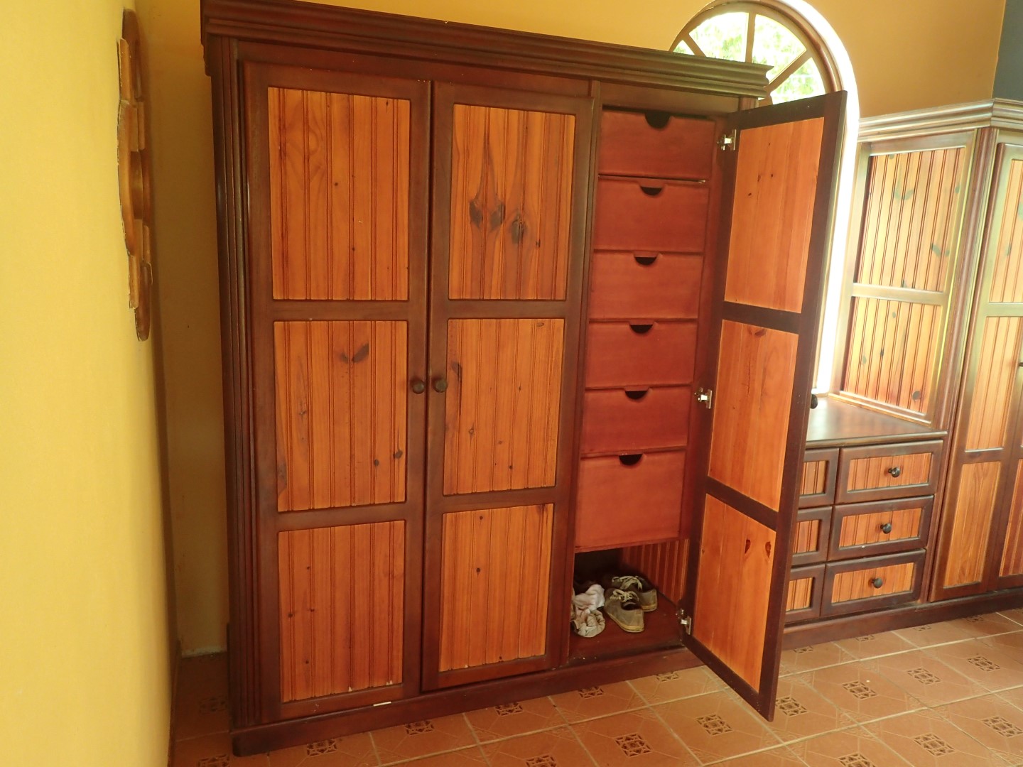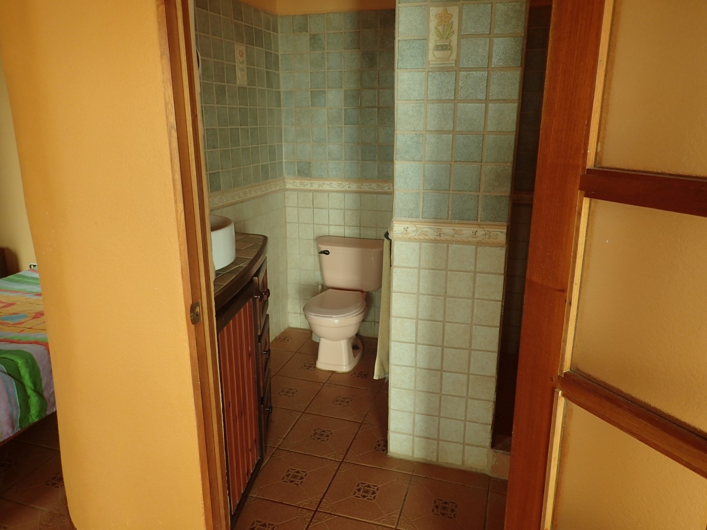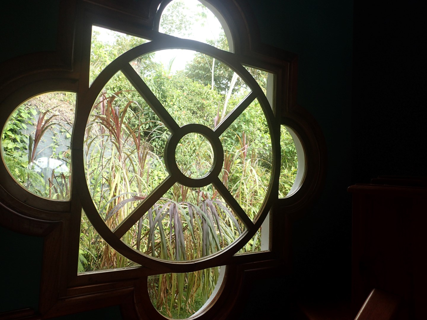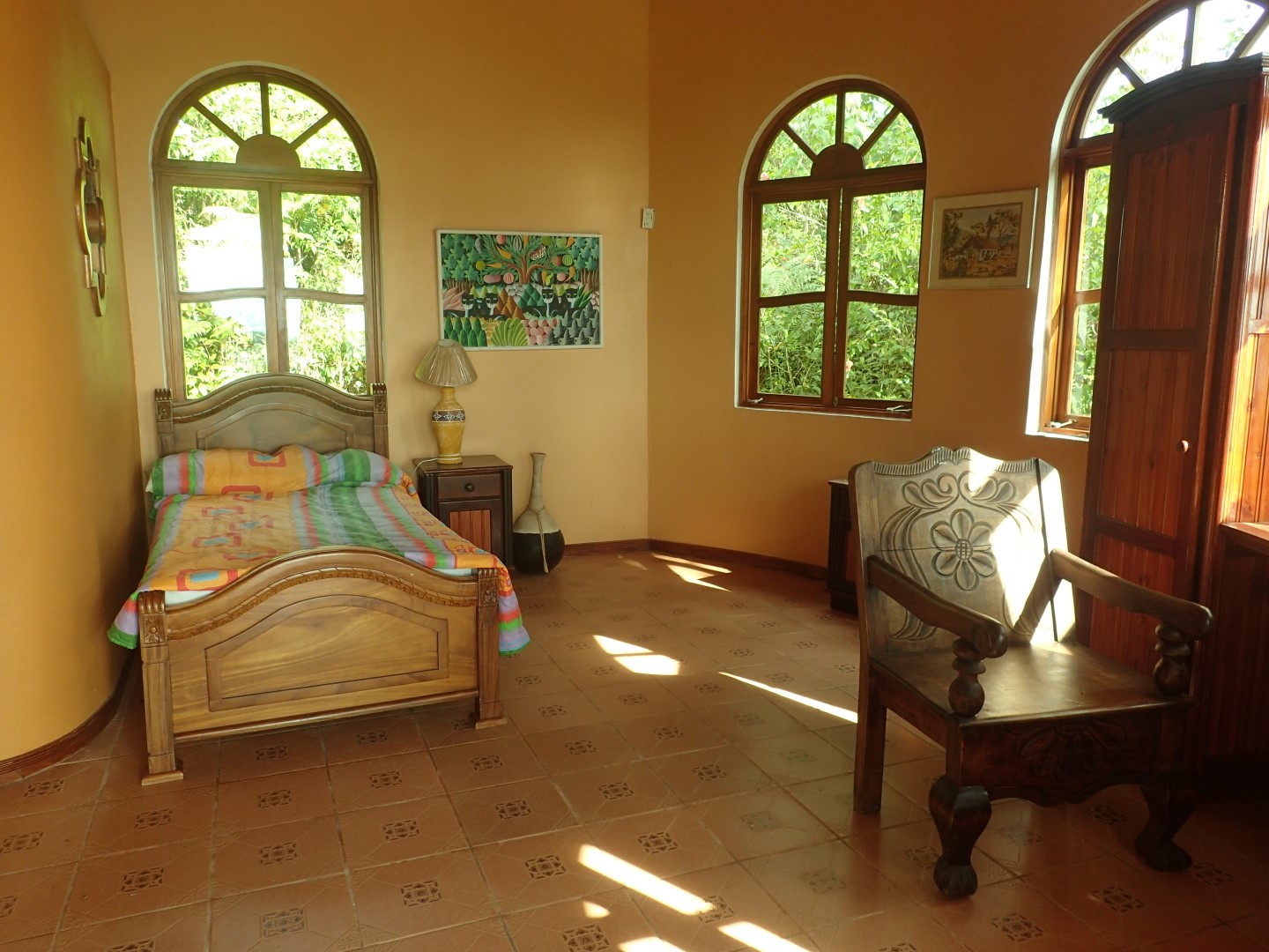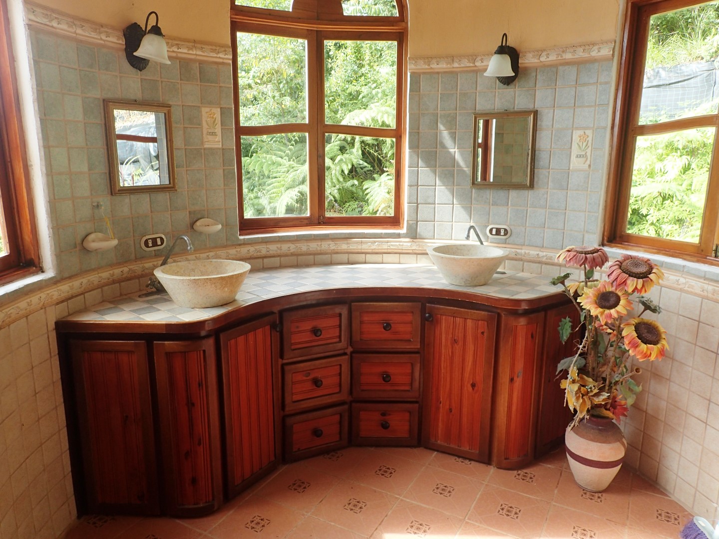 Pull into the garage and walk up the stairs onto one of the front porches and you'll stop right there for a few moments to look out over the Pacific Ocean clear up to Manual Antonio. Then go on inside and you'll be in a kitchen/dining/living area that has creative touches throughout. There is an old world look to it all, with the arched doors, celtic style windows high on the walls, patterned ceiling tiles, and curved wooden staircase.