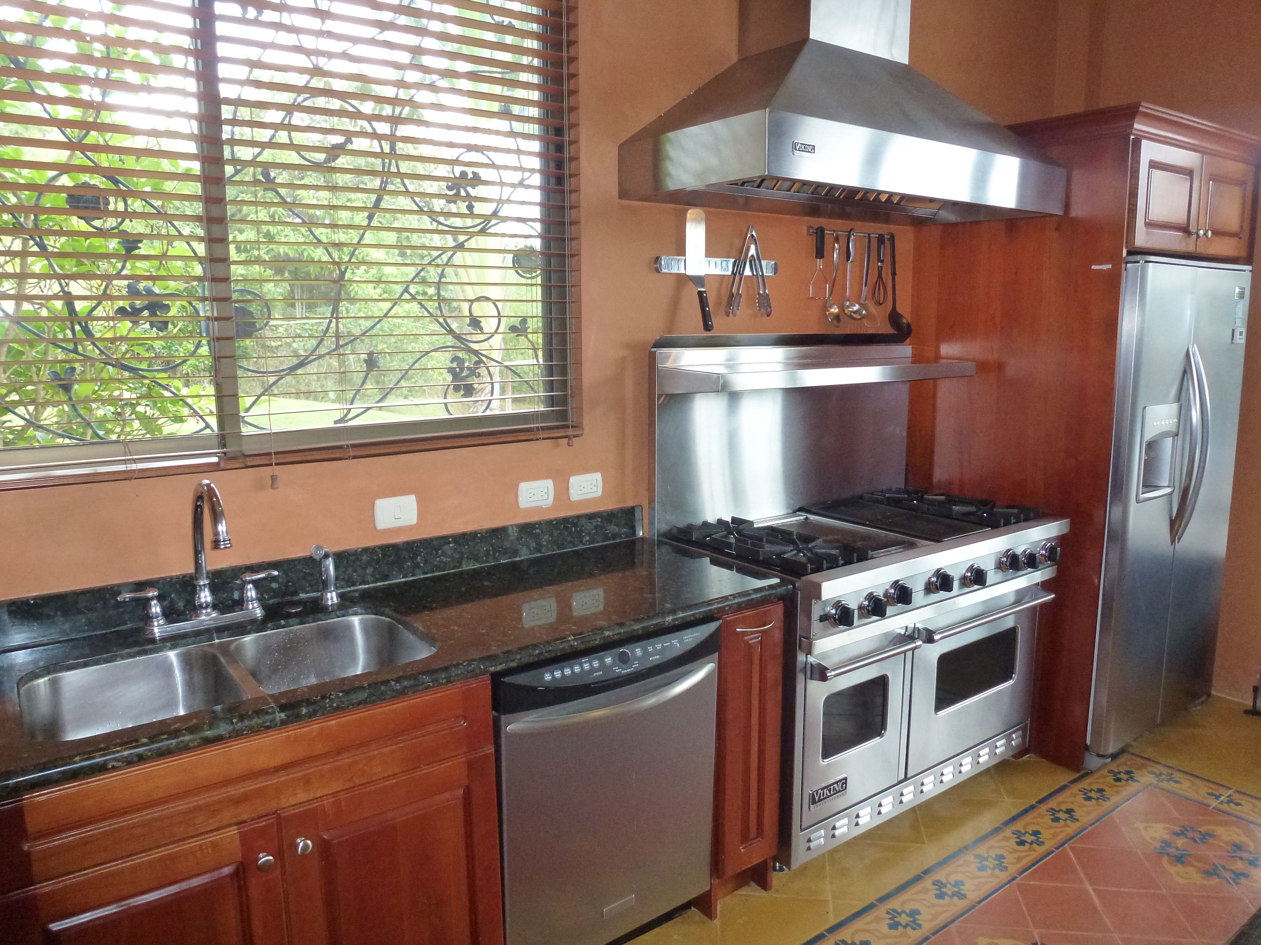 The professional gourmet kitchen features a Viking stove with two ovens, 4 burners, a gas grill, and a griddle. The kitchen is equipped with granite countertops, double sink, and an island with a full bar and separate prep sink.